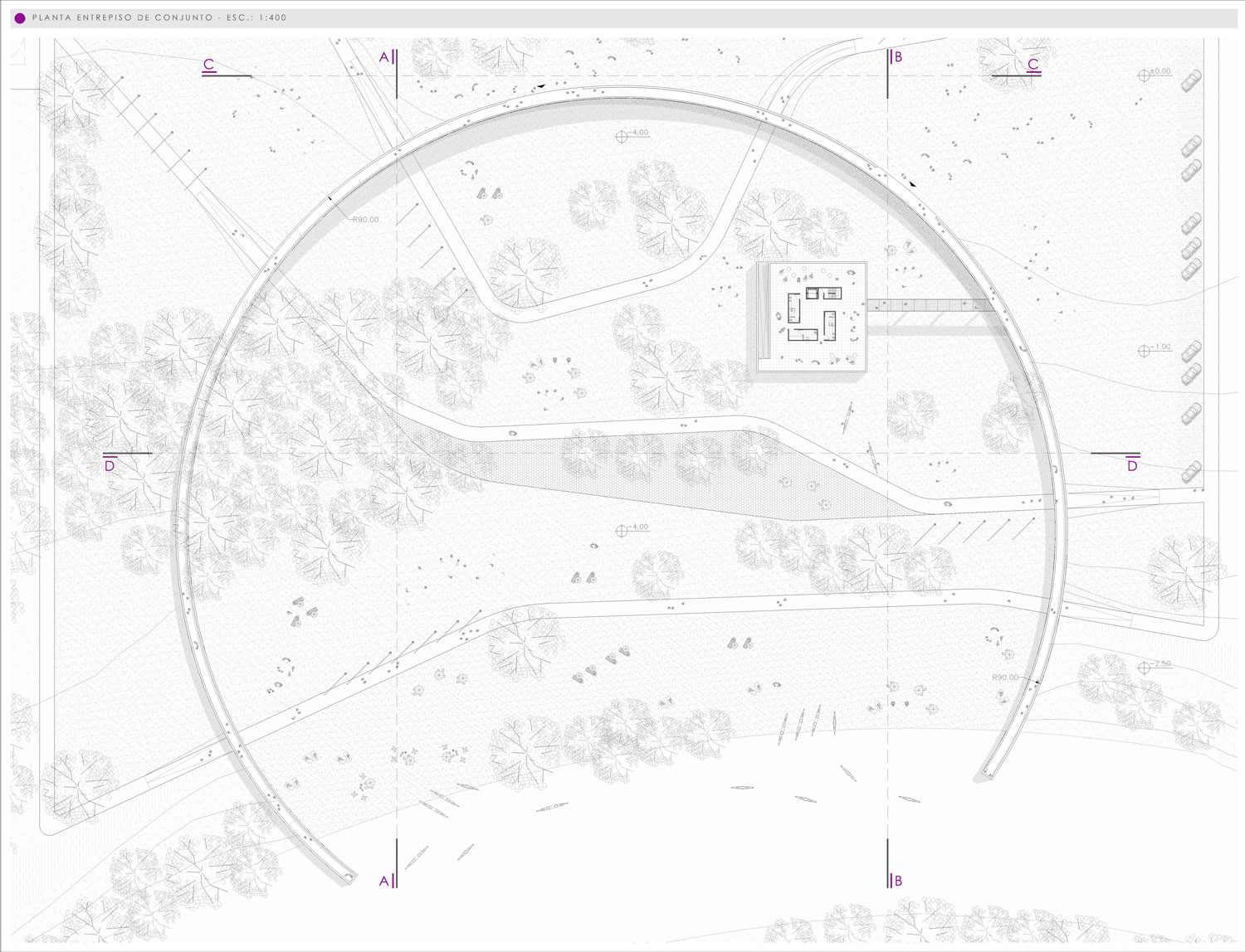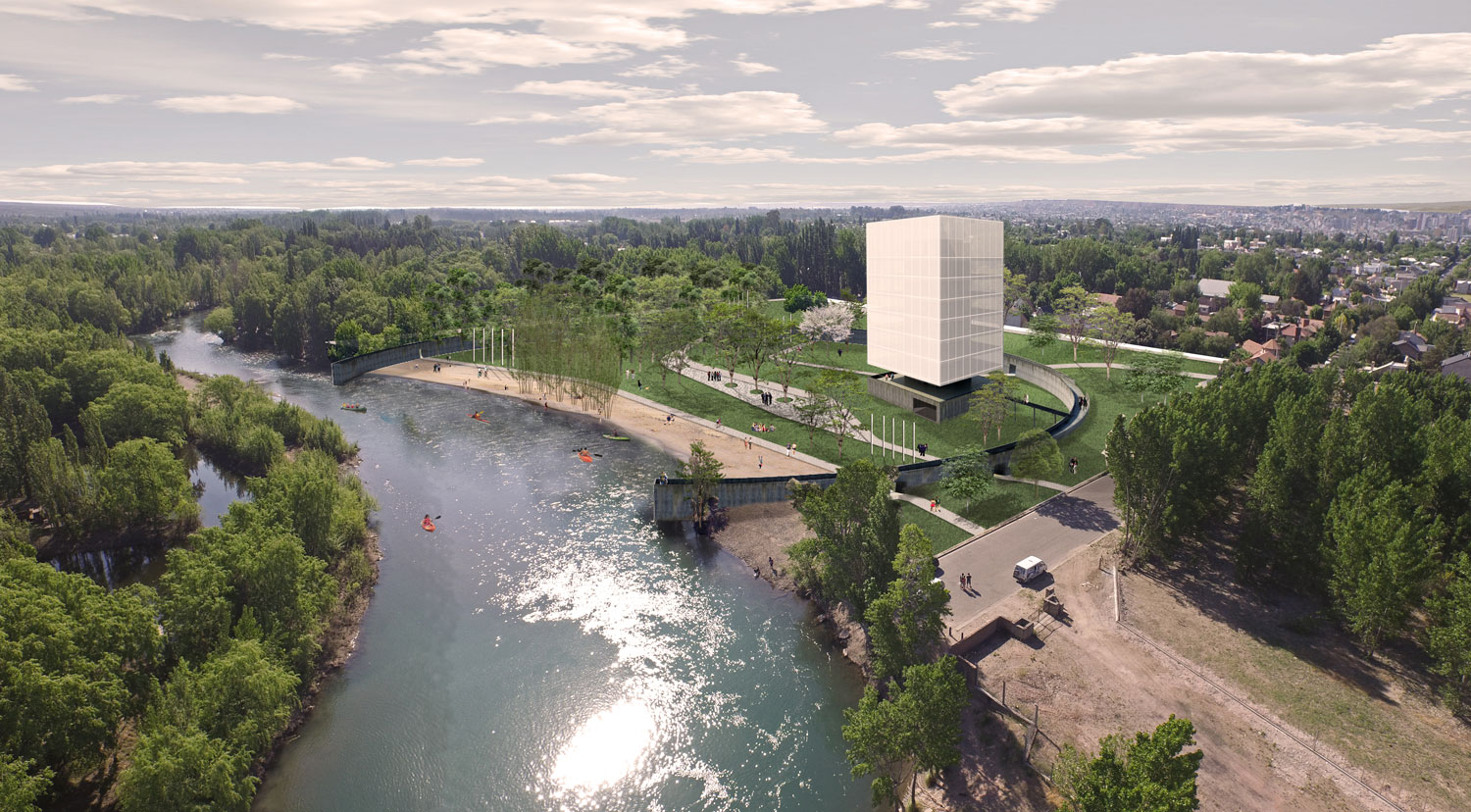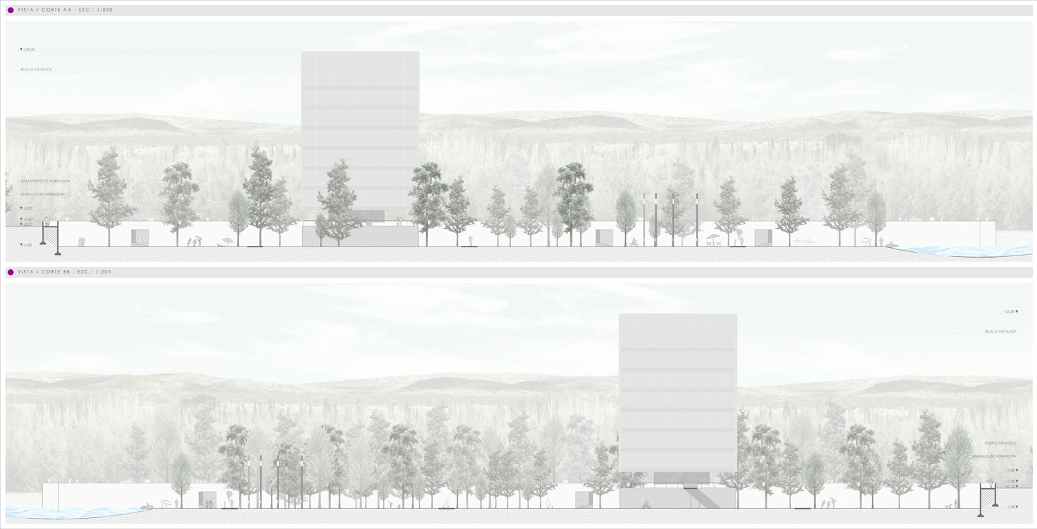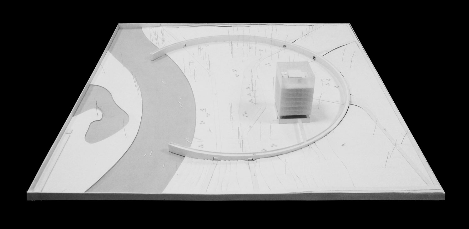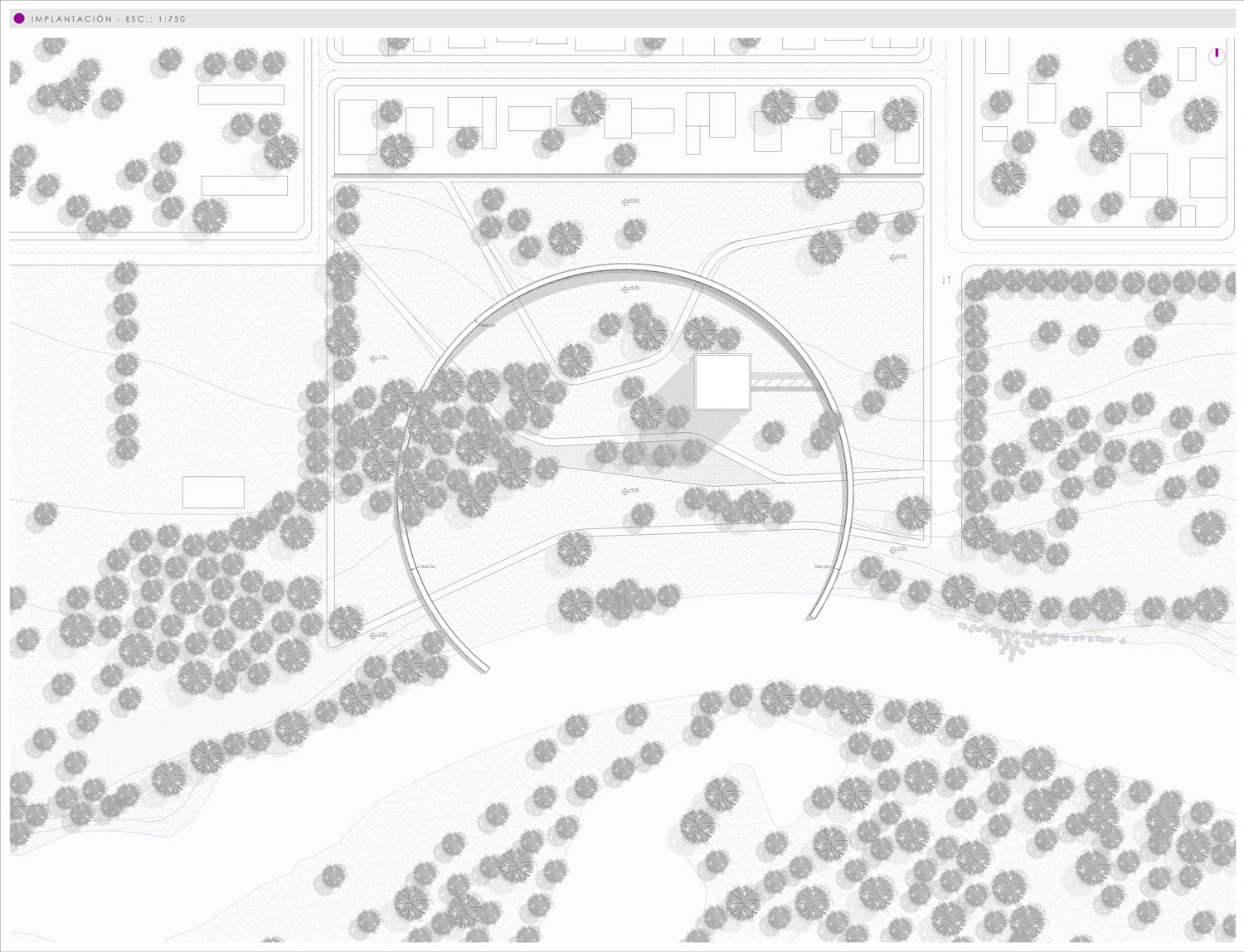 La propuesta es una operación en la topografía del sitio que contrasta estos dos estratos, al río y a la ciudad. Se trata de un cambio de nivel cuyo interés proyectual es crear un espacio central, público y al aire libre, materializado por una muralla de contención de forma circular, que también contempla las crecidas del río generando, en épocas de crecidas, una laguna natural controlada. Así, el nivel superior, brinda una visual del conjunto y su entorno inmediato mientras que el nivel inferior direcciona las visuales hacia si mismo en un paisaje controlado por la muralla, que solo se abre sobre al sur, a la visión profunda del río. Los requerimientos funcionales se ubican en una torre, la cual al alzarse por sobre las copas de los árboles, con un cerramiento permeable, permite alcanzar otros puntos de vistas, como son las visuales lejanas del valle y la barda. La extensión del lote y sus diferentes situaciones naturales, explanadas, bosques y orillas quedan intactas y se aprovechan mediante senderos sinuosos, que dialogan entre los dos estratos, para promover la circulación y la contemplación del paisaje.