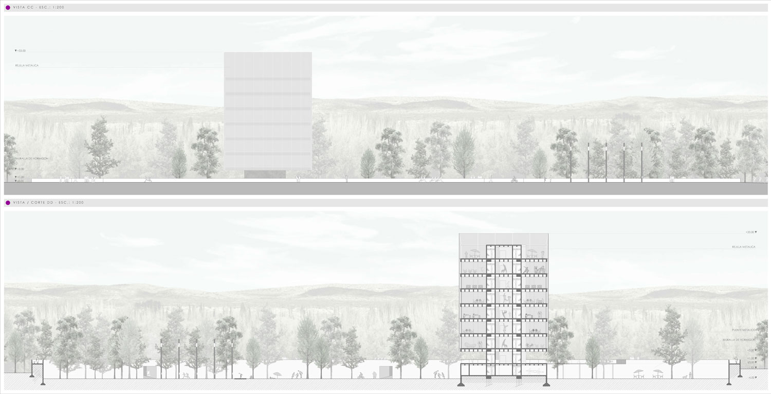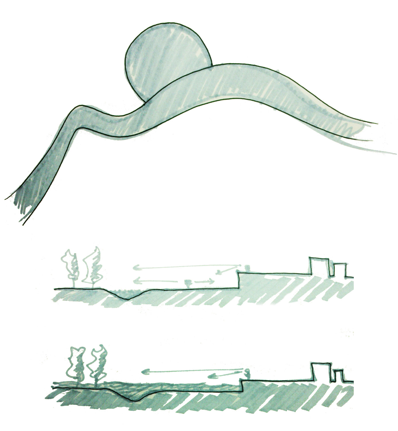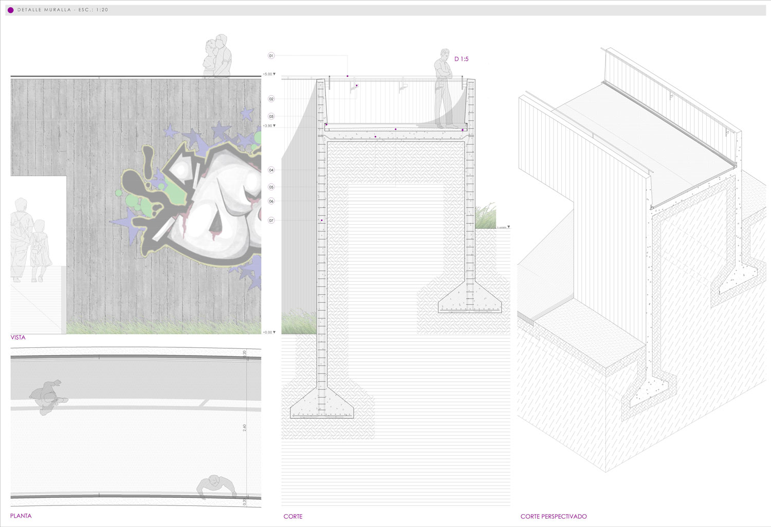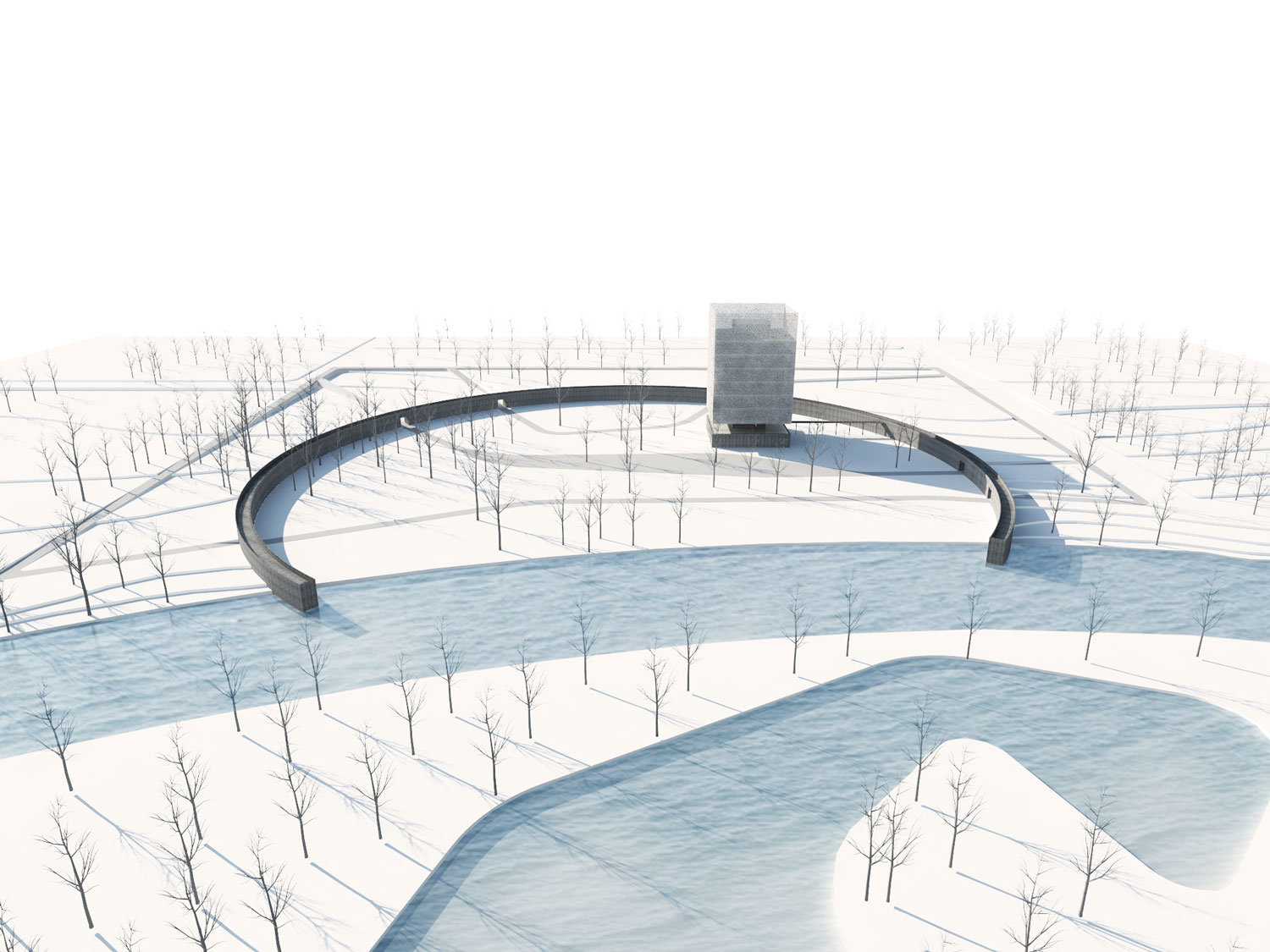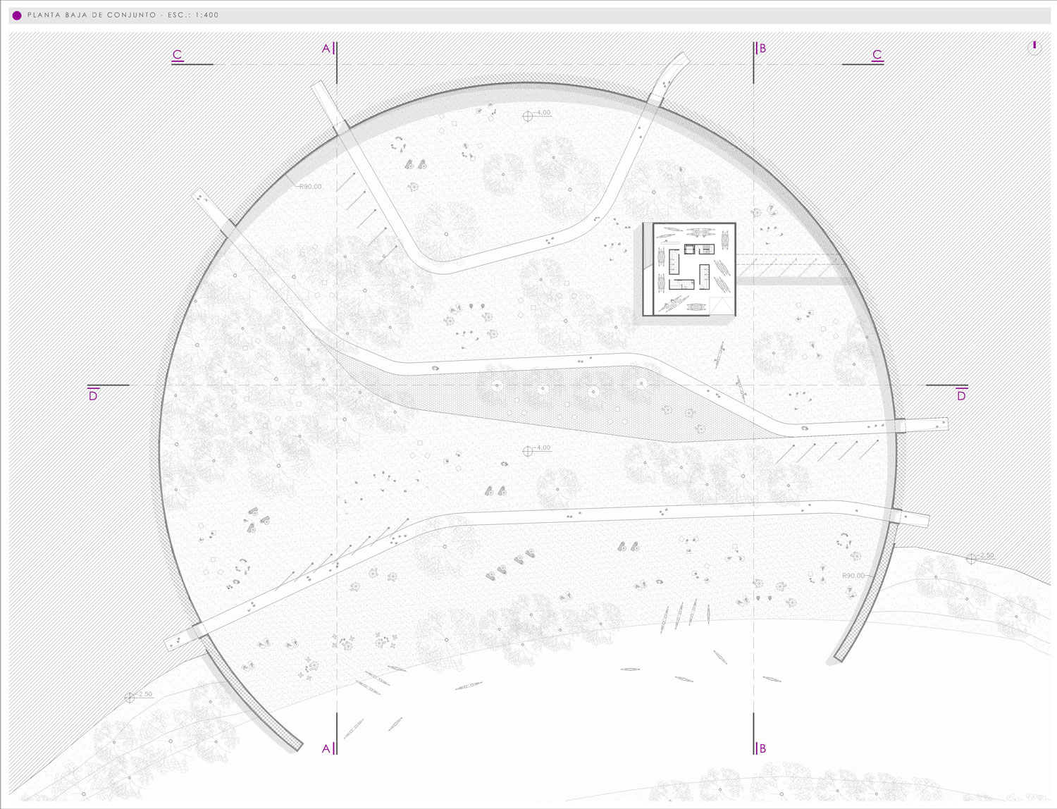 La propuesta es una operación en la topografía del sitio que contrasta estos dos estratos, al río y a la ciudad. Se trata de un cambio de nivel cuyo interés proyectual es crear un espacio central, público y al aire libre, materializado por una muralla de contención de forma circular, que también contempla las crecidas del río generando, en épocas de crecidas, una laguna natural controlada. Así, el nivel superior, brinda una visual del conjunto y su entorno inmediato mientras que el nivel inferior direcciona las visuales hacia si mismo en un paisaje controlado por la muralla, que solo se abre sobre al sur, a la visión profunda del río. Los requerimientos funcionales se ubican en una torre, la cual al alzarse por sobre las copas de los árboles, con un cerramiento permeable, permite alcanzar otros puntos de vistas, como son las visuales lejanas del valle y la barda. La extensión del lote y sus diferentes situaciones naturales, explanadas, bosques y orillas quedan intactas y se aprovechan mediante senderos sinuosos, que dialogan entre los dos estratos, para promover la circulación y la contemplación del paisaje.