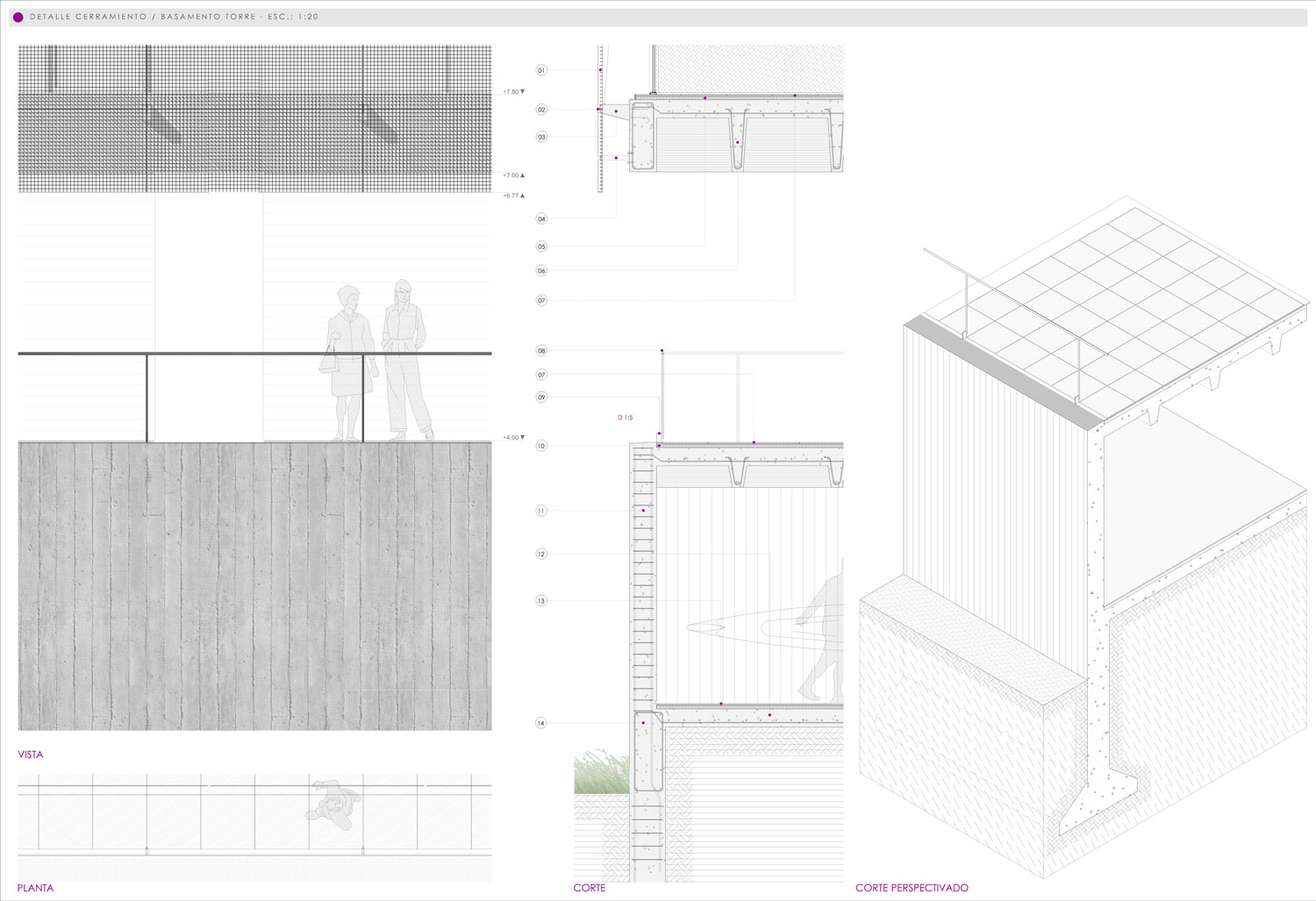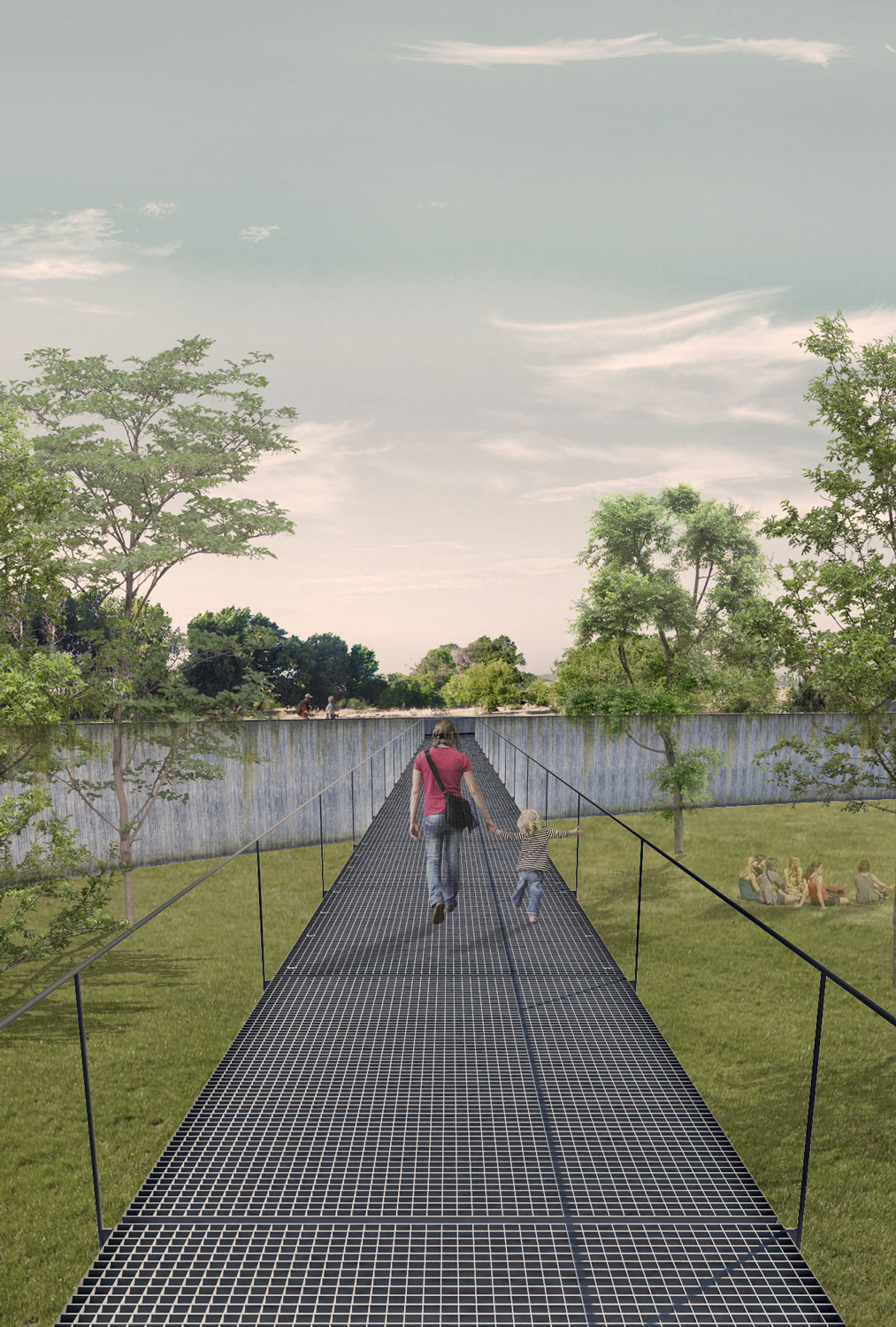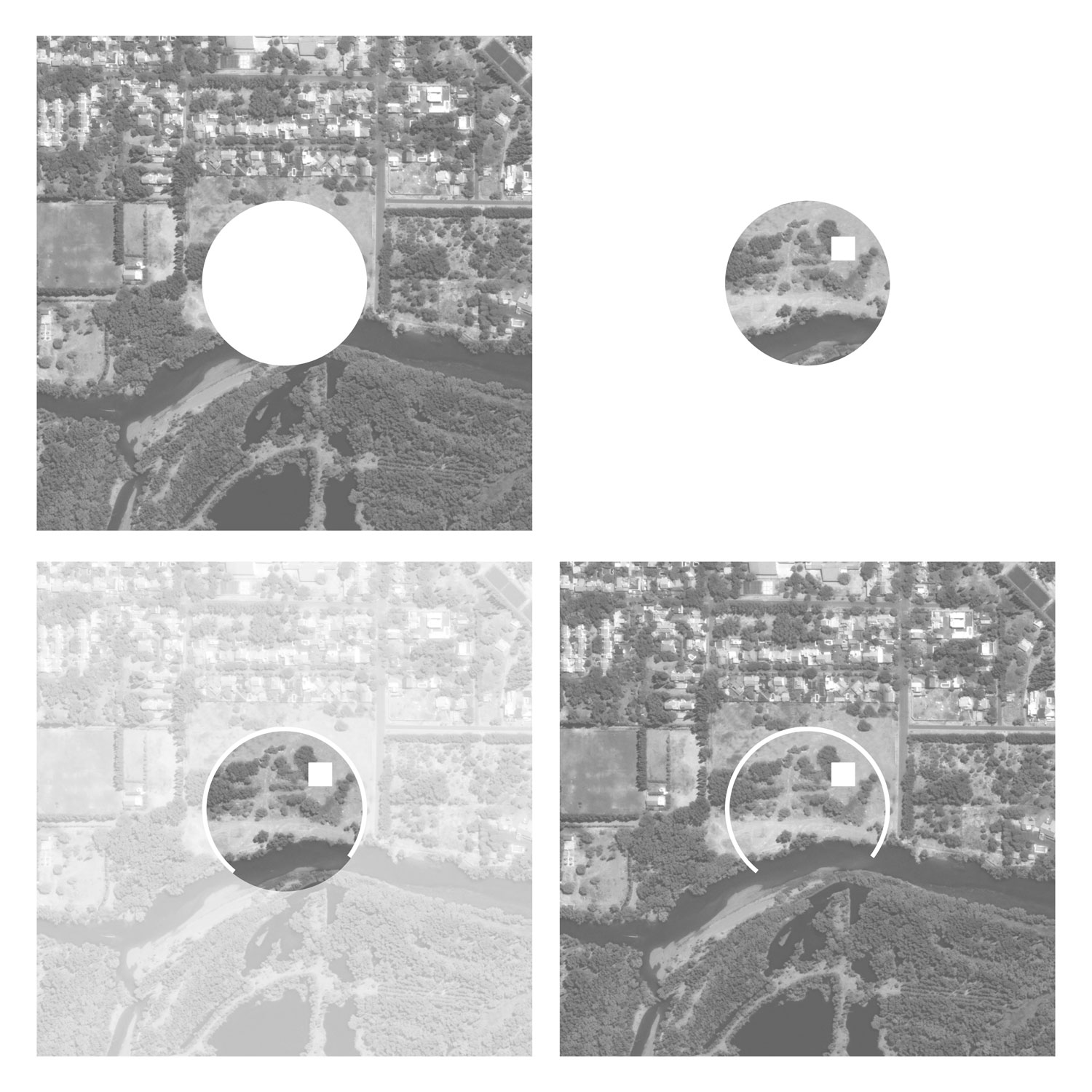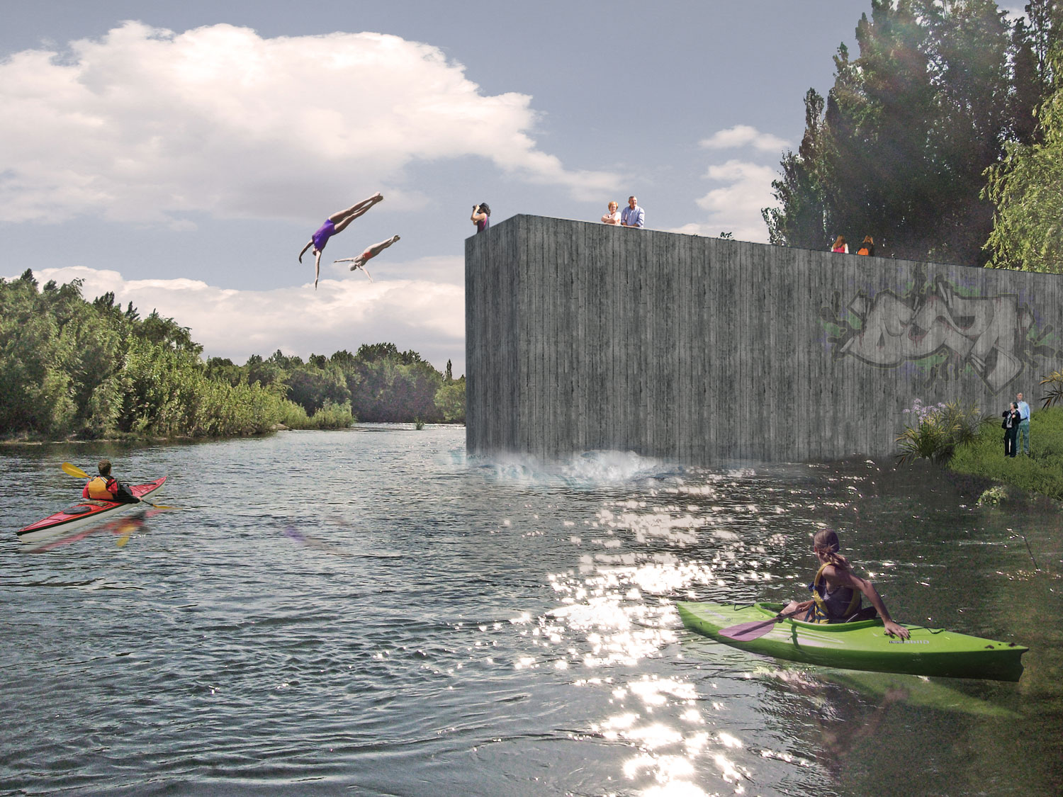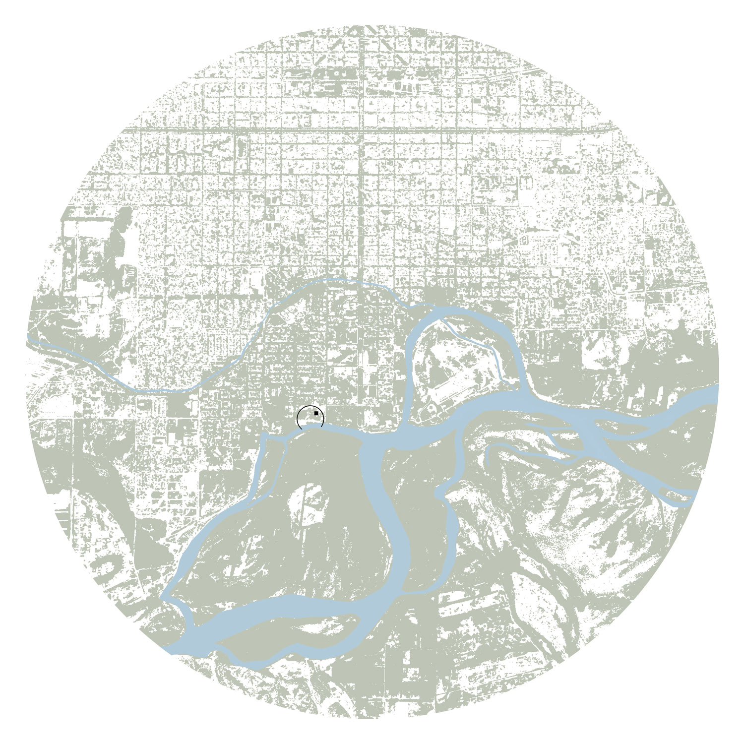 La propuesta es una operación en la topografía del sitio que contrasta estos dos estratos, al río y a la ciudad. Se trata de un cambio de nivel cuyo interés proyectual es crear un espacio central, público y al aire libre, materializado por una muralla de contención de forma circular, que también contempla las crecidas del río generando, en épocas de crecidas, una laguna natural controlada. Así, el nivel superior, brinda una visual del conjunto y su entorno inmediato mientras que el nivel inferior direcciona las visuales hacia si mismo en un paisaje controlado por la muralla, que solo se abre sobre al sur, a la visión profunda del río. Los requerimientos funcionales se ubican en una torre, la cual al alzarse por sobre las copas de los árboles, con un cerramiento permeable, permite alcanzar otros puntos de vistas, como son las visuales lejanas del valle y la barda. La extensión del lote y sus diferentes situaciones naturales, explanadas, bosques y orillas quedan intactas y se aprovechan mediante senderos sinuosos, que dialogan entre los dos estratos, para promover la circulación y la contemplación del paisaje.