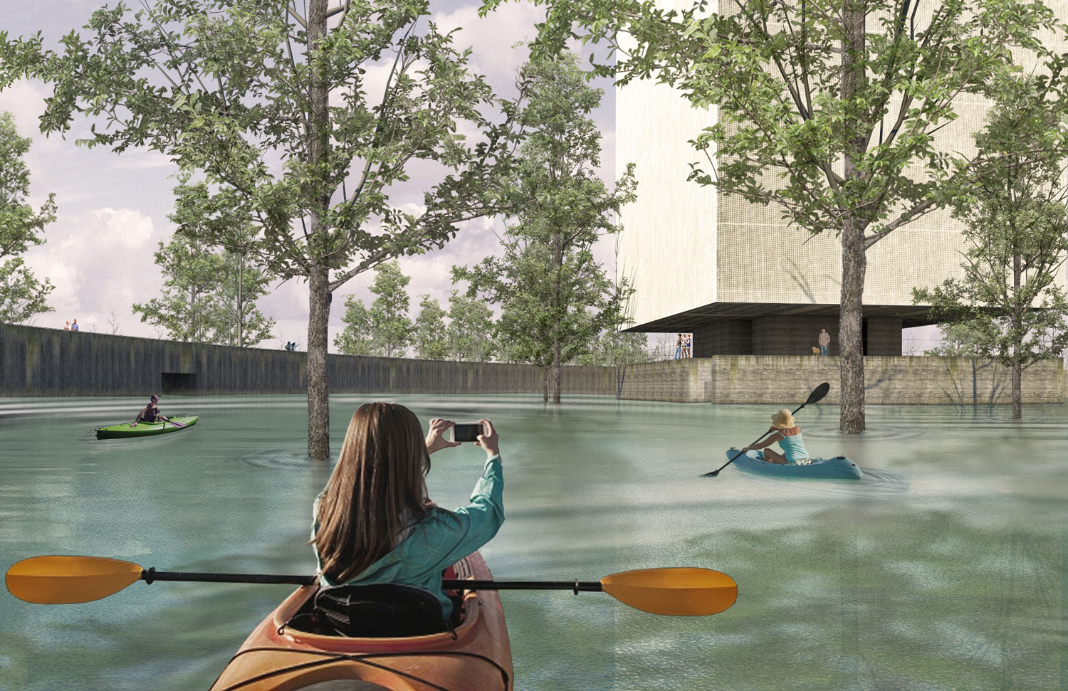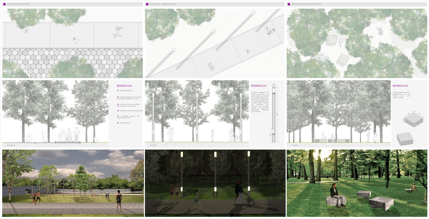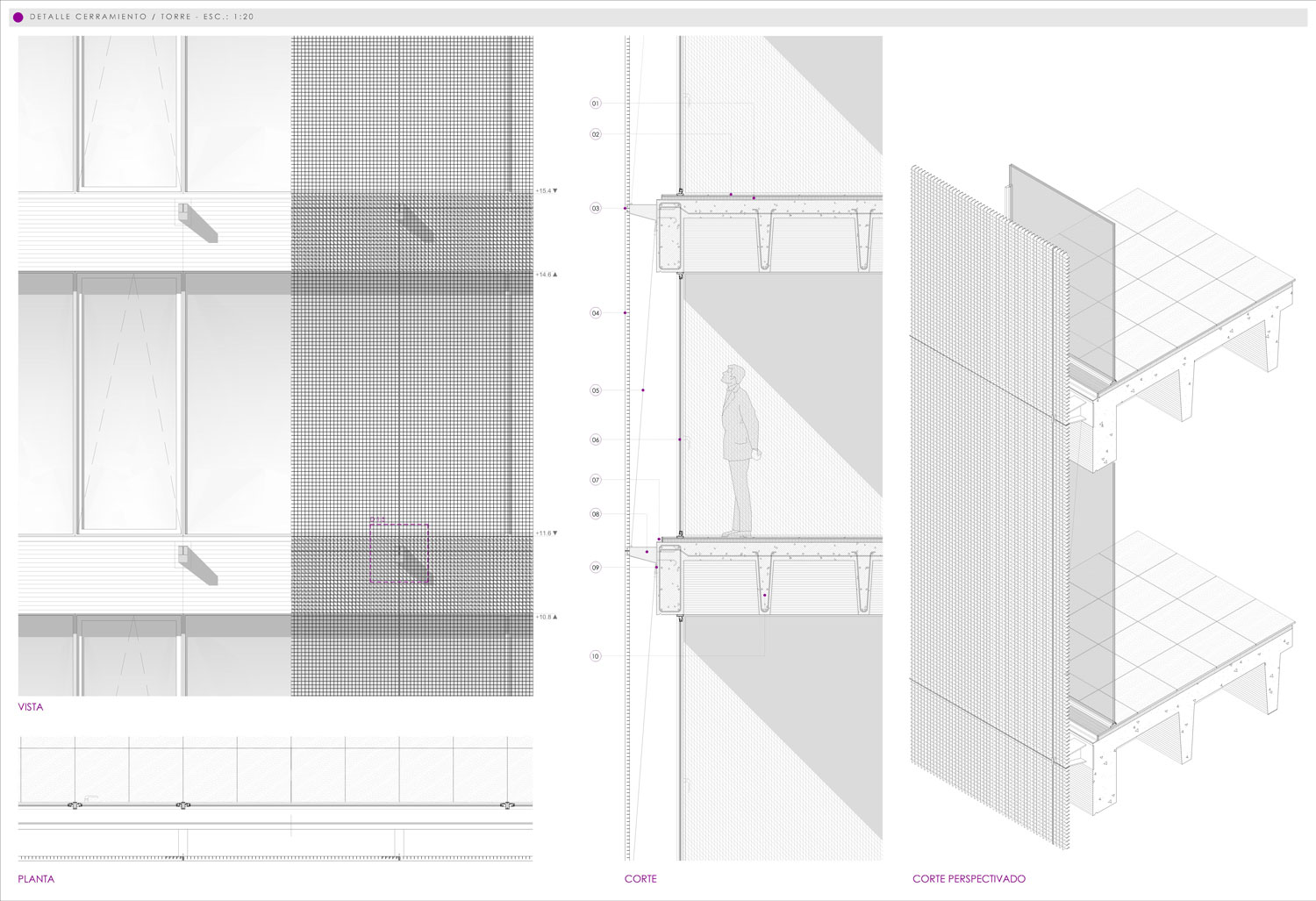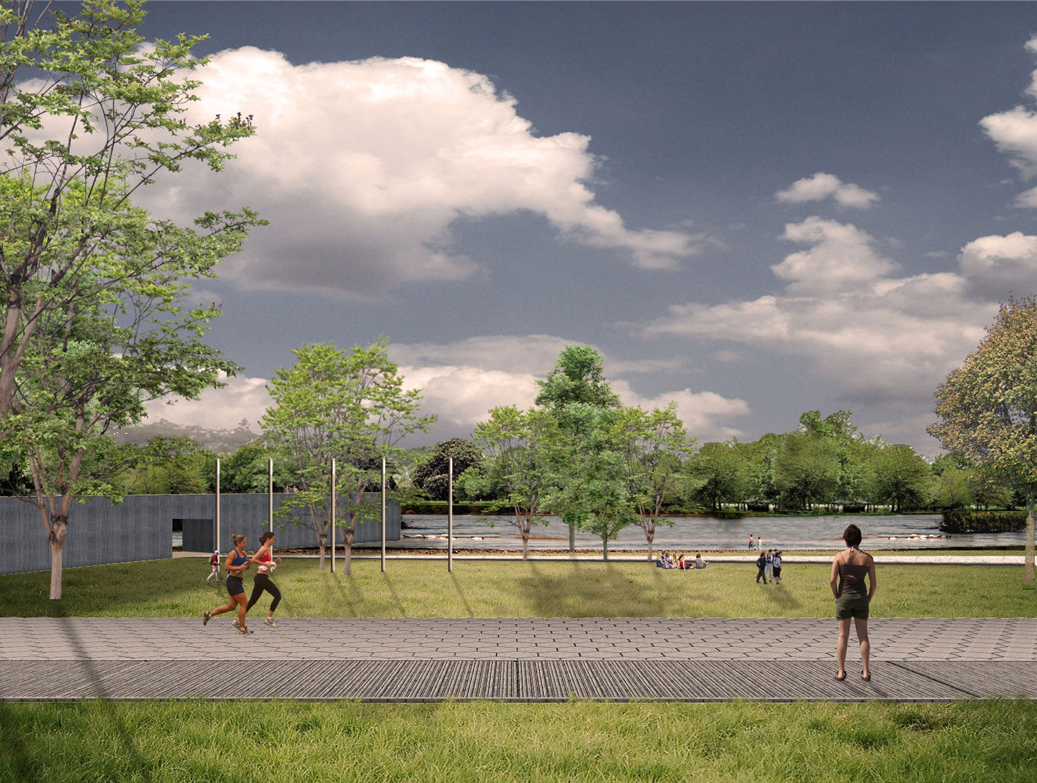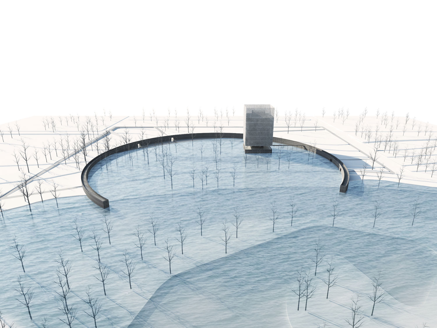 La propuesta es una operación en la topografía del sitio que contrasta estos dos estratos, al río y a la ciudad. Se trata de un cambio de nivel cuyo interés proyectual es crear un espacio central, público y al aire libre, materializado por una muralla de contención de forma circular, que también contempla las crecidas del río generando, en épocas de crecidas, una laguna natural controlada. Así, el nivel superior, brinda una visual del conjunto y su entorno inmediato mientras que el nivel inferior direcciona las visuales hacia si mismo en un paisaje controlado por la muralla, que solo se abre sobre al sur, a la visión profunda del río. Los requerimientos funcionales se ubican en una torre, la cual al alzarse por sobre las copas de los árboles, con un cerramiento permeable, permite alcanzar otros puntos de vistas, como son las visuales lejanas del valle y la barda. La extensión del lote y sus diferentes situaciones naturales, explanadas, bosques y orillas quedan intactas y se aprovechan mediante senderos sinuosos, que dialogan entre los dos estratos, para promover la circulación y la contemplación del paisaje.