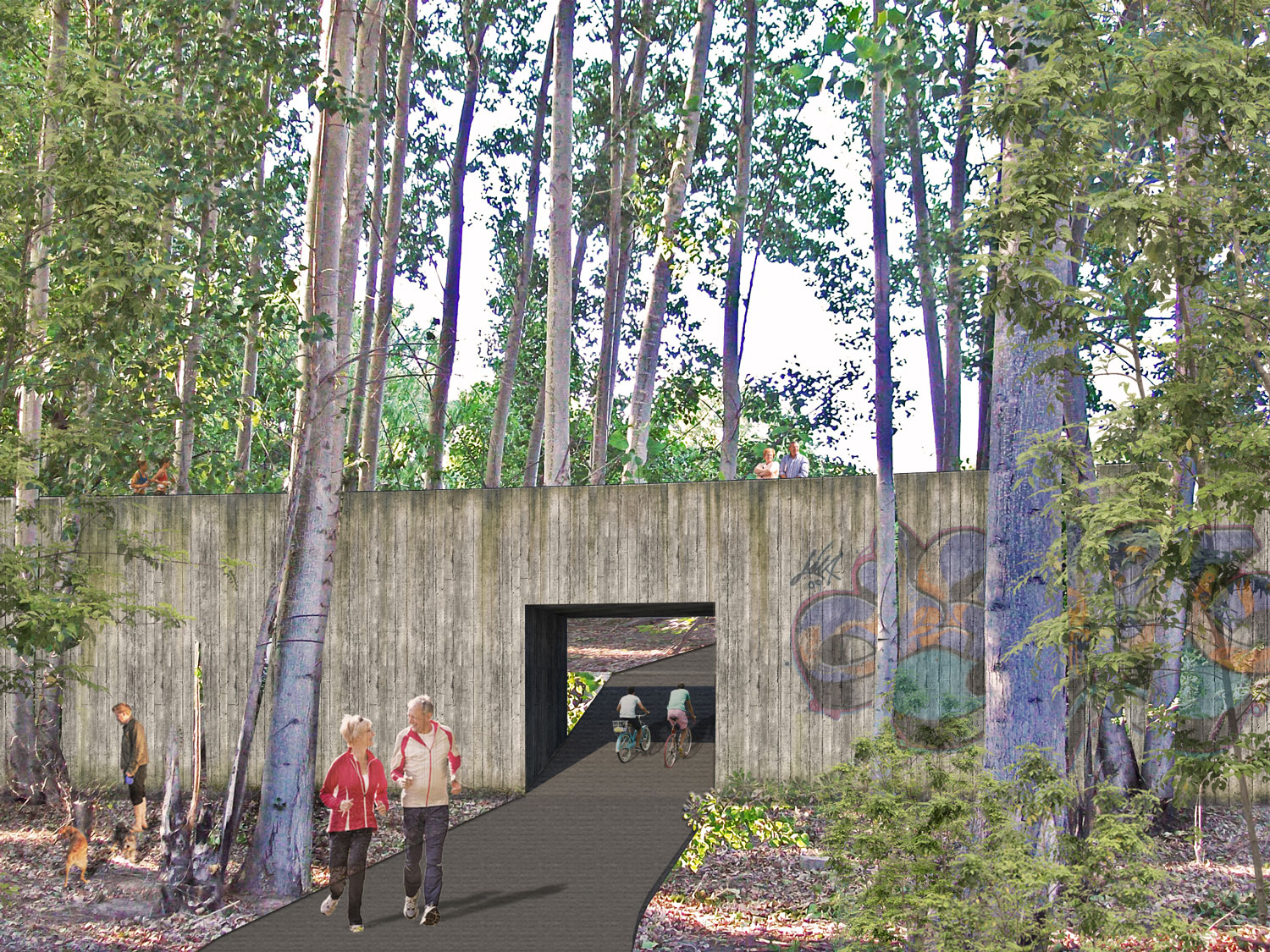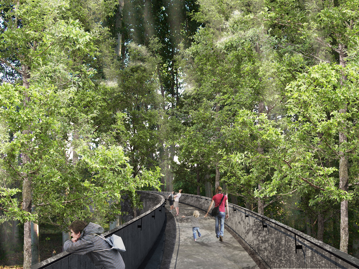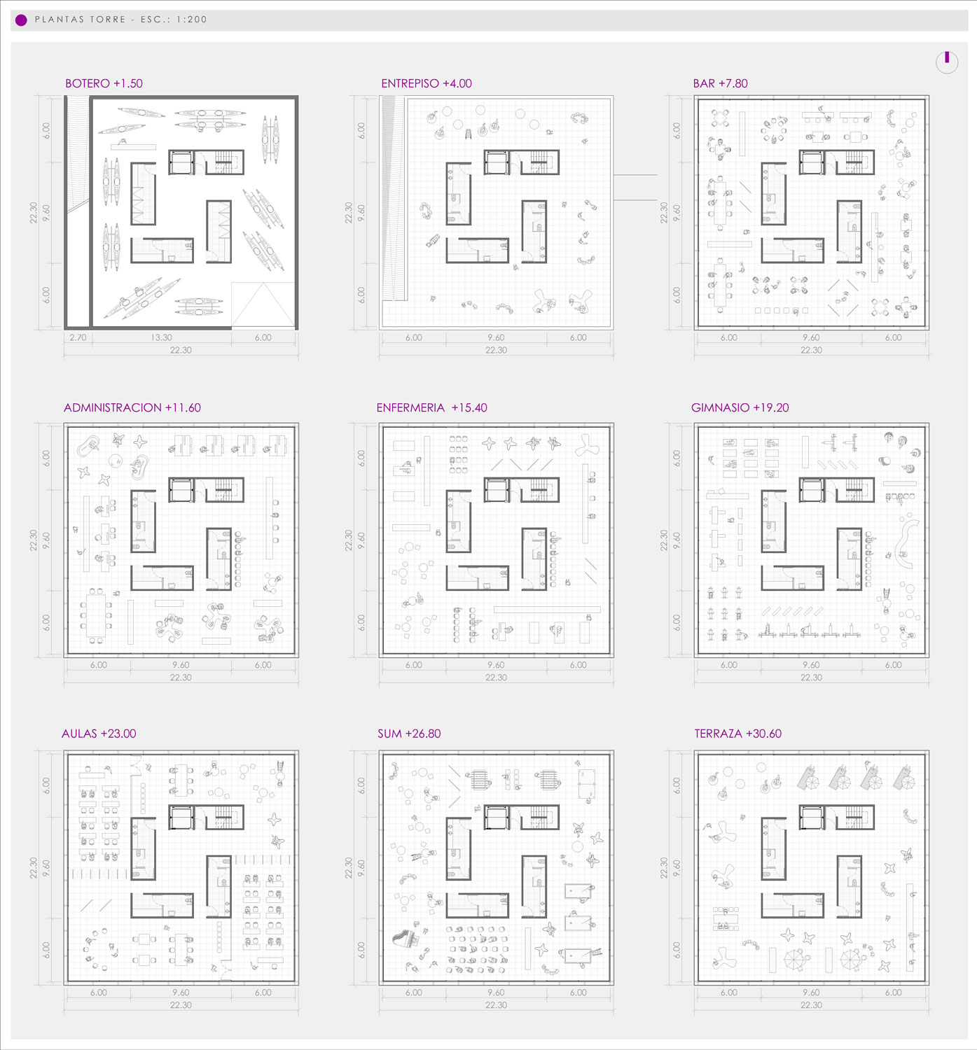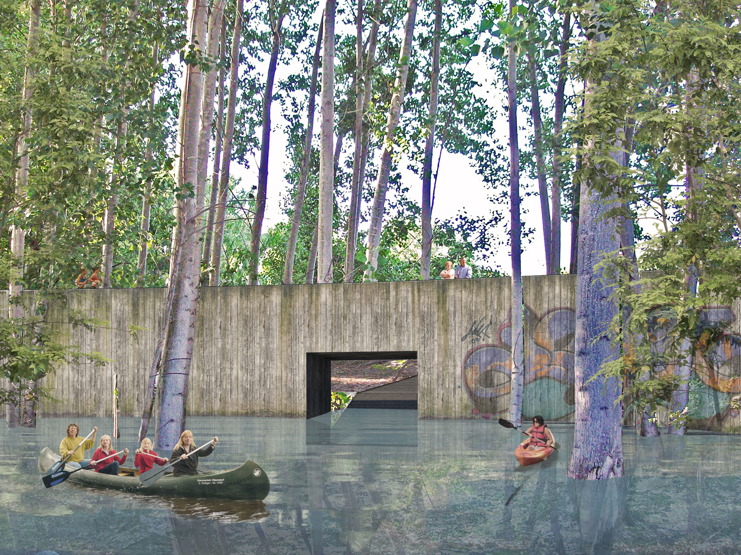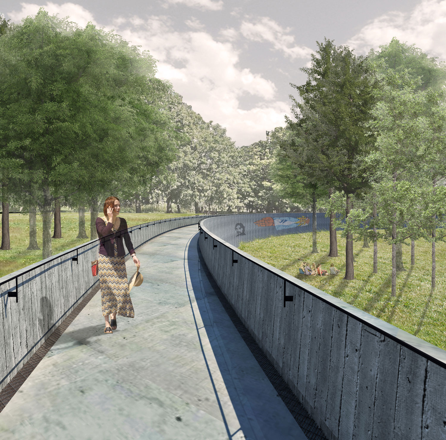 La propuesta es una operación en la topografía del sitio que contrasta estos dos estratos, al río y a la ciudad. Se trata de un cambio de nivel cuyo interés proyectual es crear un espacio central, público y al aire libre, materializado por una muralla de contención de forma circular, que también contempla las crecidas del río generando, en épocas de crecidas, una laguna natural controlada. Así, el nivel superior, brinda una visual del conjunto y su entorno inmediato mientras que el nivel inferior direcciona las visuales hacia si mismo en un paisaje controlado por la muralla, que solo se abre sobre al sur, a la visión profunda del río. Los requerimientos funcionales se ubican en una torre, la cual al alzarse por sobre las copas de los árboles, con un cerramiento permeable, permite alcanzar otros puntos de vistas, como son las visuales lejanas del valle y la barda. La extensión del lote y sus diferentes situaciones naturales, explanadas, bosques y orillas quedan intactas y se aprovechan mediante senderos sinuosos, que dialogan entre los dos estratos, para promover la circulación y la contemplación del paisaje.