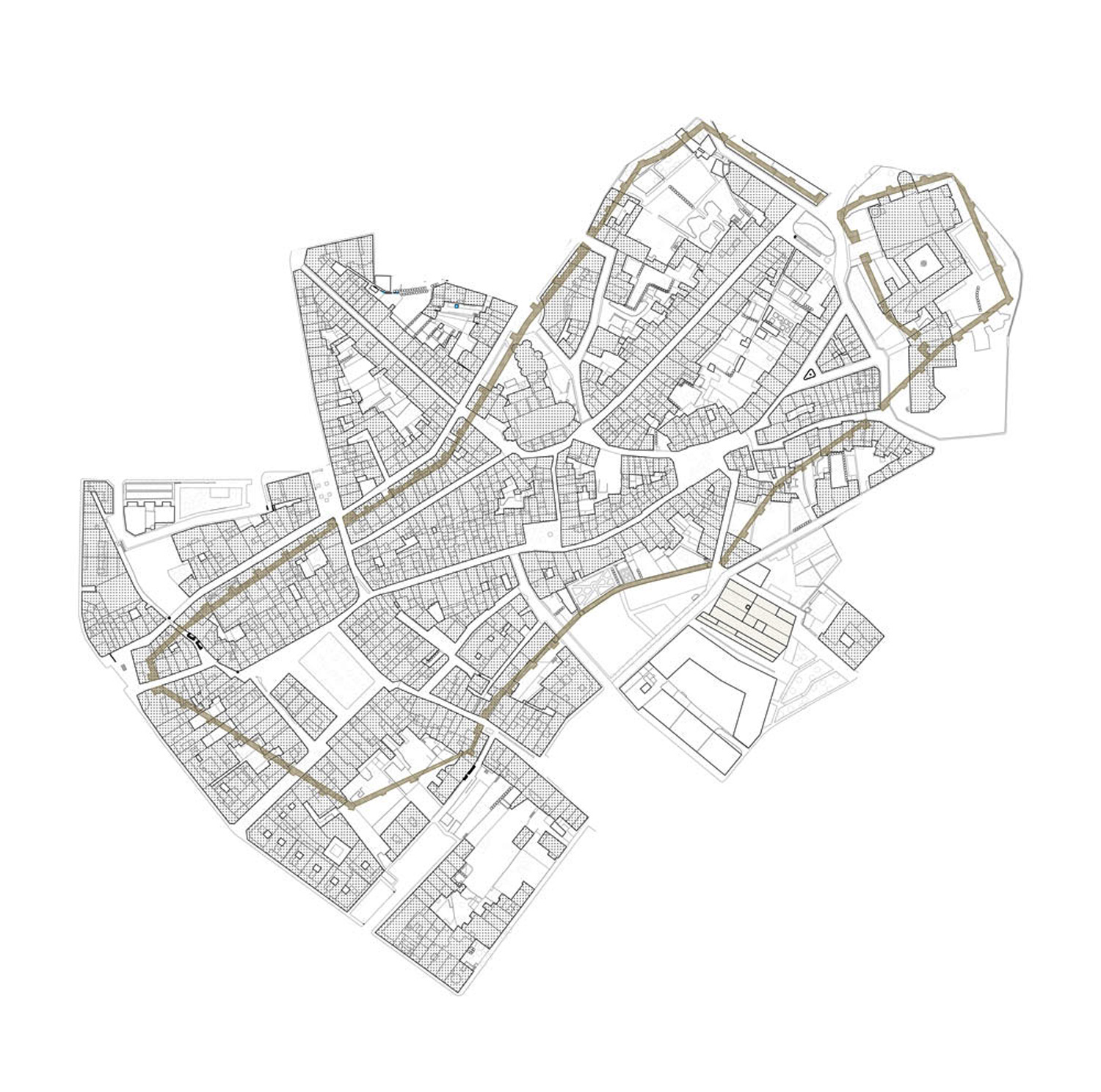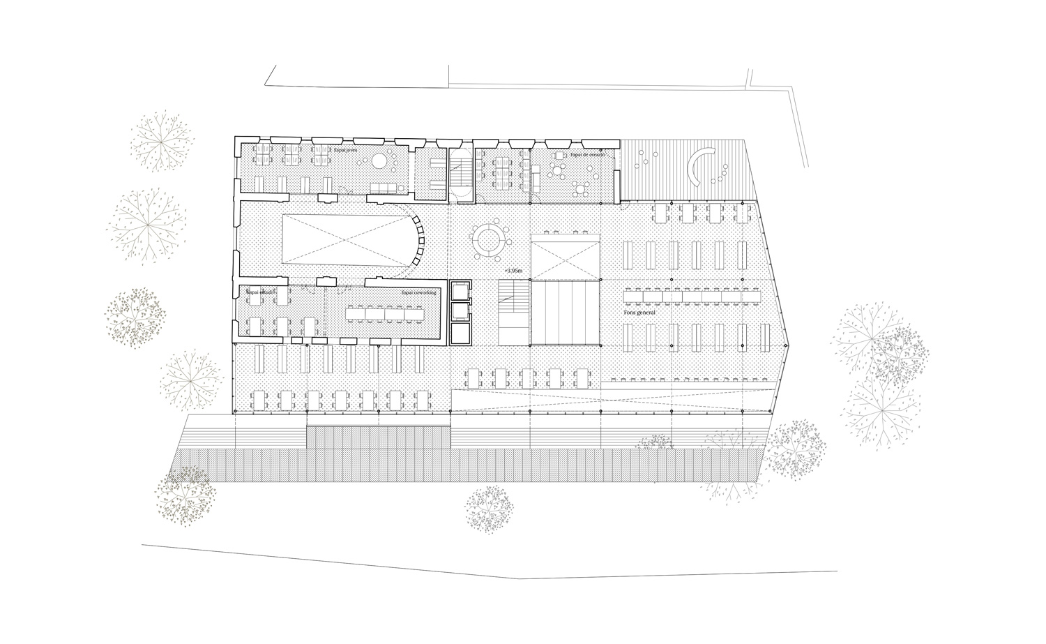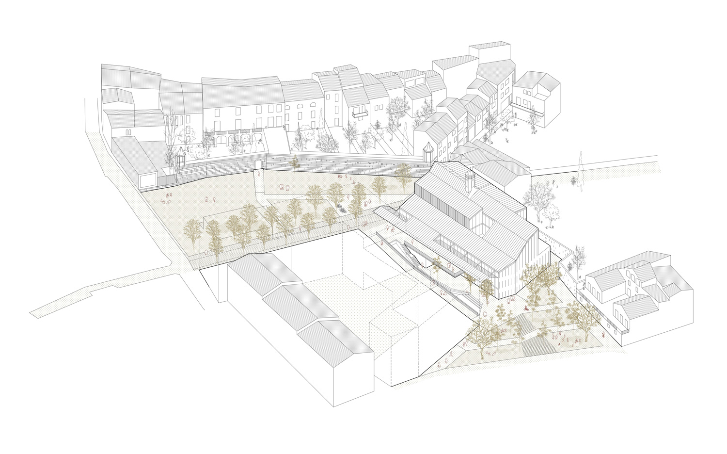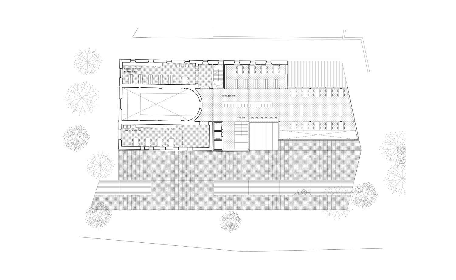 The new library is built based on the compositional traces of the old chapel but shifts its centrality towards the new passageway. The proposal is organized based on two perpendicular axes: the central axis of the chapel shed and the transversal axis of access. The centre of the library orbits around the intersection of these two axes.