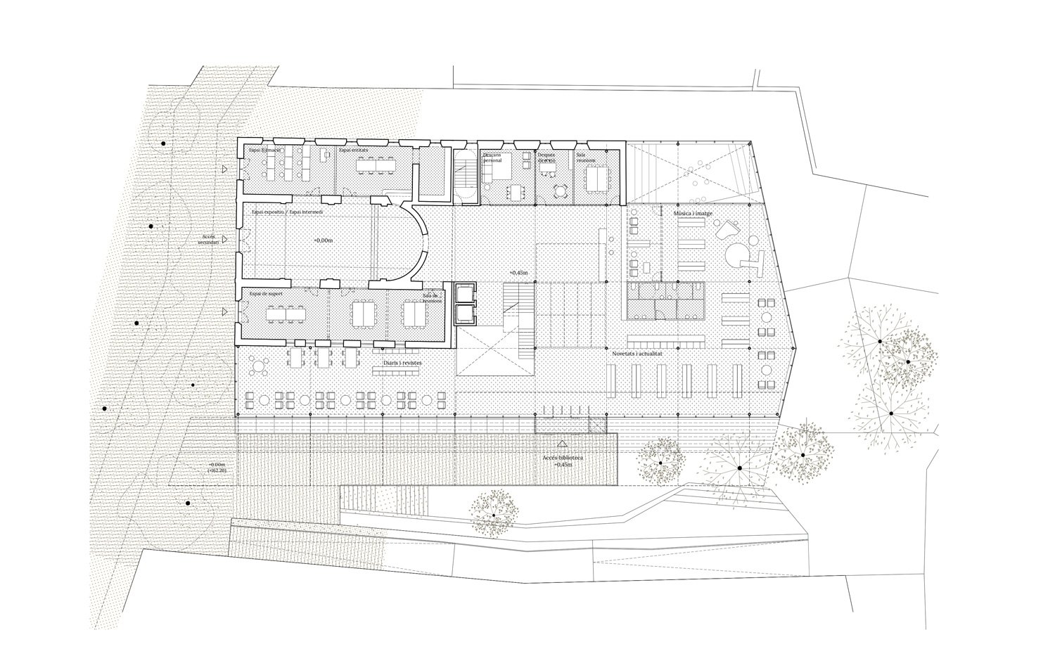 The new Banyoles Regional Library placement offers the opportunity to regain a significant space for Banyoles citizens remembrance at the same time that provides great transformative and revitalizing potential to the new premises. The former La Providència convent is located outside of the city walls in a strategic position in the border between the old town and the suburbs of the city. The placement of this new facility in this context is seen as the ideal opportunity to establish a new central space that connects two urban fabrics that are poorly connected.