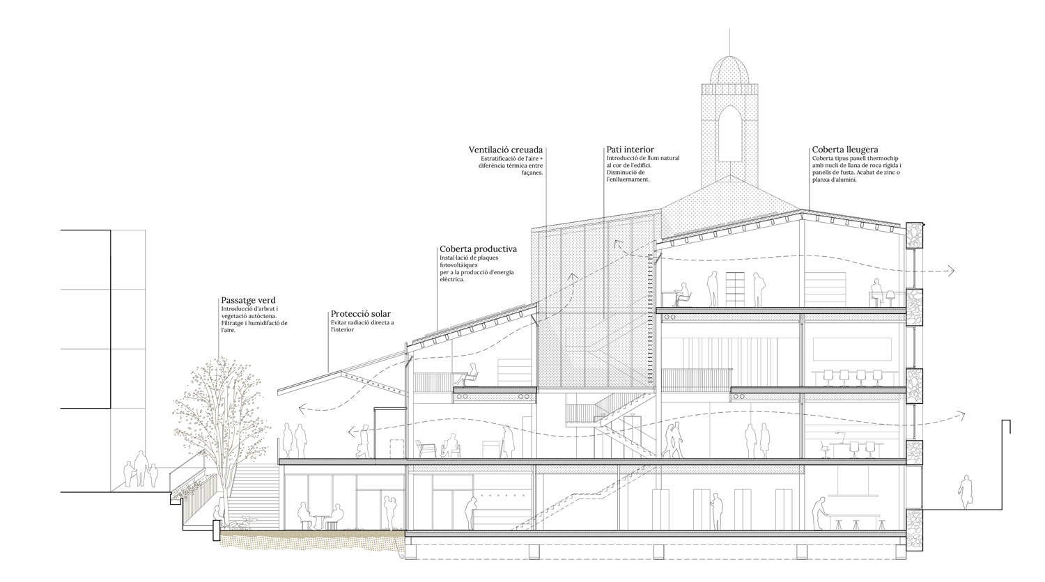 This roof connects with the new chapel roof, which is restored and adapted to the geometry of its original façade, thus generating a continuous roof for the entire complex. The central courtyard incorporates vertical communications of the building and helps to artistically articulate the encounter and seeks to stand out the bell tower, making it visible from the interior.