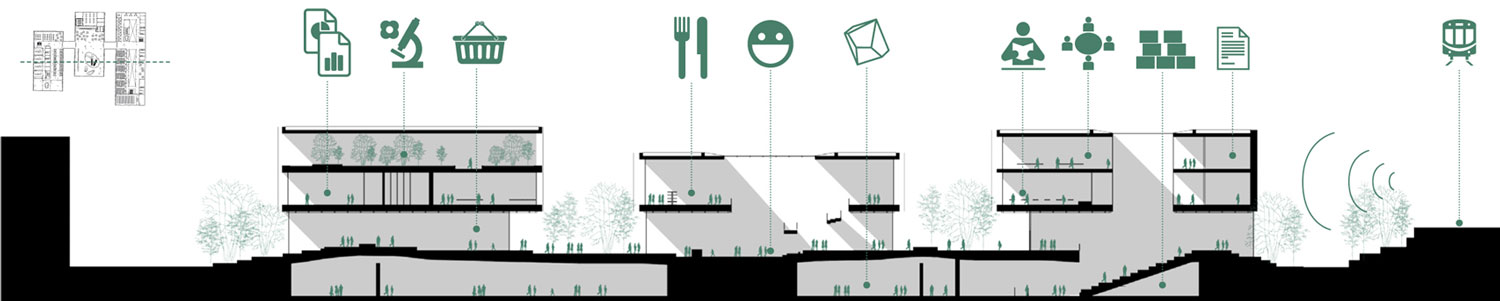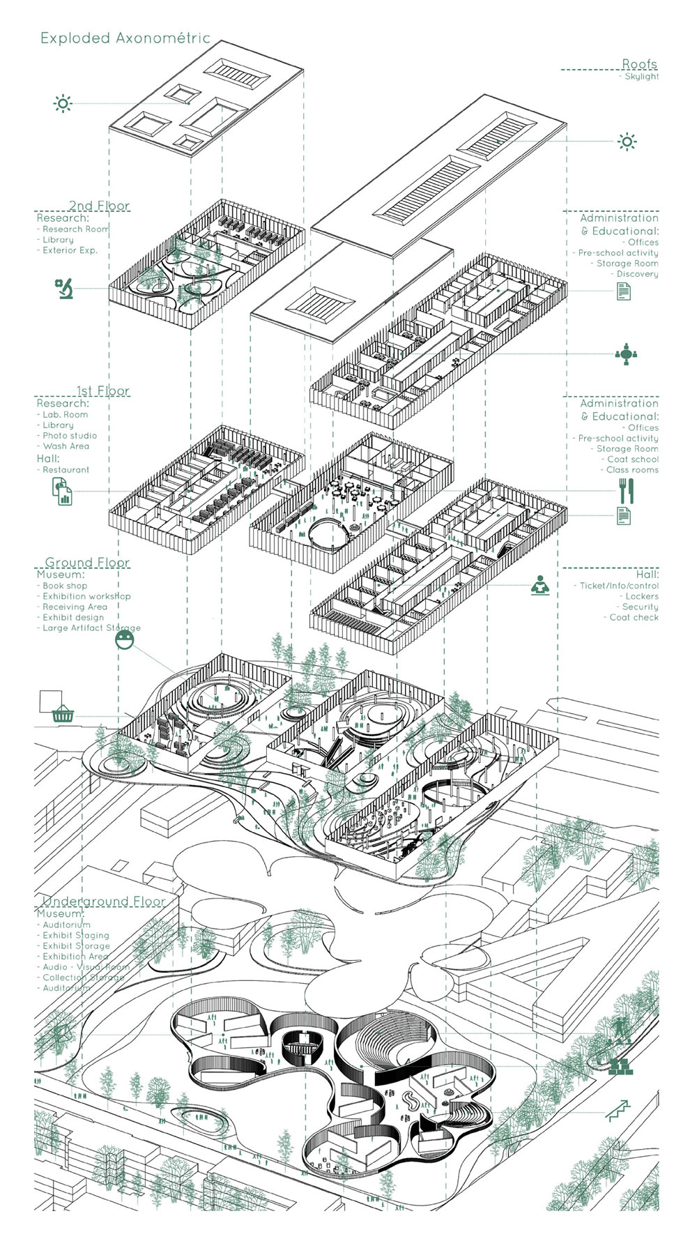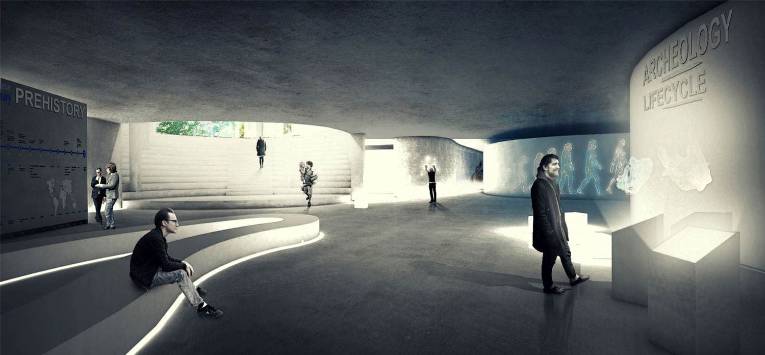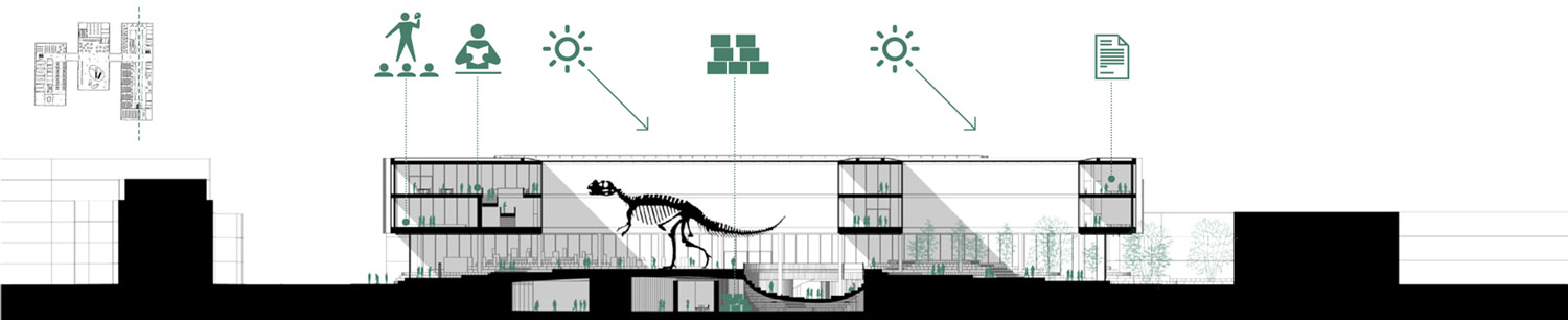 The design of the Museum is supported on a wish of mix different programs related to research, education and exposure to create an interactive and interconnected space. The first idea is to build on the foundation of a Museum of Natural Sciences in the approximate maximum nature and which is exposed to the interior. Not to build a tall building we have chosen to bury most of the museum and offer a ground floor open (visually) playing with a topography featuring a cityscape. To be found on the Museum volumes rational that resume surrounding typologies and street alignments. These volumes are intended for easy operation and remain in connection with the Museum with large patio overlooking exhibition spaces.