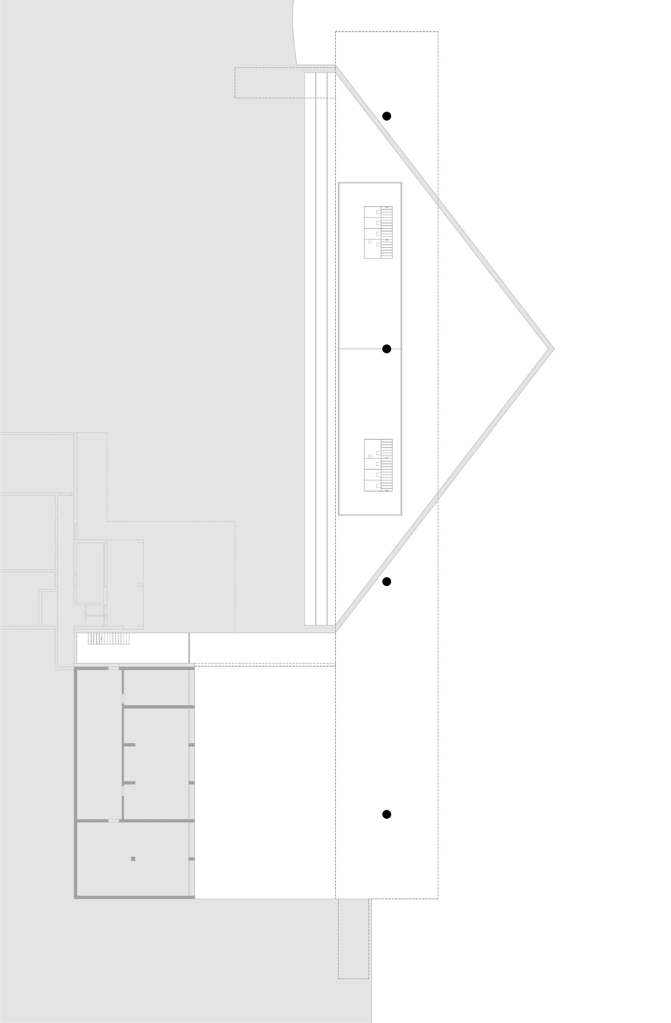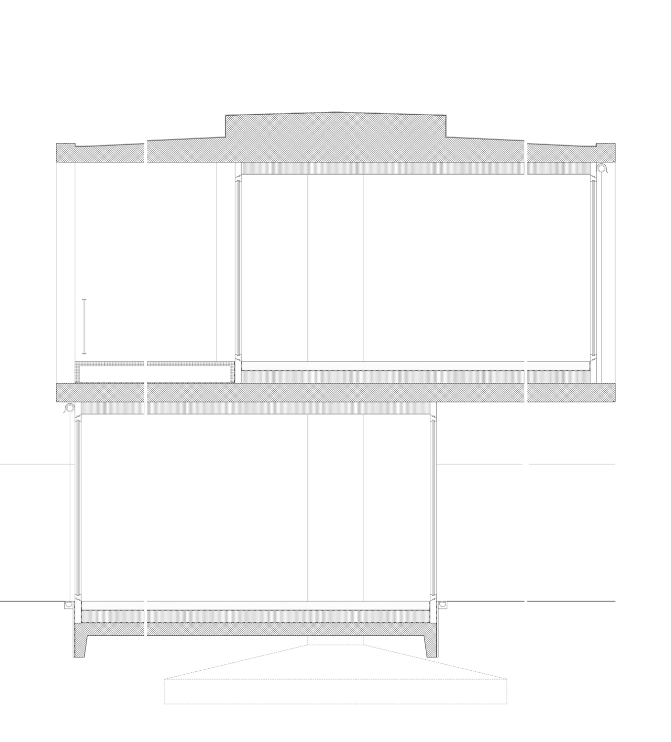 Four columns, lengthwise arranged, support the roof and partially the lower slab that, for the remaining, is hanging on the roof structure by the means of the tie-rods aligned on the whole edges. The same columns, by the means of their generous section and of being interlocked in the foundations, allows the building to resist to asymmetrical and horizontal forces.
