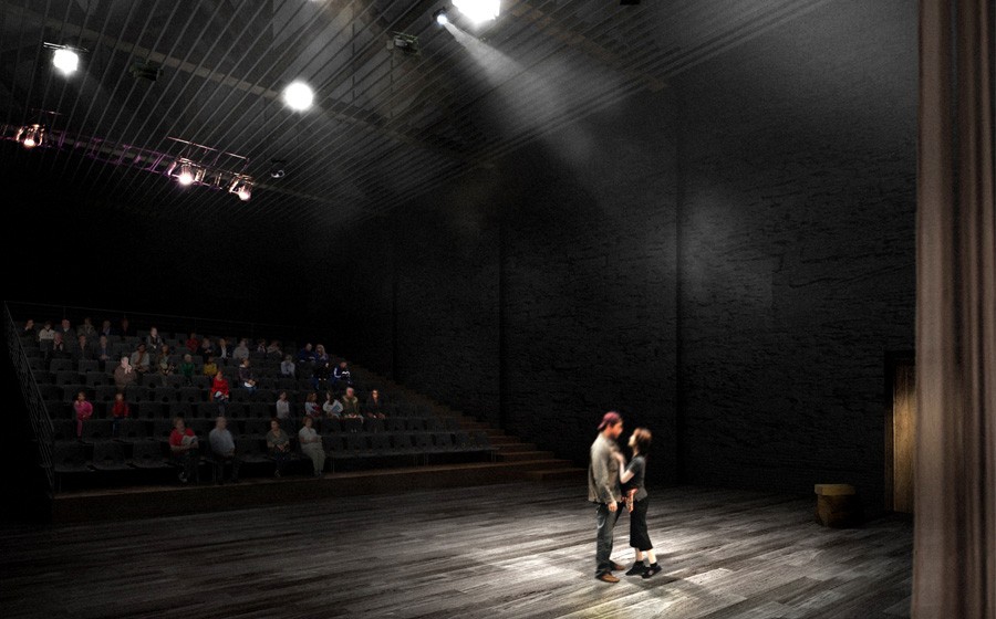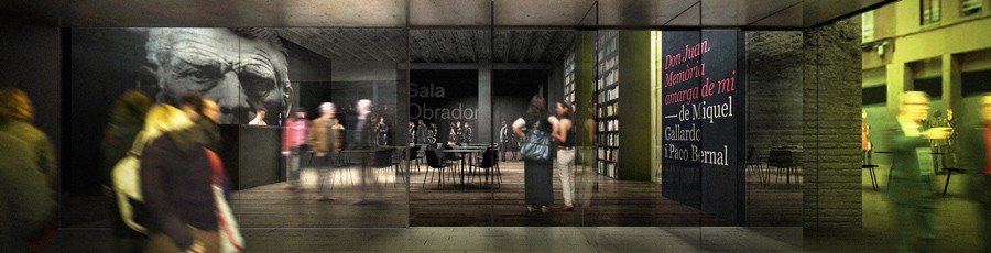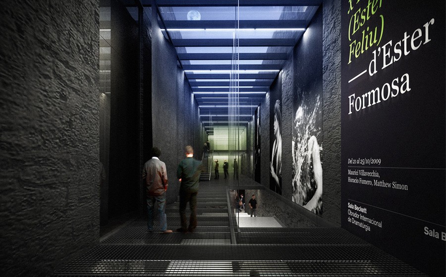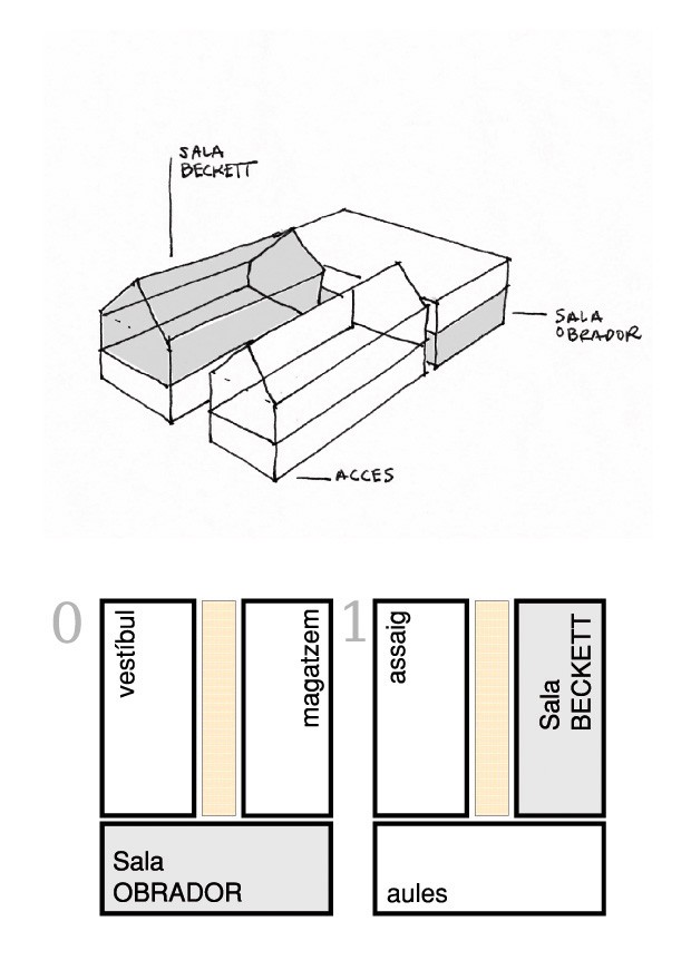 Proponemos no hacer nada … Utilizamos el edificio existente sin voluntad de transformar sino más bien de ocupar. Recuperamos el patio y pintamos de negro los interiores. Potenciamos de esta forma una estructura de tres espacios alrededor de un vacío. La intención es adaptar el edificio con el menor presupuesto posible. Apostamos por la polivalencia de los espacios. Reducimos superficies y calidades consiguiendo un 47% de ahorro económico. Los protagonistas serán los actores, no la escenografía … no renunciamos a nada.