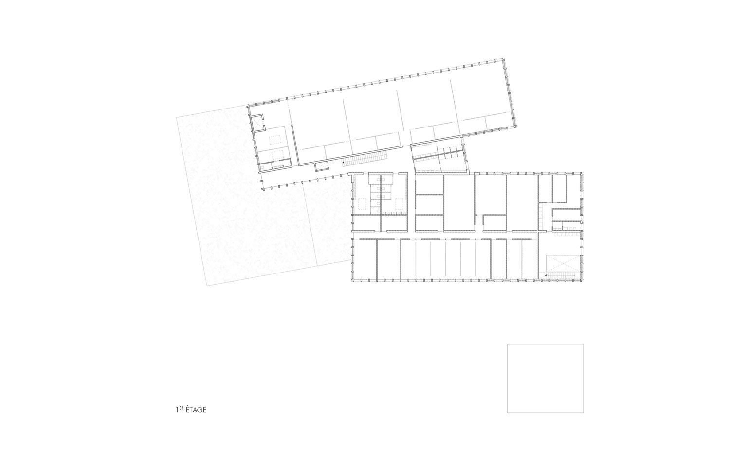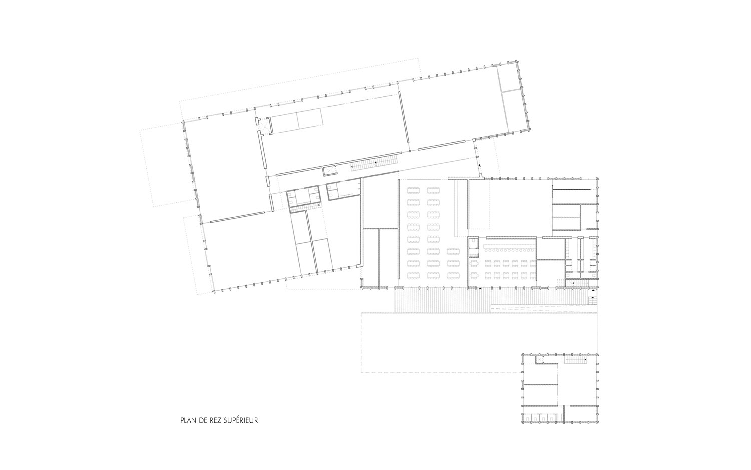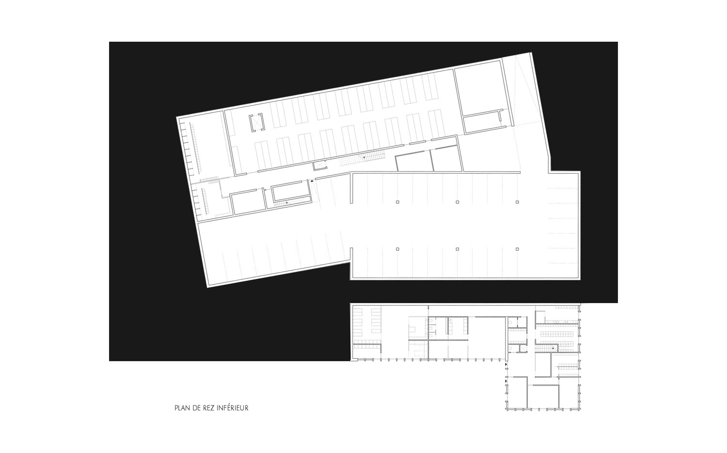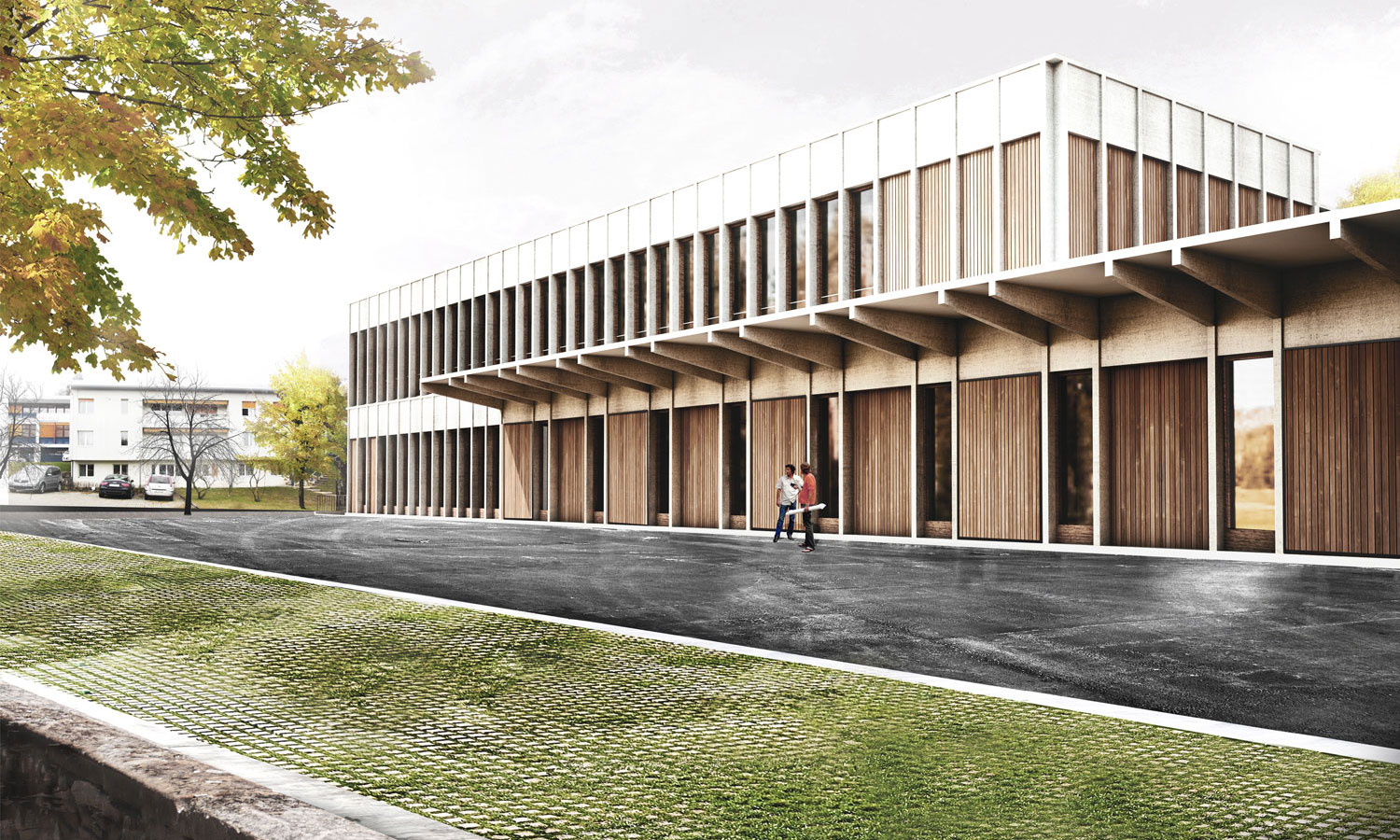 ☉ Nouveaux ateliers pour la Fondation Les Oliviers is a second prize proposal by Larchs for Fondation Les Oliviers designed in 2014. It is located in Lausanne Switzerland in an outskirt setting. Its scale is medium with a surface of 6.000 sqm an estimated budget of 11.000.000 € and a ratio of 1.833 €/sqm. Key materials are concrete and wood. The concept of ribs is explored.