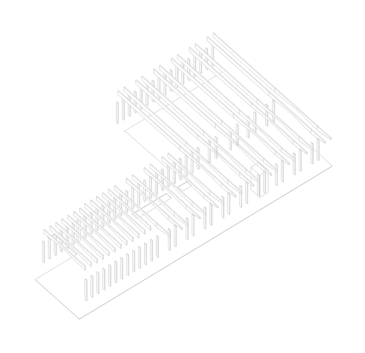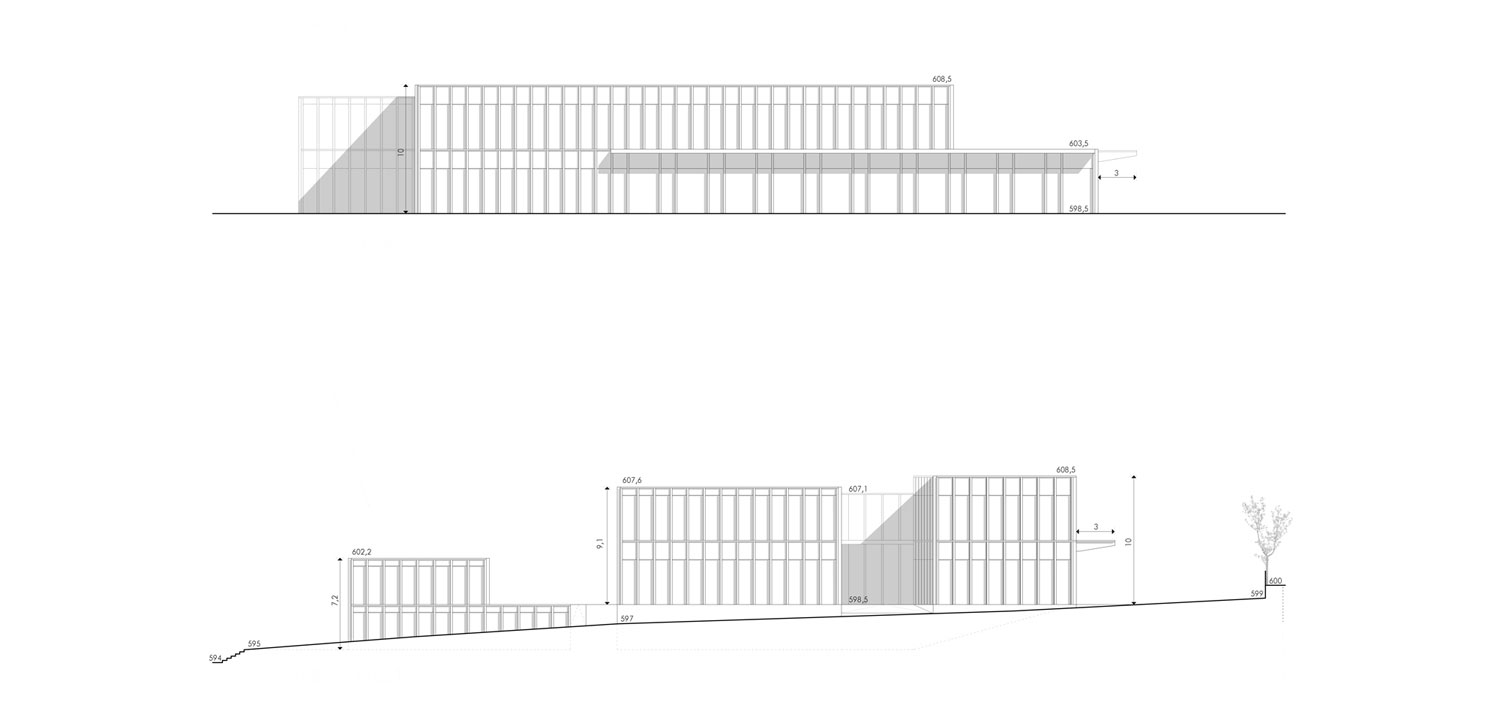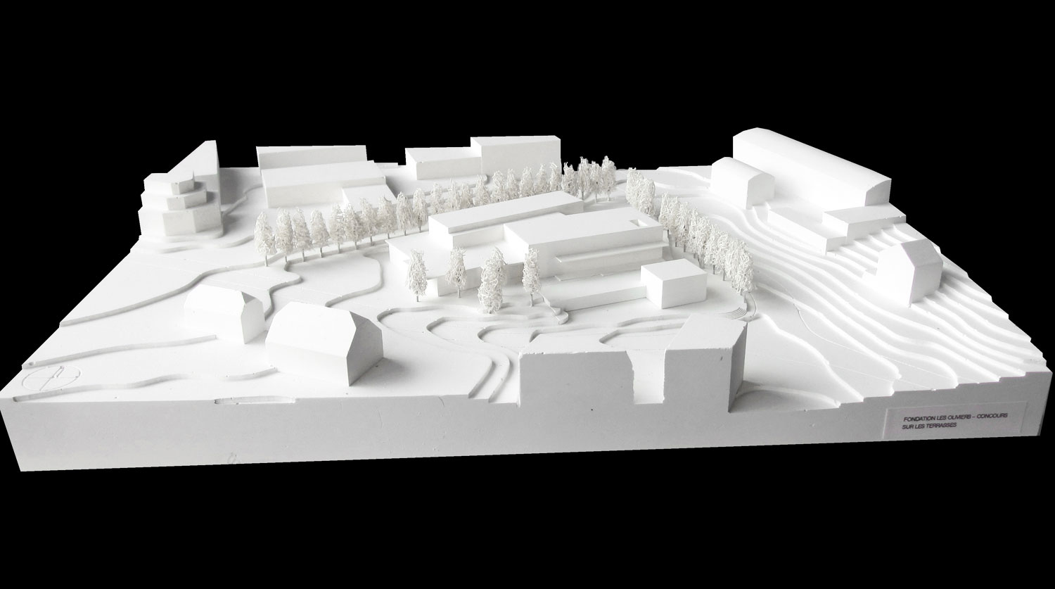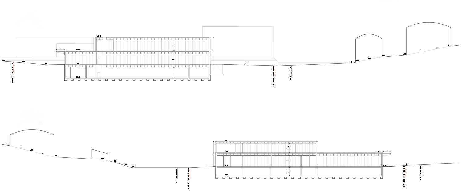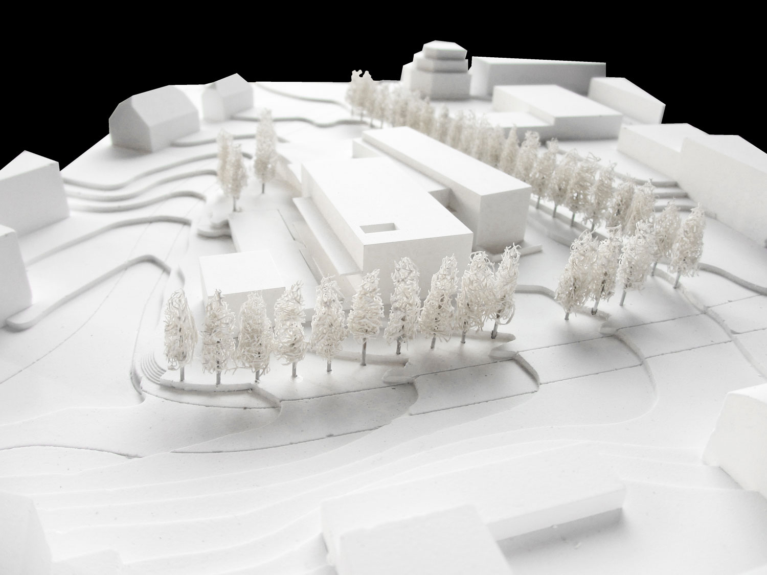 Le projet se compose de volumes simples et reconnaissables qui s’intègrent dans le paysage et interprètent les caractéristiques spécifiques du contexte. La géographie du lieu, caractérisée par des différences de hauteur évidentes, devient thème de conception. Les volumes sont harmonisés aux courbes de niveau et le projet prend en compte de la déclivité naturelle du terrain afin d’éviter des mouvements de terre importants. Les bâtiments sont donc harmonisés aux courbes et s’inscrivent dans le contexte, dessinant un paysage de collines et de terrasses habitées. Les phases de construction prévues par le programme du concours s’inscrivent dans cette logique de paysage, sans entraver les activités des bâtiments déjà construits, en tenant compte des différents types d’utilisateurs et des flux de personnes. Les différents espaces du programme se traduisent architecturalement par trois volumes.