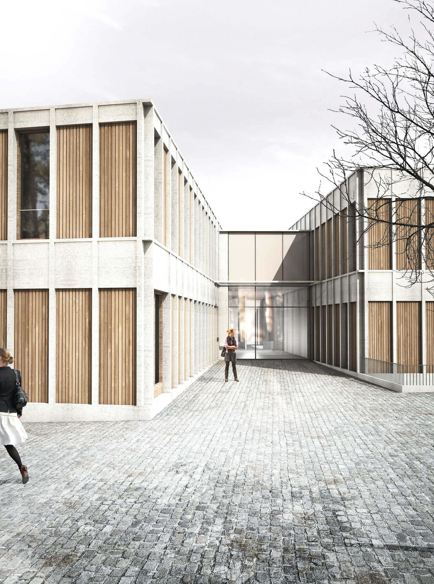 Les entrées a la parcelle ont été limites à deux : une est dédiée à la livraison des marchandises pour les ateliers et a l’accès des collaborateurs de la Fondation, l’autre sert aux visiteurs de la Fondation, de la cafétéria, de la salle à manger et a la crèche. Le projet respect et optimise les surfaces nettes prévues du programme des locaux et restreint l’utilisation de couloirs pour maintenir les volumes compacts. Le système de façade du bâtiment, doté de stores obscurcissant externes, est modulaire et assure dans le temps la polyvalence et la flexibilité d’utilisation des espaces des ateliers et des locaux administratifs. Les nouveaux bâtiments seront construits dans la culture des constructions en matière de développement durable. Pour assurer le confort thermique et acoustique e la protection incendie, nous privilégions une construction mixte (structure en béton, fenêtres et parties opaques en bois).