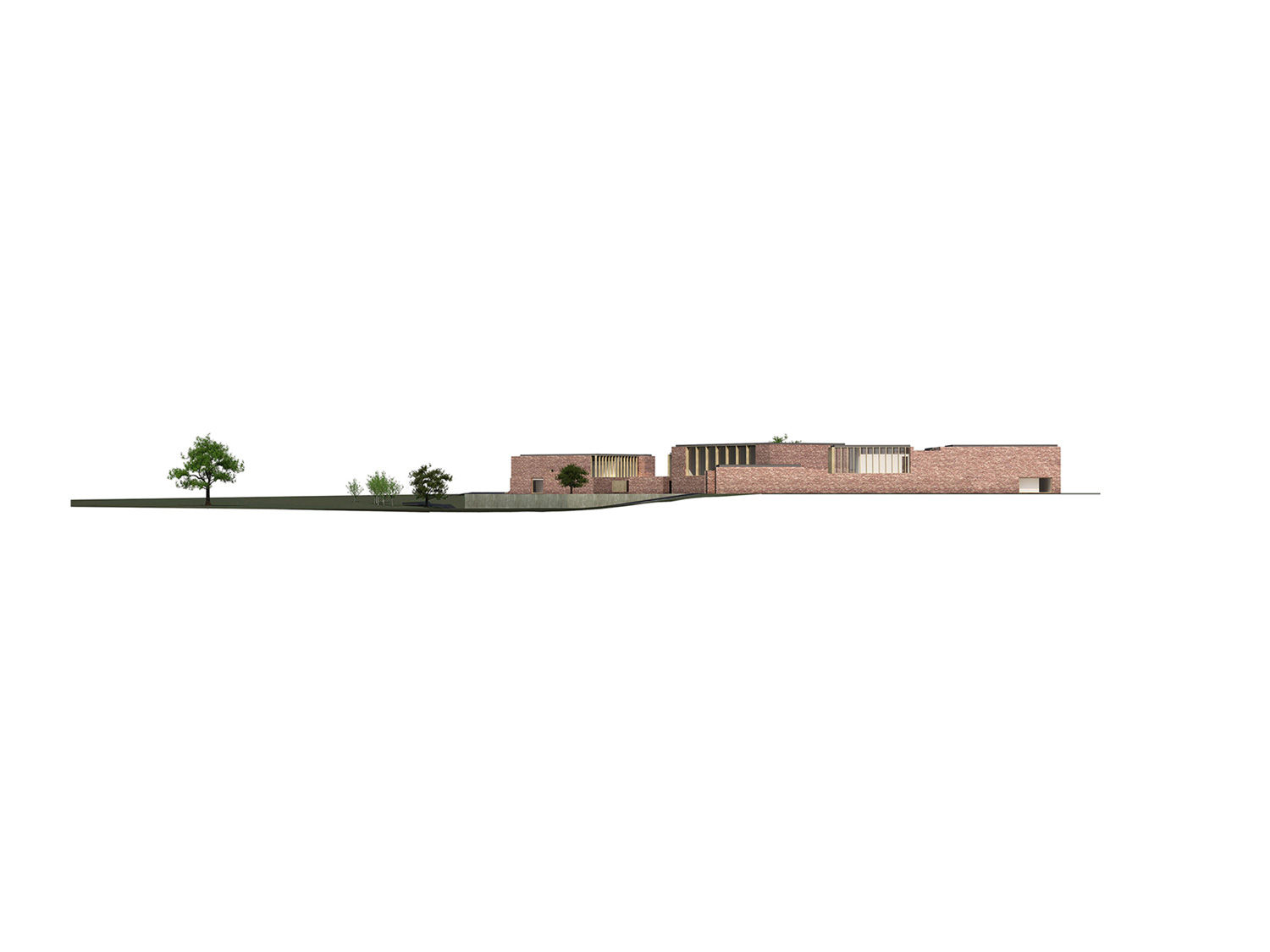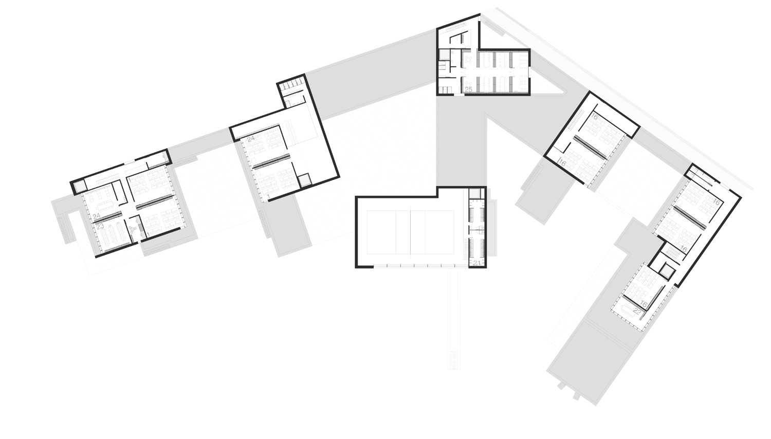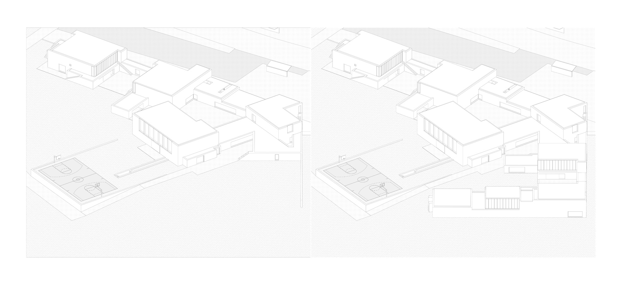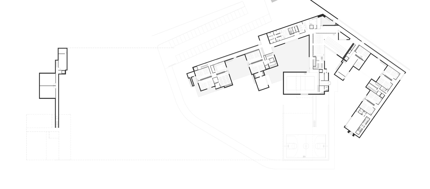 The entrance in the interior spaces of the building is preceeded by a patio that allows a very strict control of the children’s flows. All this central area where the entrance is positioned, retains all the public program (such as canteen, library), that can be used by the three school departments (Materska, Stupen I, Stupen II). The garden is facing West, towards the naturalized landscape. The relation of the building with the garden was solved with a succession of courtyards, with different scales, according to the spaces’ functions facing them. Apart from the central position of the public programs serving simultaneously the three school’ divisions, the sports pavilion is next to the Kitchen, allowing the direct connection in a case of a big event. In terms of phasing the three phases are clearly distinguished, even if they are linked, and each one of them has their own spaces and patios. This allows also to keep the first phase program working while the second phase is built, and the same for the third phase.