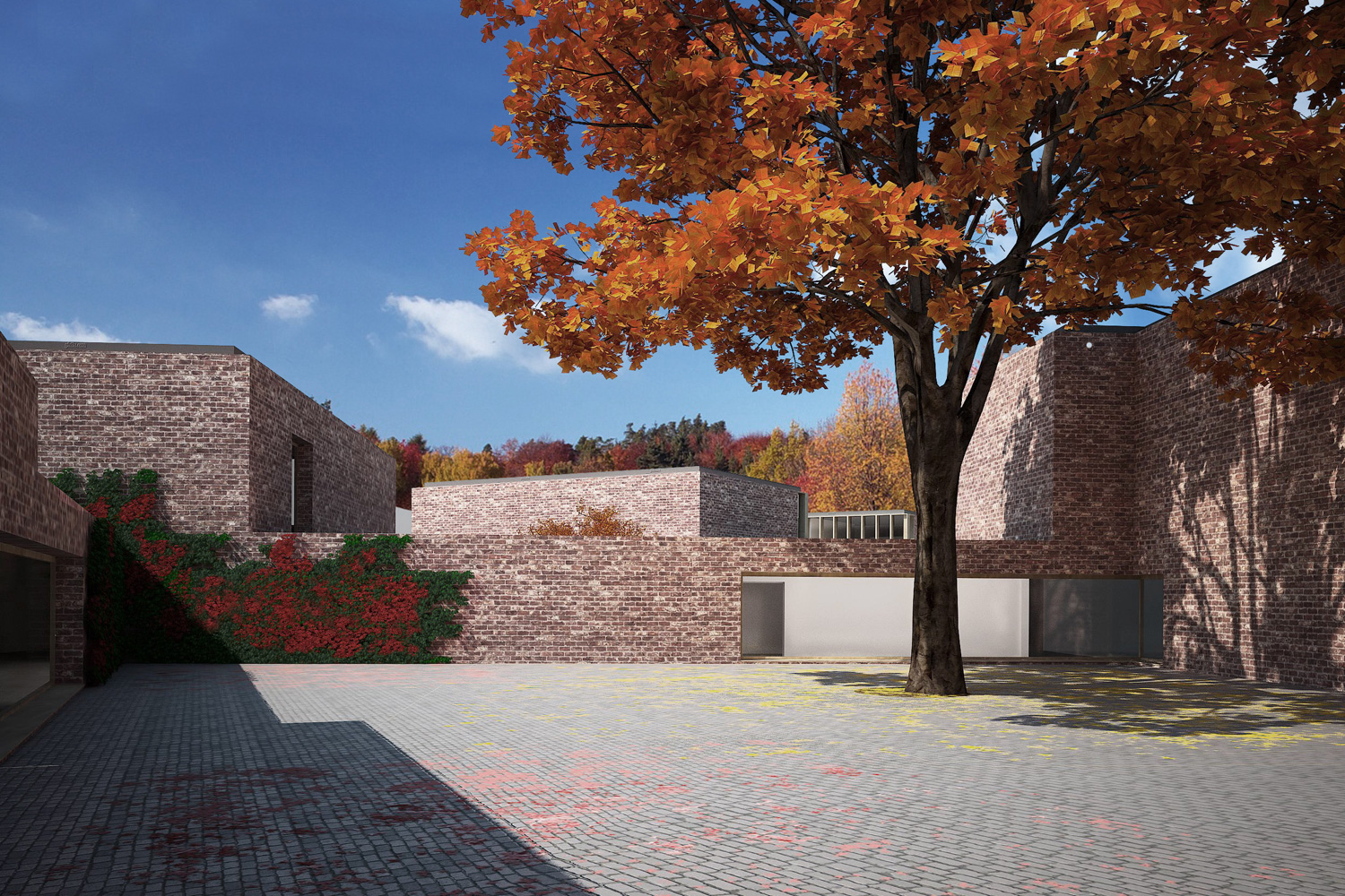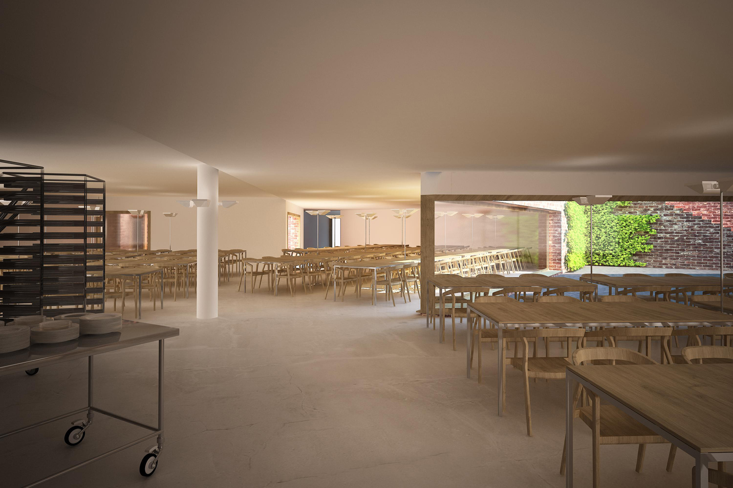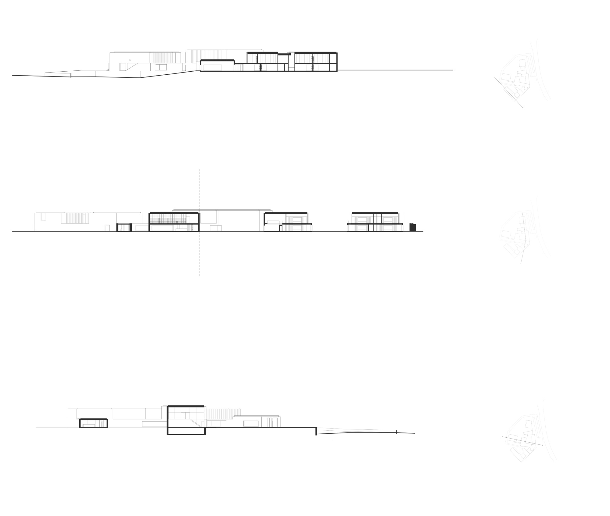 The entrance in the interior spaces of the building is preceeded by a patio that allows a very strict control of the children’s flows. All this central area where the entrance is positioned, retains all the public program (such as canteen, library), that can be used by the three school departments (Materska, Stupen I, Stupen II). The garden is facing West, towards the naturalized landscape. The relation of the building with the garden was solved with a succession of courtyards, with different scales, according to the spaces’ functions facing them. Apart from the central position of the public programs serving simultaneously the three school’ divisions, the sports pavilion is next to the Kitchen, allowing the direct connection in a case of a big event. In terms of phasing the three phases are clearly distinguished, even if they are linked, and each one of them has their own spaces and patios. This allows also to keep the first phase program working while the second phase is built, and the same for the third phase.