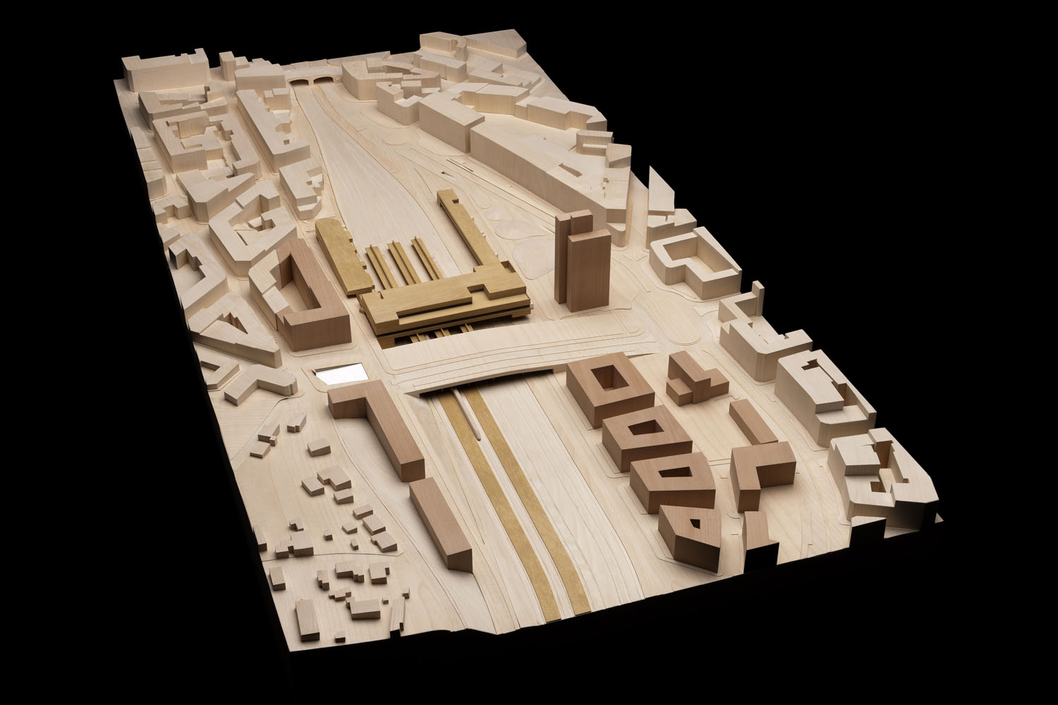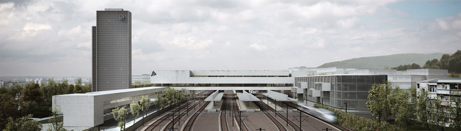 Colocar la estación perpendicularmente a las líneas ferroviarias, apoyada sobre pilares, podría conducir a la imagen de un puente, con una elegante estructura de hierro y cristal. Pero esta primera idea de puente (que es más un objeto de diseño) fue substituida a medida que íbamos entendiendo más la ciudad, optando por un edificio macizo en su expresión, de hormigón armado, dotado de una fuerte imagen urbana, con dos “pies” apoyados en los dos lados de la ciudad. Se pretende “construir” ciudad en continuidad con la existente, diseñando plazas, jardines, rotondas, con otros edificios adyacentes, y sobre todo crear una nueva centralidad, marcada en el territorio con un edificio en altura. ¿Por qué no un hotel, con un pequeño centro de congresos?