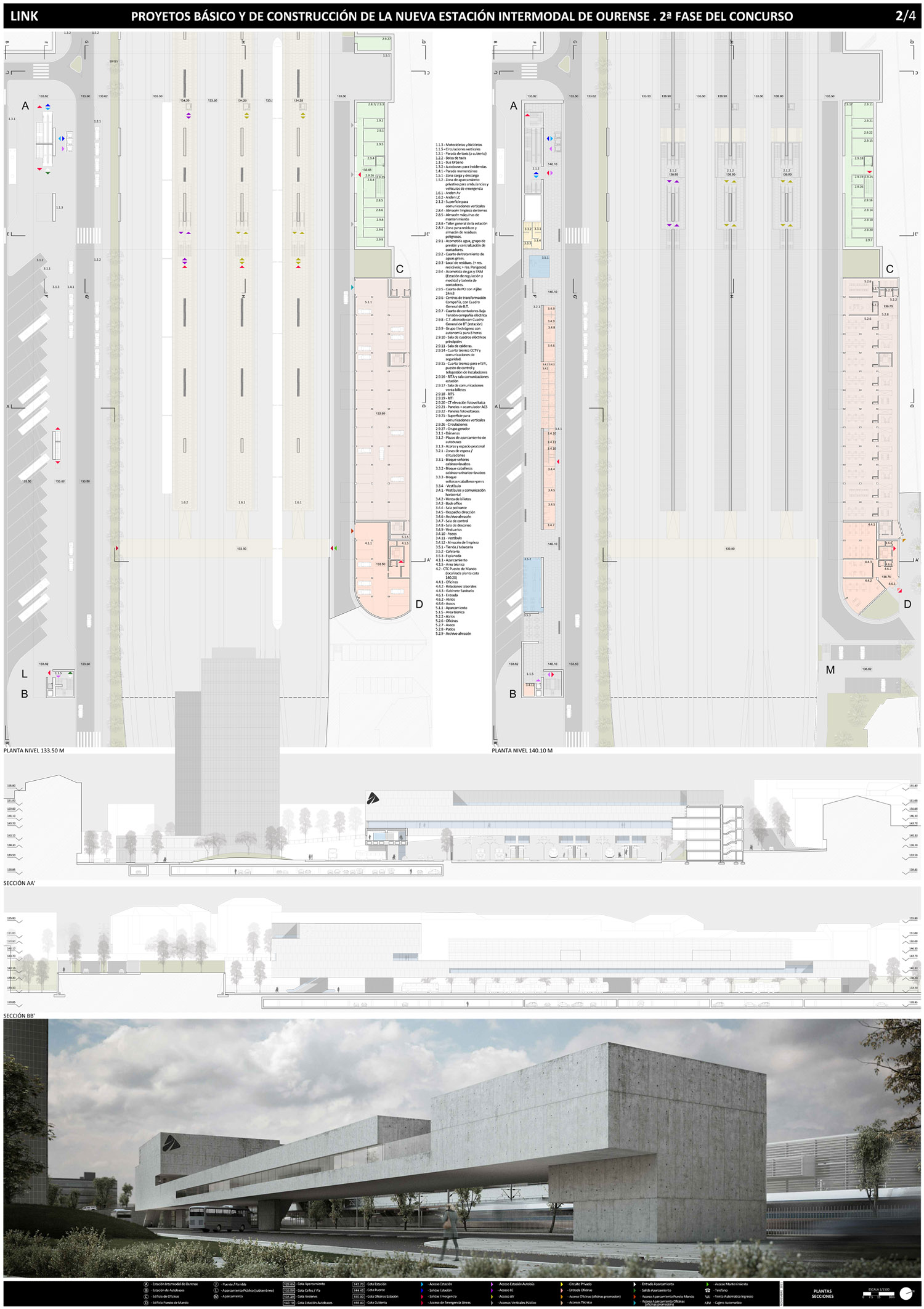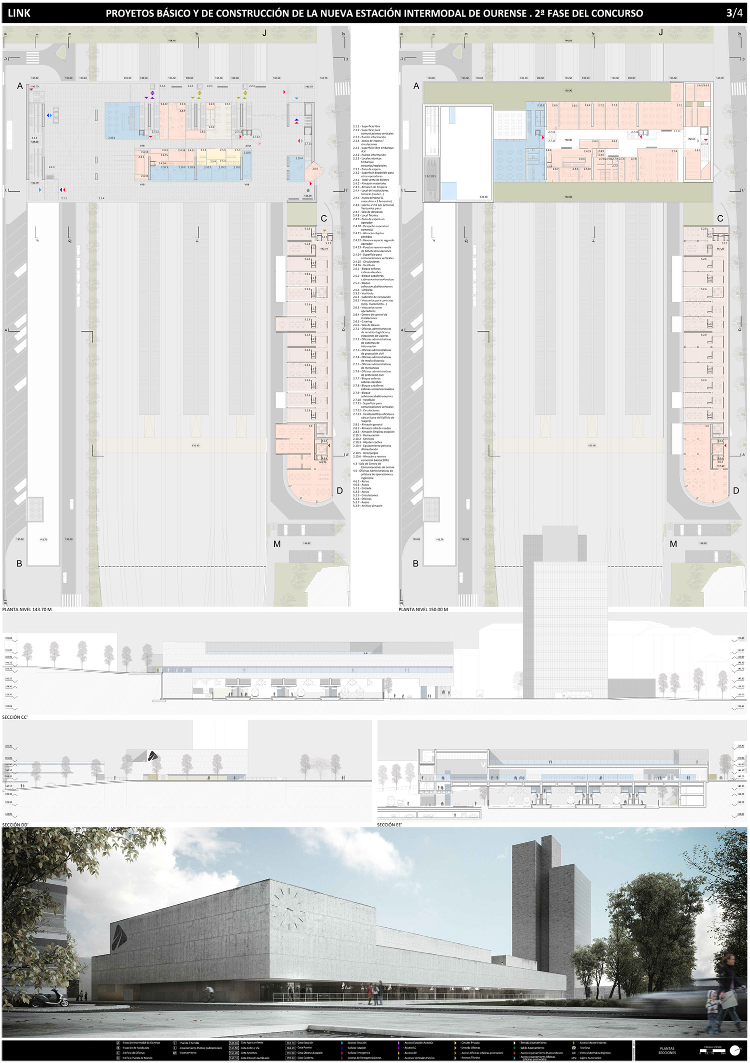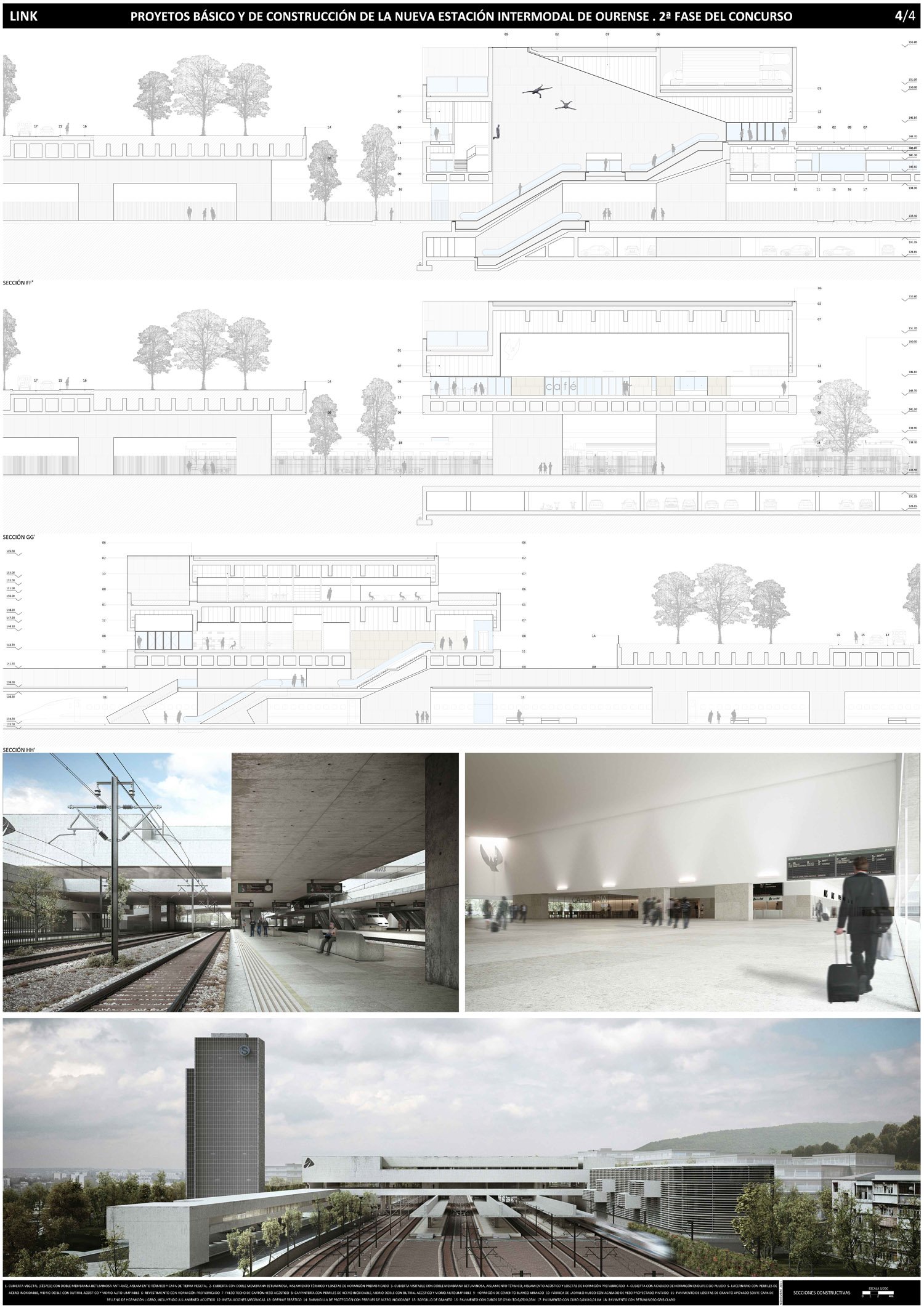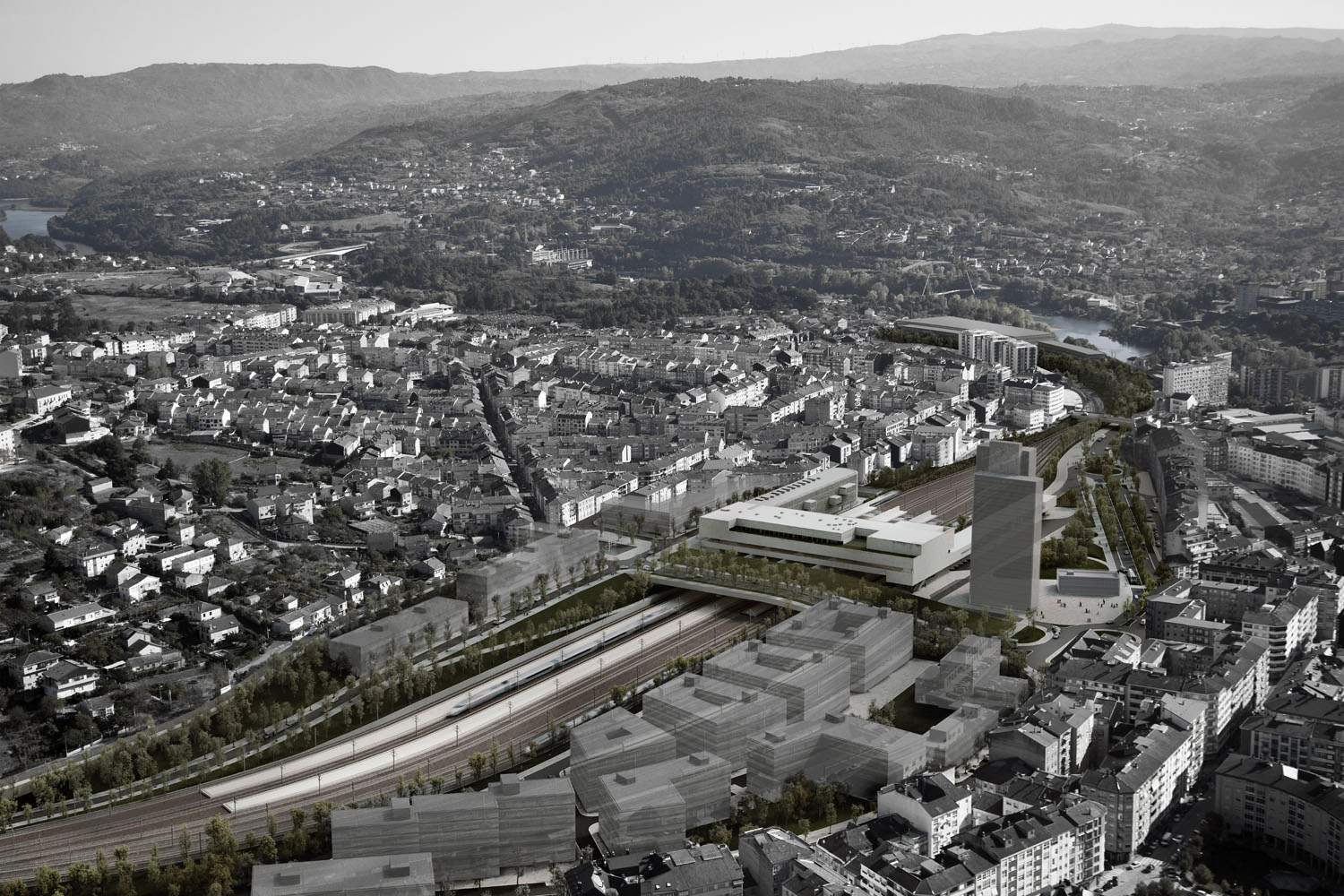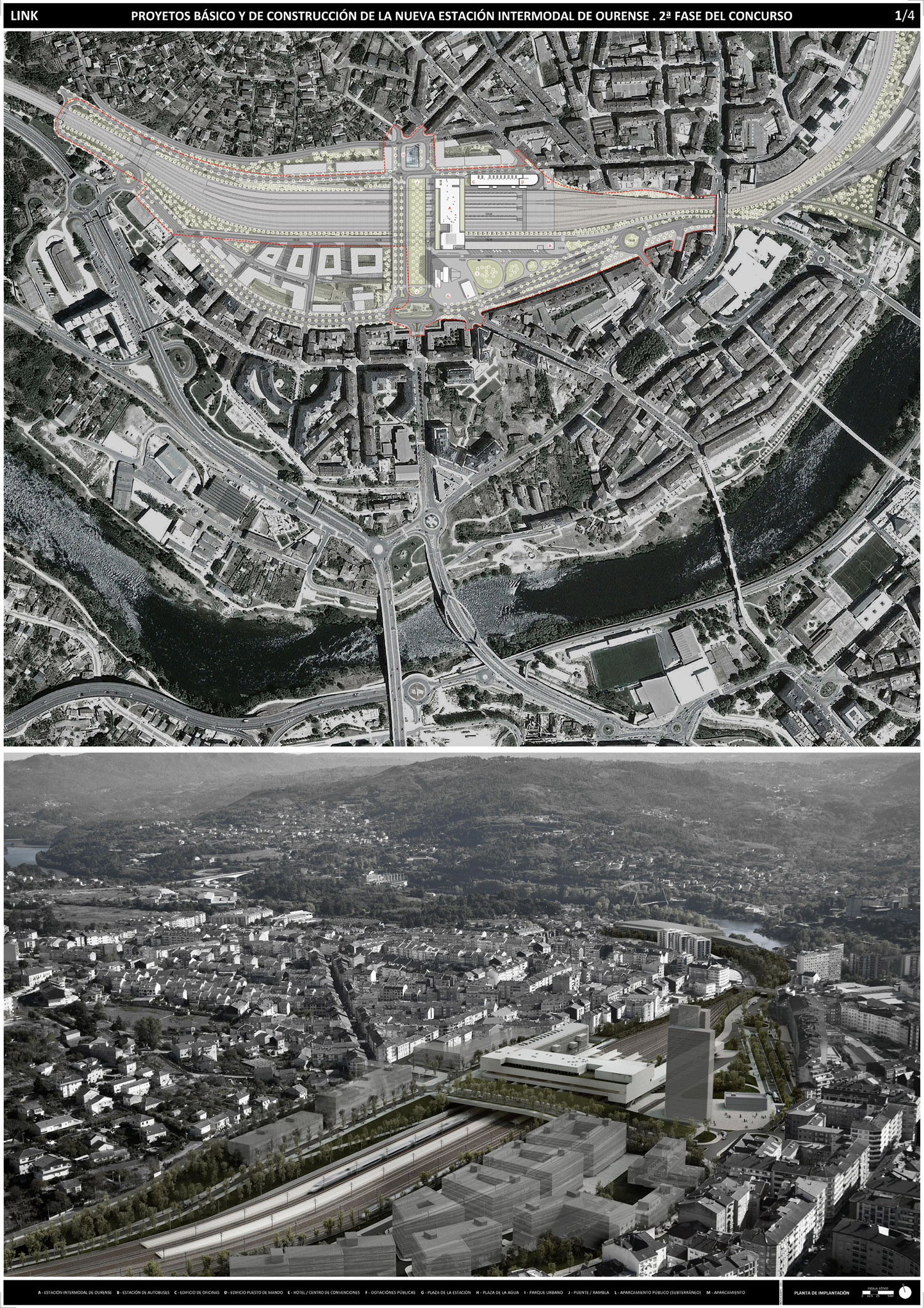 El interés de esta propuesta es exactamente el de querer minimizar la “presencia” de la ciudad fragmentada, siendo el edificio de la nueva estación y sus programas complementarios un factor de conexión y de cohesión entre las dos partes de la ciudad, sin provocar cualquier efecto de corte o interrupción como aconteció anteriormente. Partiendo de la idea del programa de concurso en donde se refiere la necesidad de una conexión entre la Av. de Marín, con una rotonda alargada, y la calle Río Arnoia, al norte, con una plaza de diseño cuadrangular, la propuesta, además de este nuevo puente que sirve al tráfico automovilístico, incluye una alameda ajardinada con 28,00m de anchura. La plataforma resultante de la asociación de estos dos elementos tiene cerca de 54,00m de ancho.