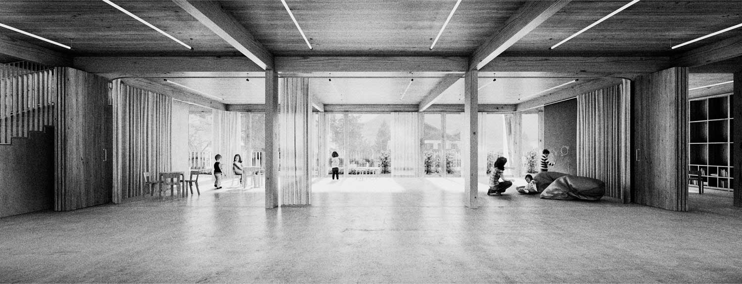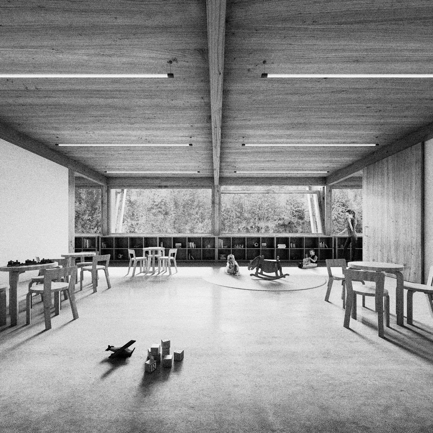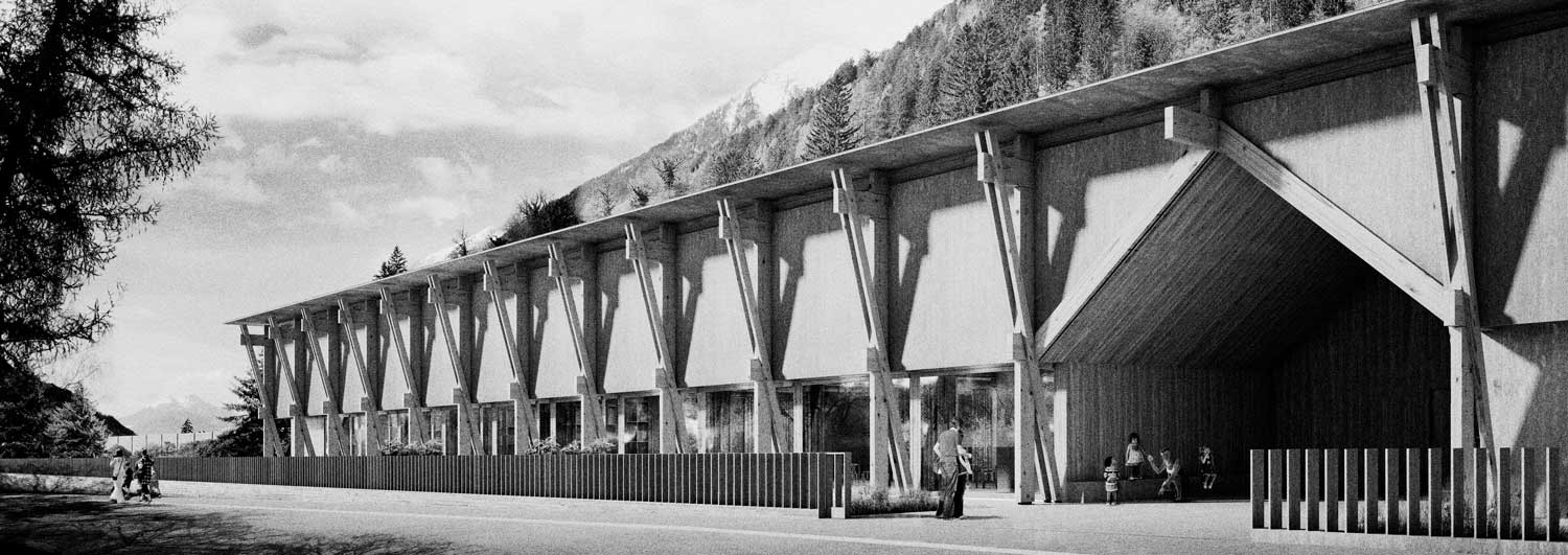 La proposta per la nuova scuola dell’infanzia a San Leonardo parte da un inevitabile rapporto con l’intorno costruito e naturale esistente. Il contesto nella sua ricchezza di elementi e per alcune problematiche presenti, suggerisce scelte efficaci e di grande rispetto, che permettano un intervento significativo in molteplici aspetti. La proposta si colloca all’interno del lotto con una scelta precisa dettata dal rapporto di continuità tra le sue proporzioni e forme con il contesto edificato. Allo stesso tempo assume una differente strategia formale che ha l’obbiettivo di connotare la nuova architettura per la sua importante funzione pubblica all’interno della comunità. L’edificio diventa un elemento di completamento e di nuovo limite a ovest del centro cittadino di San Leonardo, risolvendo visivamente e spazialmente il rapporto con la circonvallazione adiacente al Passiria. L’aspetto volumetrico dell’edificio instaura un dialogo con le architetture esistenti attraverso forme che ripropongono la scala anche domestica dell’intorno. Allo stesso modo la costruzione, attraverso il suo disegno e i materiali proposti, cerca una nuova e differente identità, che viene delineata con l’utilizzo di materiali correnti e locali ma con un senso espressivo non consueto. I limiti dell’edificio nel rispetto dell’area di concorso e delle distanze, sono collocati con una geometria semplice lungo la direttrice principale nord sud.