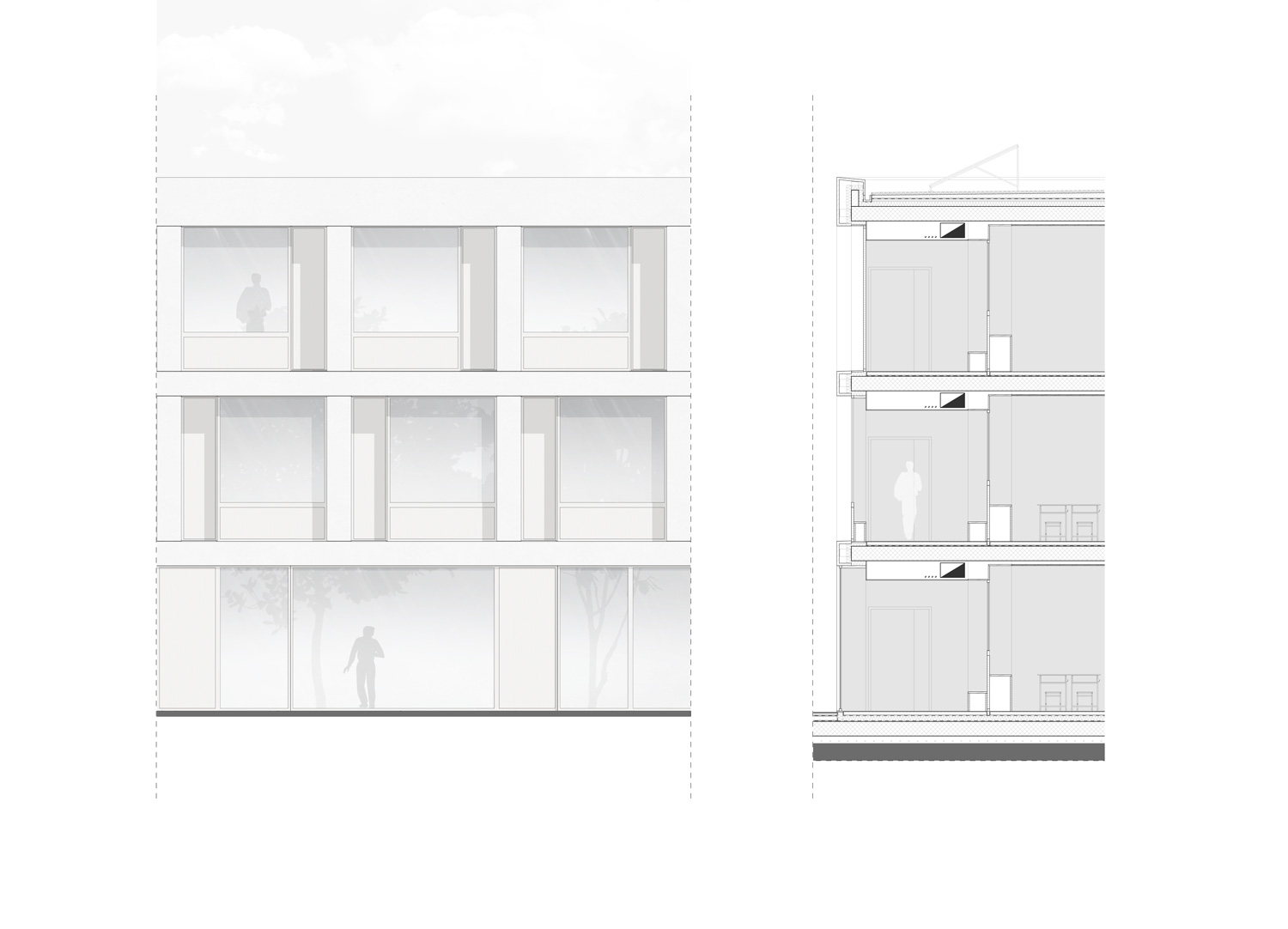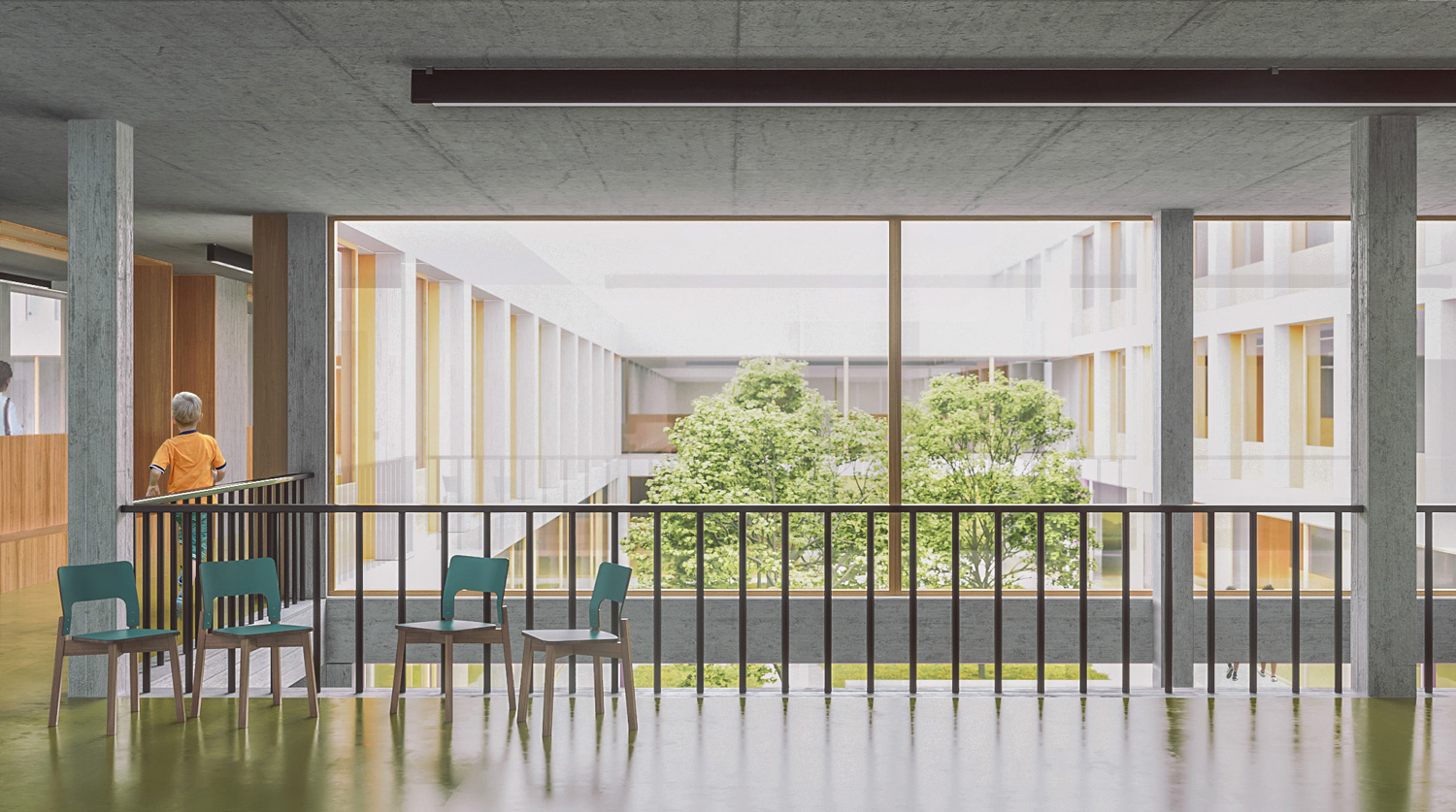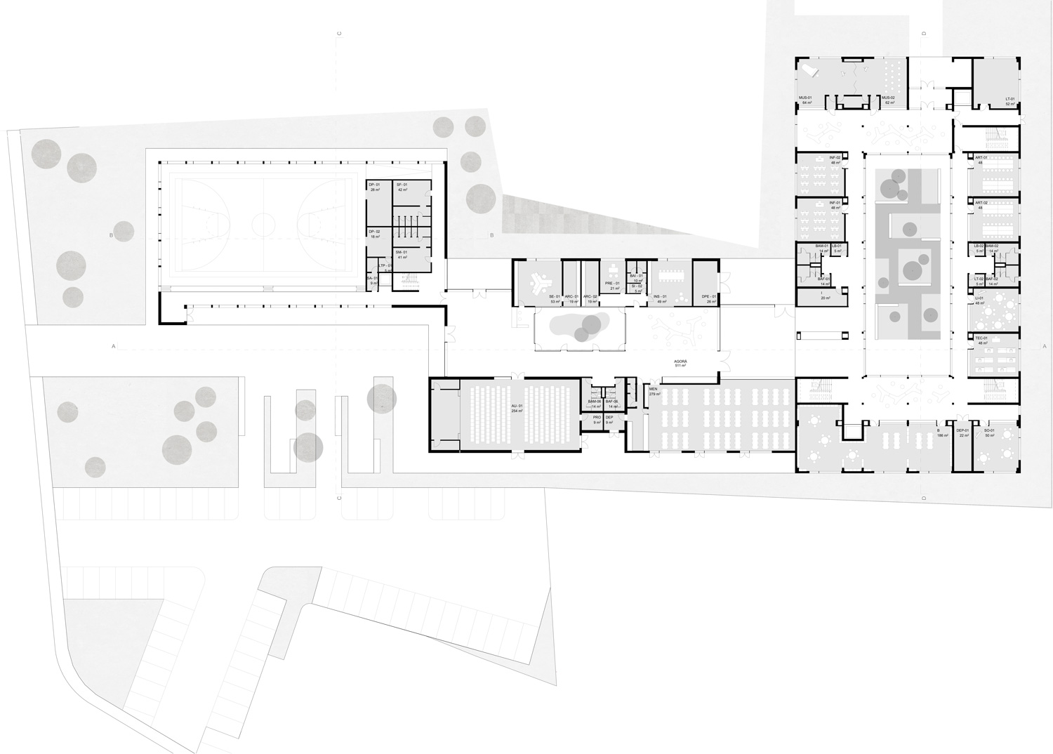 A central patio offers a protected garden where students can spend recreations or organize outdoor lessons. The complex has a service access from the north with a private car park for the teaching staff. Around the building there is a green belt to protect and improve the urban environment.