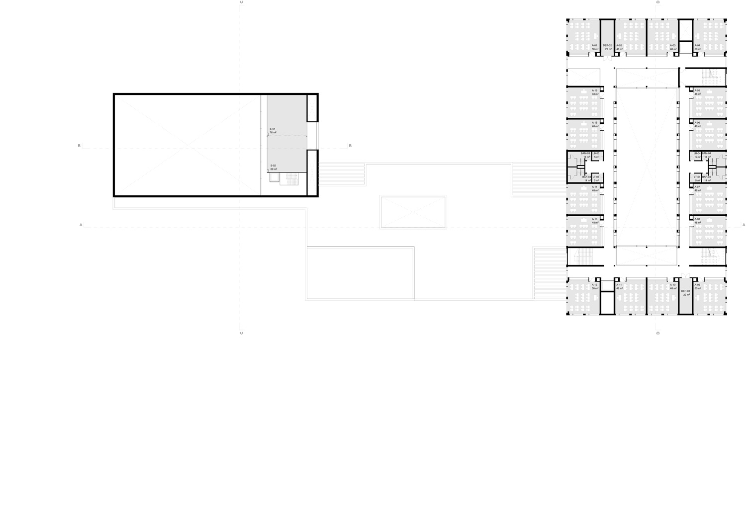 The new square of the school complex is configured not only as a place of entry or meeting but at the same time as a showcase for the sports activities of the gym where parents can wait for children to find themselves safe from traffic. The meeting between the front of the school foyer and the front of the sports facility is characterized by a covered niche that offers a sheltered place. Crossing the threshold of entry we find a reception inside a filter space that allows access to the functions available to the whole community such as the gym and the auditorium. This first space is followed by a large agora that can be set up to replace the auditorium for smaller meetings or performances.