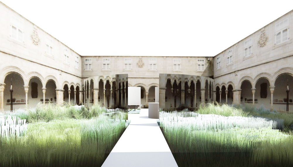 Asimismo, parece que el origen de este tipo de estructura, que aparece en diversos claustros medievales y de épocas posteriores, puede hallarse en los pabellones de recreo que se levantaban en los jardines de los palacios hispano-musulmanes, tradición que fue asumida por los cristianos conquistadores. Se trata, en este caso, de un elemento de mobiliario que puede ser desmontado sin implicar impacto sobre el claustro. Se realiza en estructura metálica con un cierre en chapa de acero inoxidable pulida al exterior. Sobre este cerramiento se reflejan las fachadas del claustro y el propio jardín de modo que el elemento se desmaterializa, intentando desaparecer. Por contraste el interior se reviste en chapa de acero lacada en color blanco mate. Se crea un espacio recogido que puede servir de soporte para la exposición de elementos del propio museo, con carácter temporal. La sobriedad arquitectónica propia de las edificaciones franciscanas y mendicantes se traduce en el intento de que el pabellón central planteado “desaparezca” mediante el uso del reflejo como estrategia arquitectónica. ( ver “Da negación da arquitectura a unha nova topografía do mosteiro de carácter monumental: o convento dos franciscanos e unha revisión das supostas características dos edificios dos mendicantes” de Isidro G. Bango Torviso, incluido en la publicación “O claustro franciscano do Museo Provincial de Lugo” en las páginas 13-43).