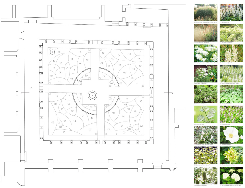 El uso predominante de gramíneas y herbáceas perennes (vivaces) pretende conseguir un jardín básicamente herbáceo, que aportará ligereza y liviandad así como un tratamiento etéreo de la vegetación. Este tipo de vegetación hace percibir más claramente si cabe el paso de las estaciones, ya que gran parte de ellas marchitan en invierno para renacer en primavera. Por lo tanto, el claustro tendrá un carácter cambiante a lo largo del año. El segundo aspecto que trabaja la plantación planteada es la creación de un ambiente neutro, para así potenciar y centrar la atención en el uso expositivo del claustro en el museo. Dicha neutralidad y sosiego las transmitirán el colorido tanto de las floraciones como el follaje de las plantaciones que tienden a los tonos blancos y glaucos.