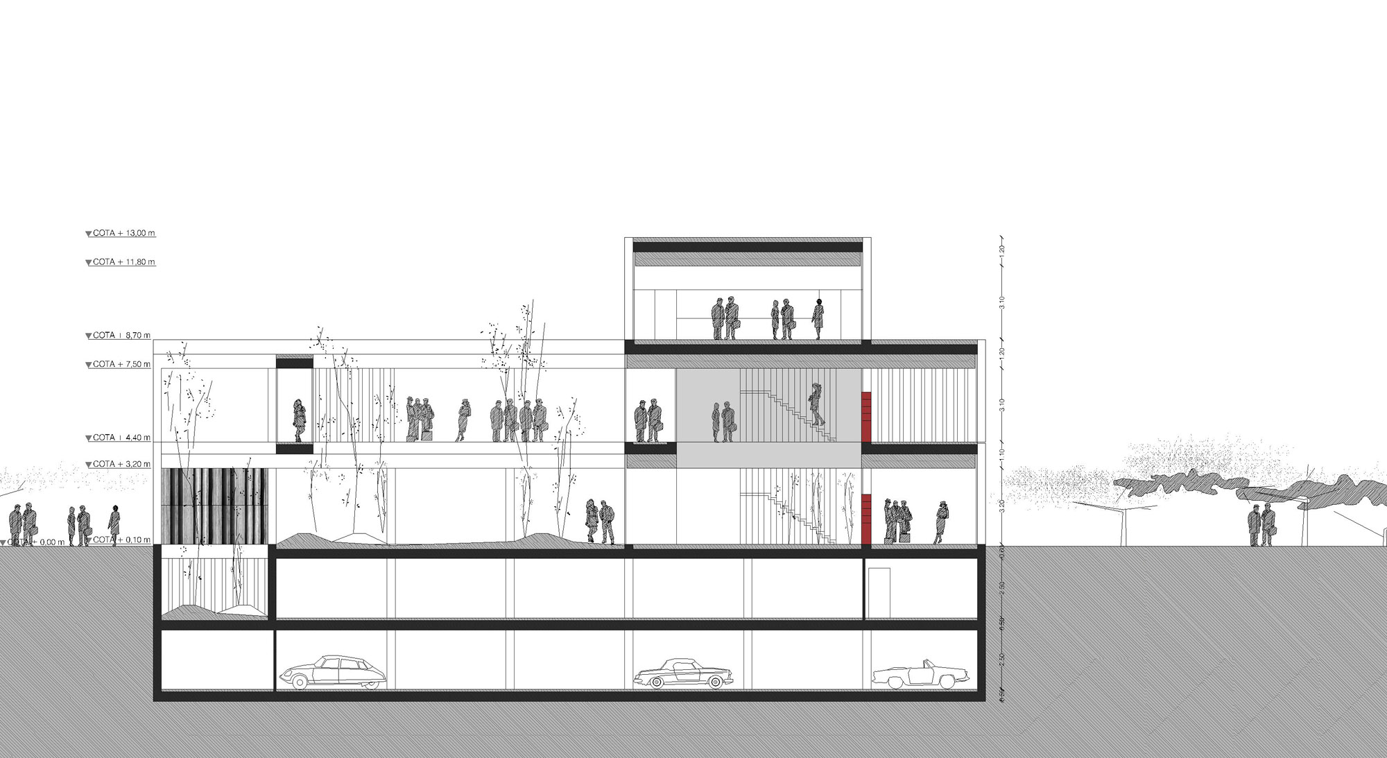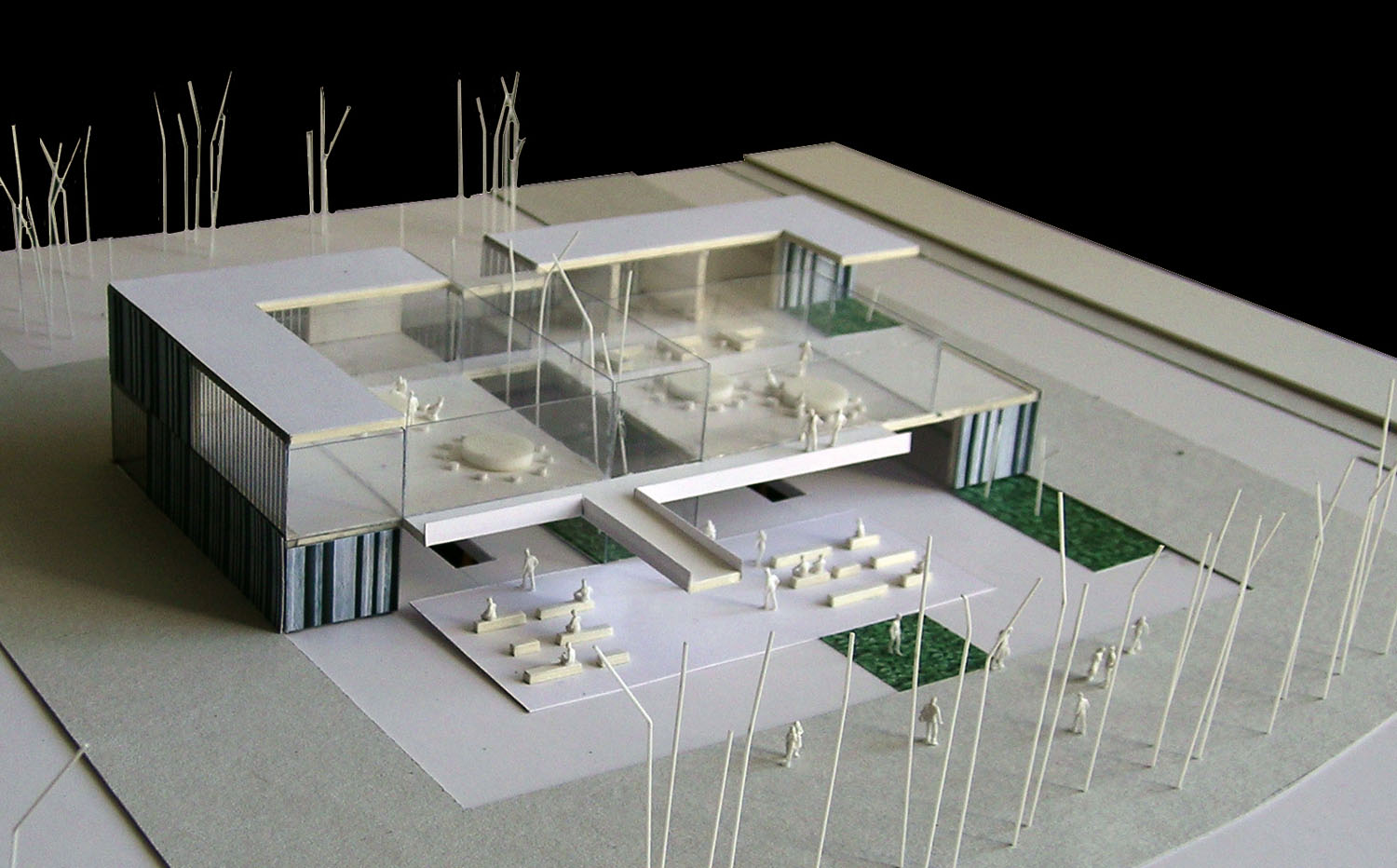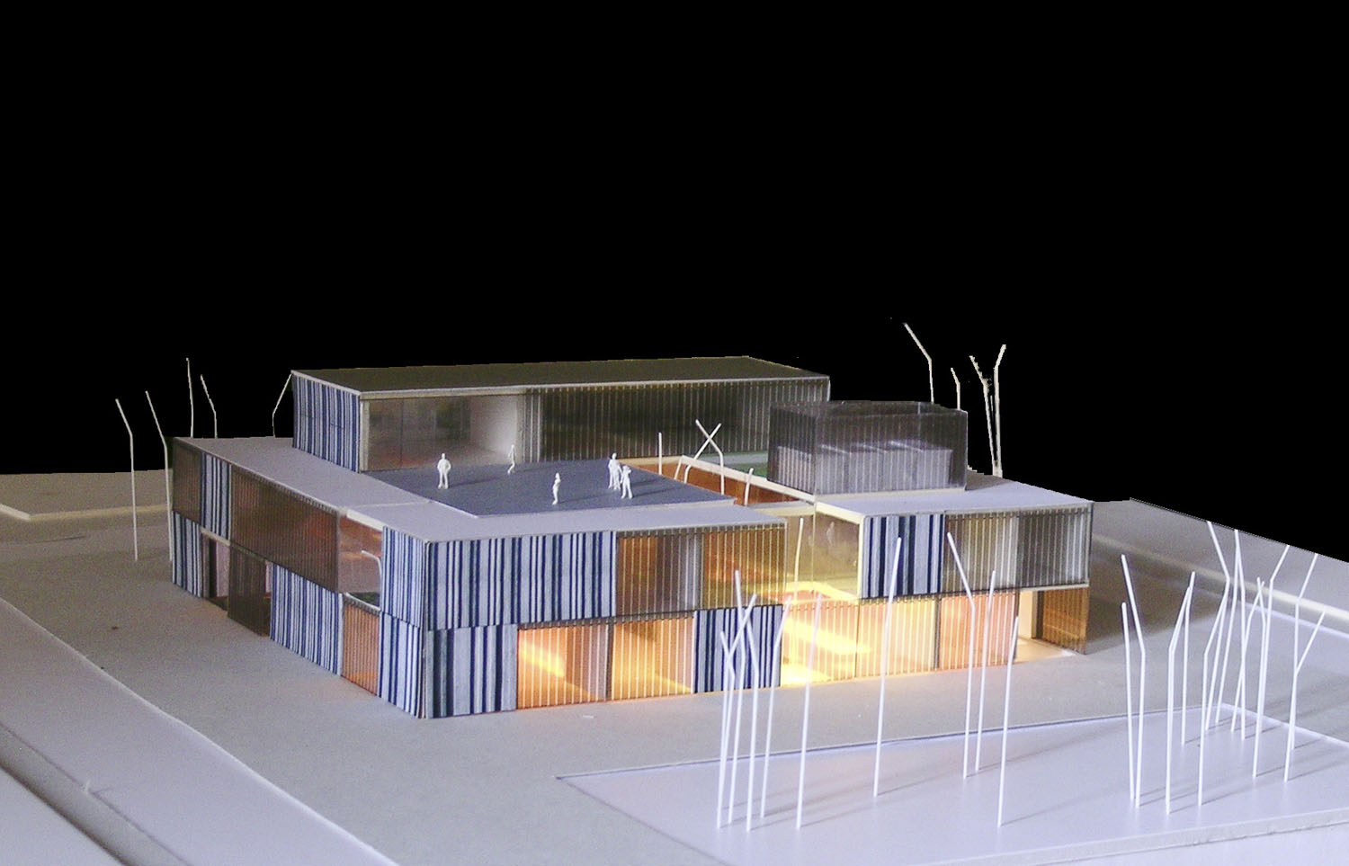 Dadas las características indicadas por la normativa urbana, el proyecto se organiza como una edificación aislada que ocupa toda la superficie de la parcela Se propone un edificio con una volumetría compacta y una apariencia equivalente en todas las direcciones. Esta decisión se toma por el modo en que el edificio se presenta ante la ciudad en una zona que previsiblemente será de viviendas de baja densidad. Dado que el edificio no puede ser representativo por sus dimensiones en superficie o en altura, se propone un tratamiento elaborado de las superficies de fachada mediante la sucesión de paños de hormigón y lamas verticales, que se adaptan a las condiciones de los espacios que se distribuyen en el perímetro del edificio.