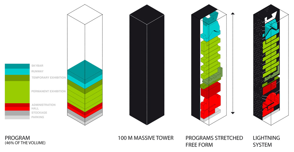 La tour est généralement envisagée comme une recherche de performance, de rationalisme architectural, un point de densité dans la ville; Le concours nous pousse à remettre en cause cette approche de la densité: un volume hypothétique de 100m de haut pour seulement 46% de remplissage, que faire des 56% restants ?