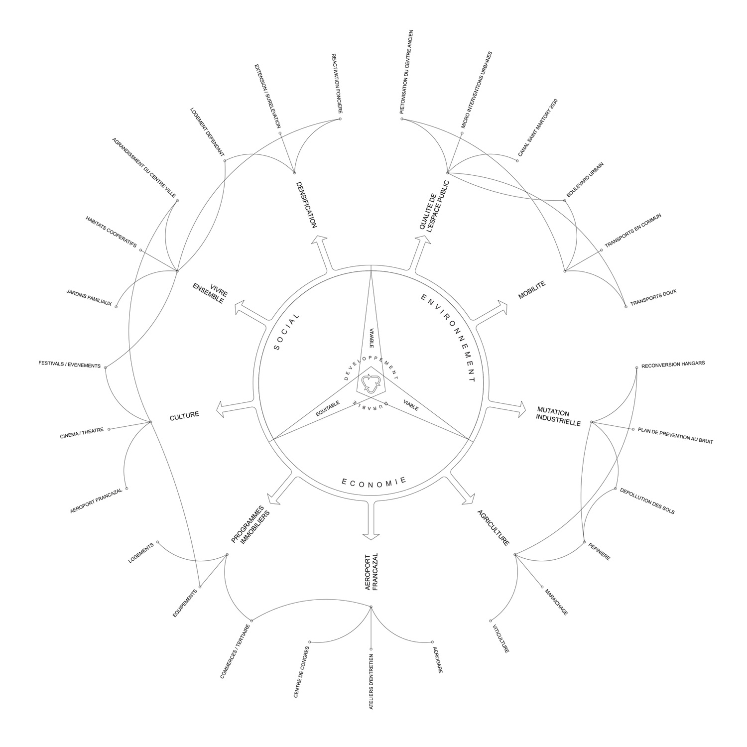 Cette superposition entre les enjeux et les échelles de territoire définit un schéma d’intervention sur la ville par 27 actions concrètes pour permettre à Cugnaux de répondre aux problématiques d’aujourd’hui et de demain.