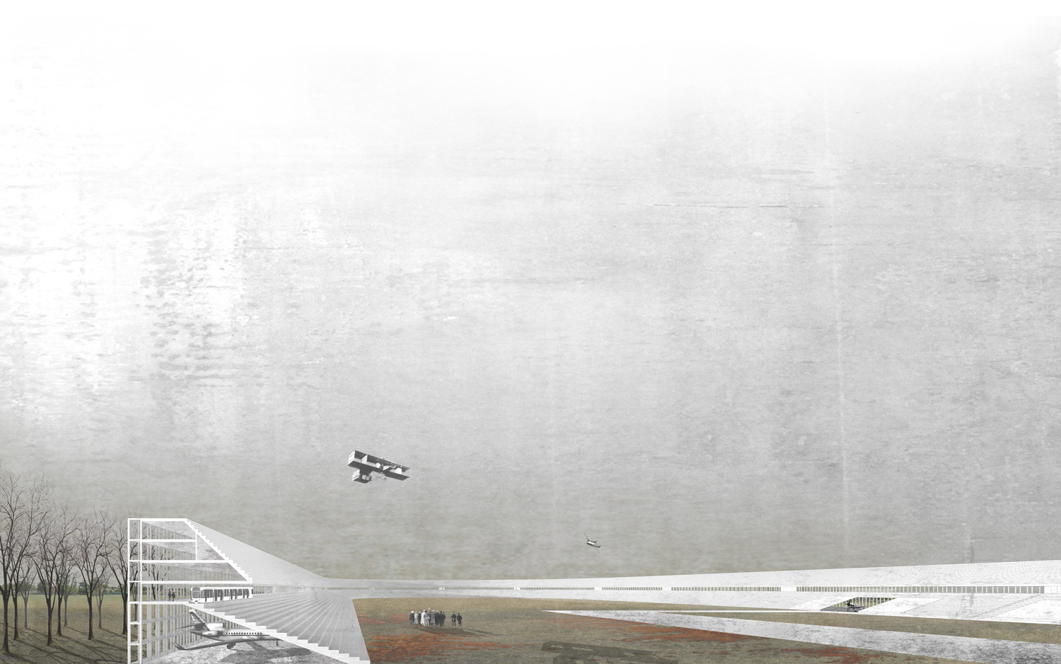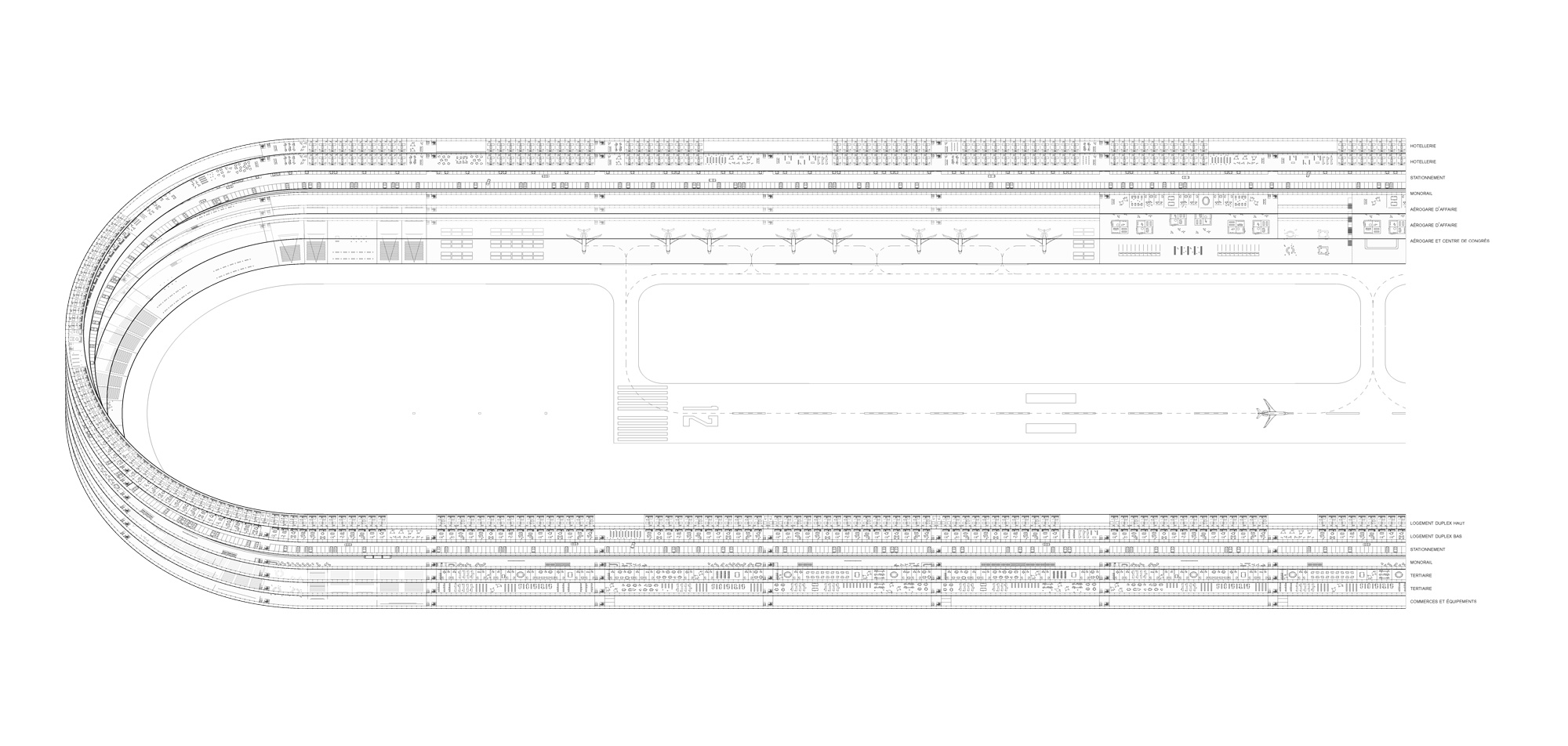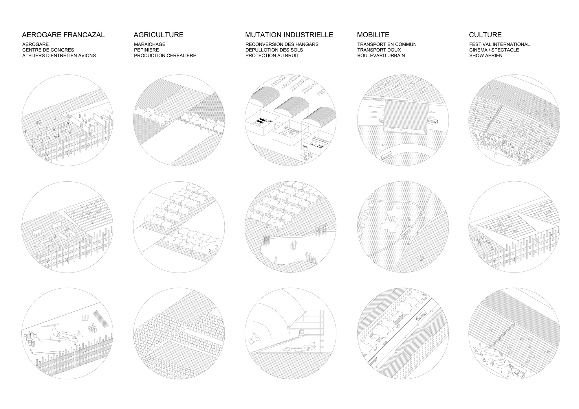 La présence de la base Francazal est un grand atout pour Cugnaux. Le territoire communal possède des infrastructures d’aviation et une grande réserve de foncier disponible. Suite à l’abandon partiel de la base par l’armée, la proposition se base sur l’exploitation d’un aéroport d’affaire sur le site de Francazal. Or la contrainte principale du bruit généré par les avions empêche l’utilisation du foncier disponible sur ce terrain. Oppidum Capit est une grande enceinte autour de la piste pour contenir le bruit de l’aérogare. La métropole toulousaine profite de cet équipement aéroportuaire existant en diminuant les nuances pour le voisinage immédiat. Profitant de l’aérogare d’affaire, ce mur anti bruit épais devient un bâtiment à plusieurs programmes. Sur l’aile nord l’aérogare d’affaire (60 000m2) associée à un centre de congrès (40 000m2) et un grand hotel (13 000m2) et 1 600 places de stationnement. Sur l’aile sud des équipements culturels conséquents en rez de chaussée (40 000m2), des plateaux de bureaux (80 000m2), 1 000 places de stationnement, et des logements dans les niveaux hauts (500 logements). Un niveau intermédiaire est dédié à une circulation horizontale continue. Le monorail, à une cadence de 10minutes, fait la navette entre les ailes.