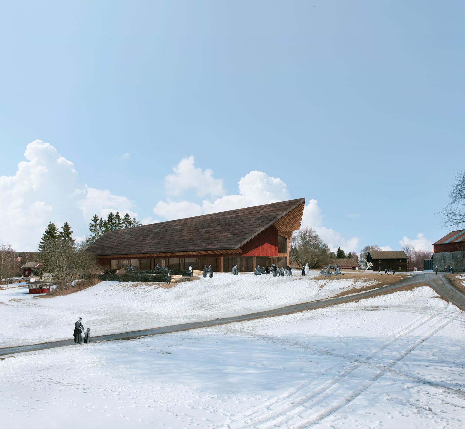 Our design strategy is to make a roof aggregation that responds, with its undulating forms, to the widely varying scales of the surrounding buildings. The roof serves as a guide that directs one gaze to another, as it transfigures like origami to respond to sightlines. Made in copper, it sits atop a light structure made of wood and glass. The entire ensemble alludes to an aesthetic blend between the visual transparency of the Hamardomen and the warm textural quality of wood that characterizes Storhamalaven.