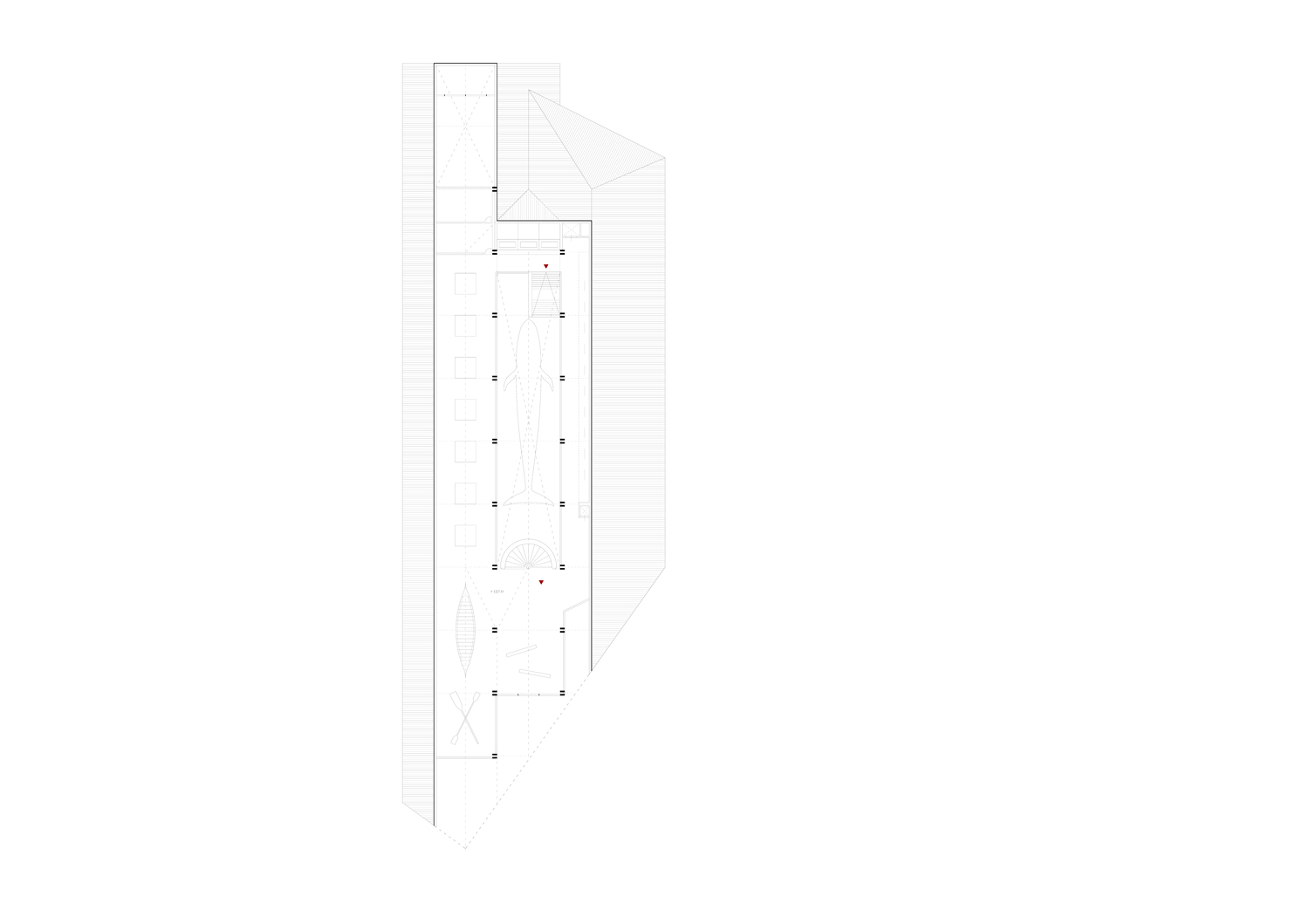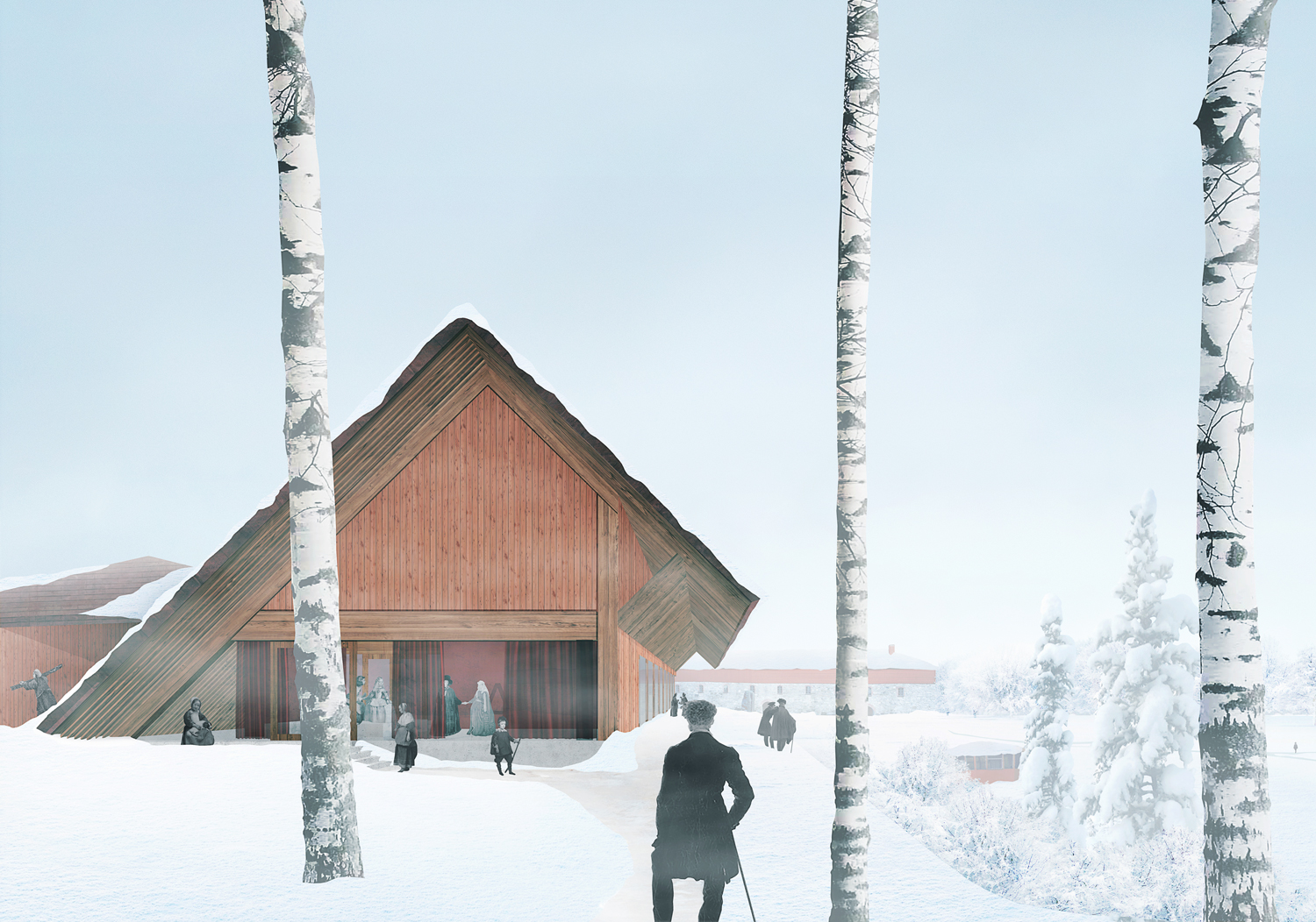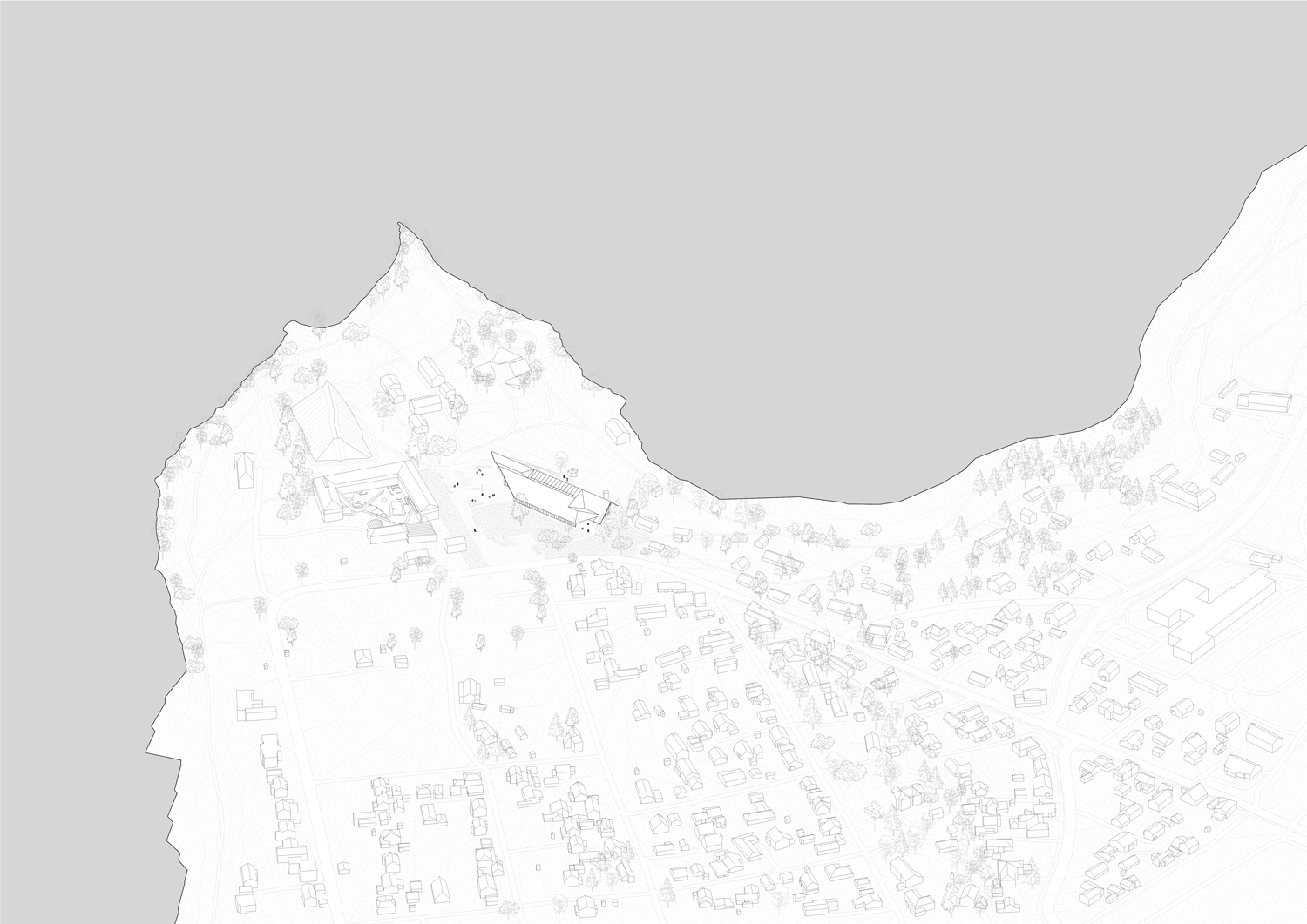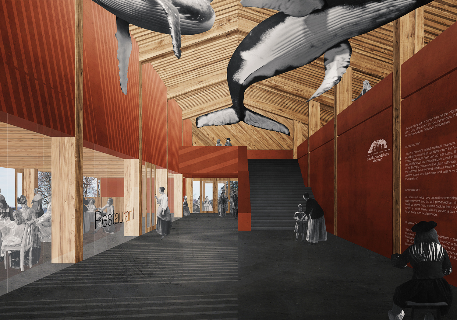 A levitating origami roof creates a strong first impression for the visitor who arrives from the north to the landmark historical site of the Domkirkeodden Museum. Reminiscent of the traditional timber roofs of Nordic climate zones, yet contemporary in its form, the proposed extension’s vast and expressive roof acts as a marker in the landscape—a marker that signifies its function as a threshold towards the cultural facilities in Domkirkeodden.