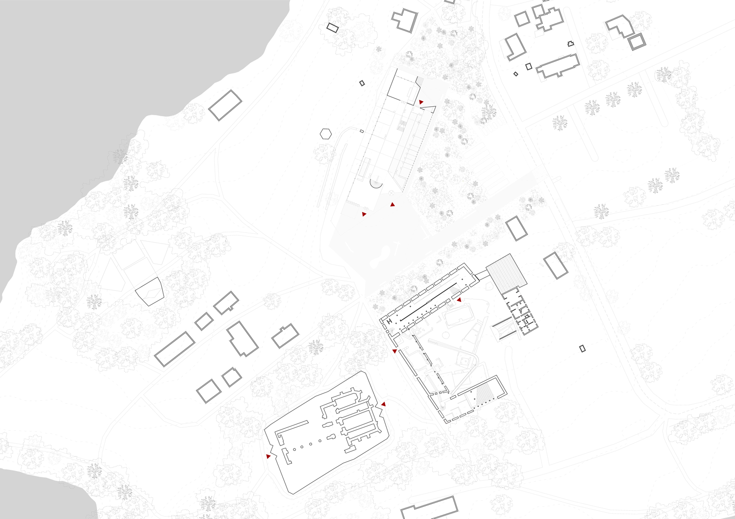 The scattered character of the built environment at Domkirkeodden demands a critical awareness of how significant the in-between spaces between buildings are in shaping the overall experience of the park. A crucial component of our proposal, therefore, is the Plaza that will be shared between the proposed extension and Storhamalaven and Hamardomen. This Plaza will help to integrate the new and old museums into a cohesive whole, acting as a new outdoor public space that ties the urban fabric to the north of the site with the cultural facilities to the south. This happens as the new museum funnels visitors through it and out it, through the southern corner that opens out towards the old museums.
