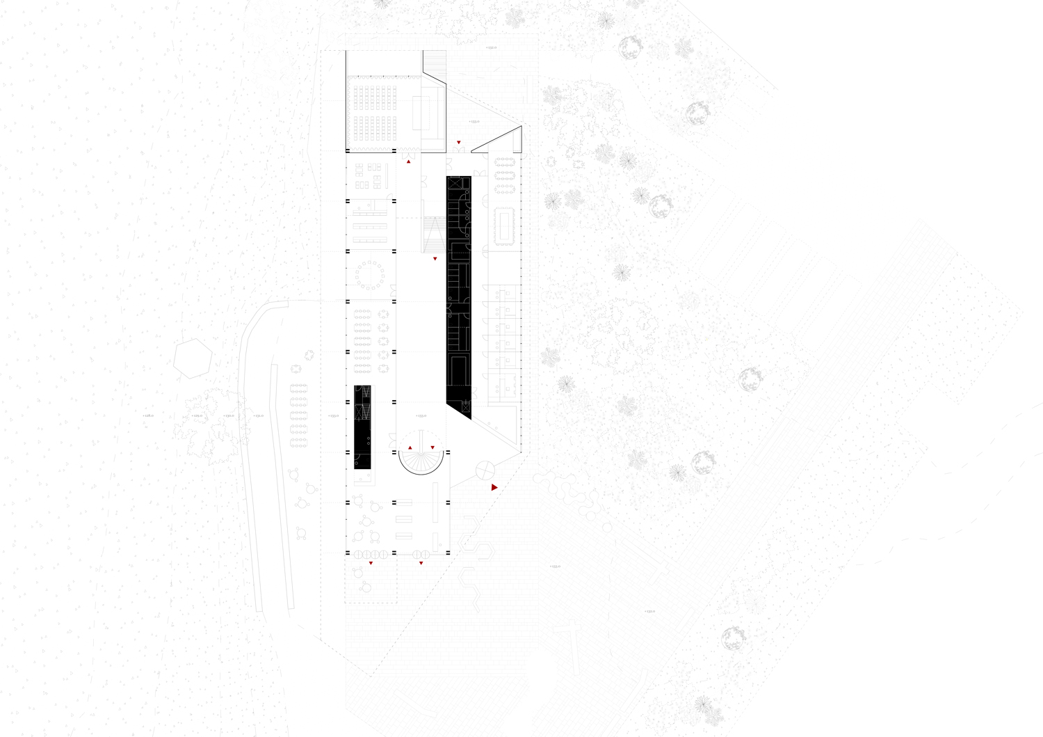 The proposed extension also functions as a threshold between the Park to the west and the Plaza, with a semi-open space under the roof allowing for a seamless integration between the indoor and outdoor spaces. Penetrating throughout the building’s central axis is a sky-lit linear public space, which can serve as both a temporary gallery space or as a multifunctional space for hosting events.