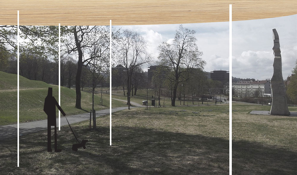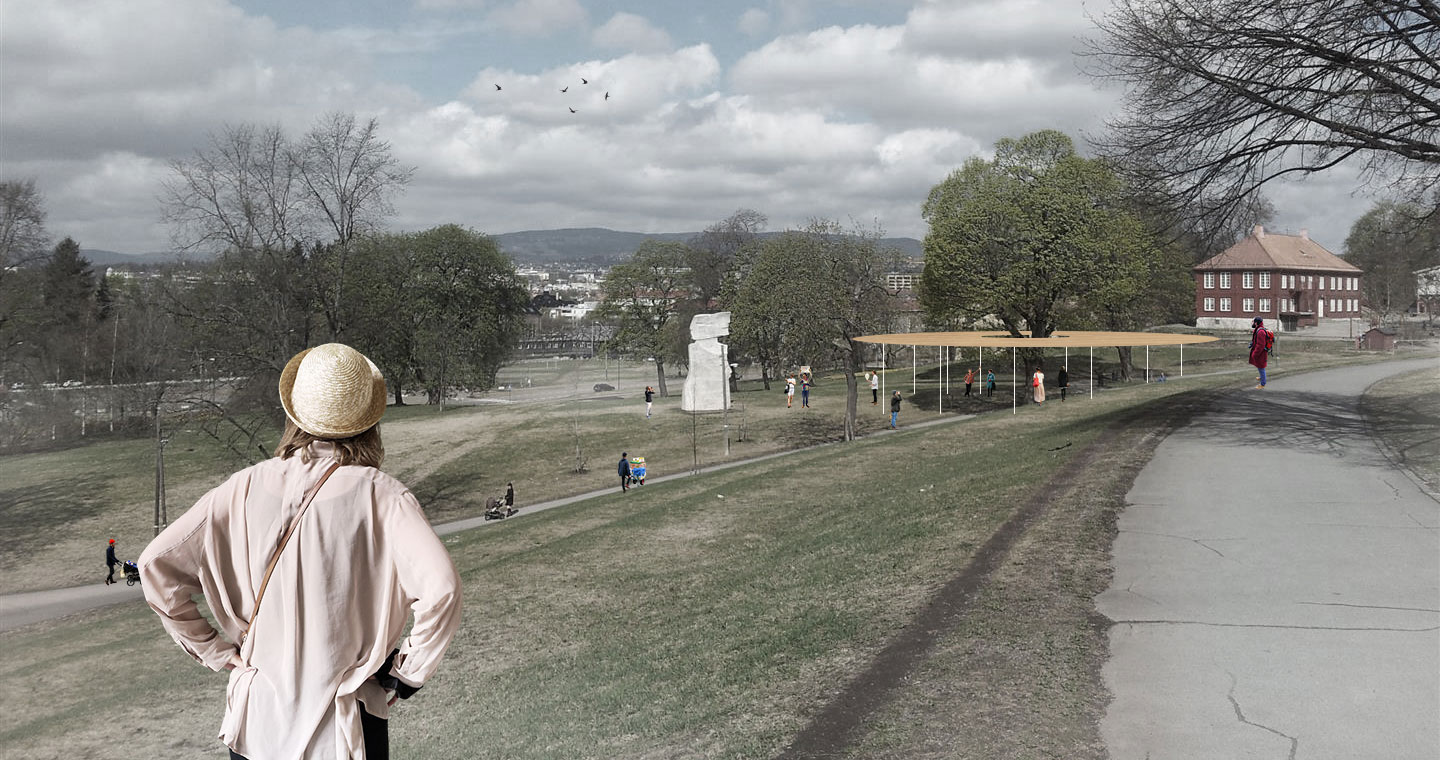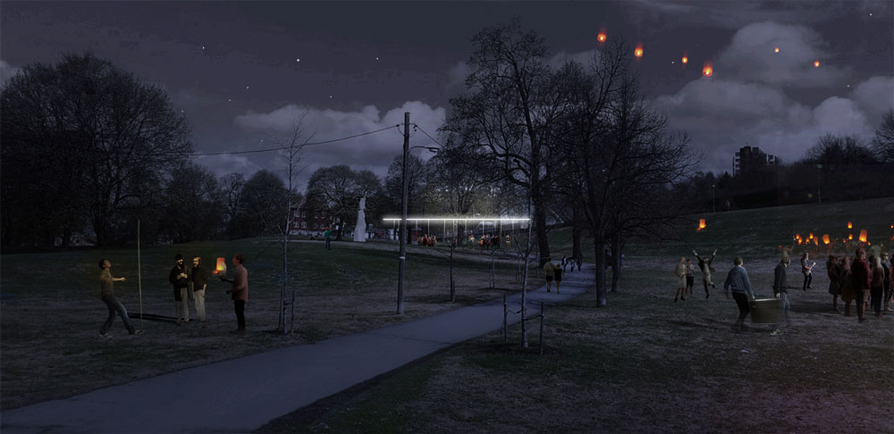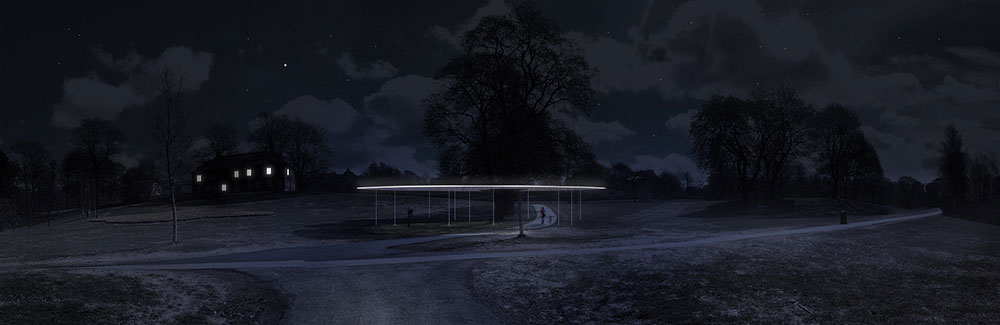 The idea of the O is to link the quality of the landscape to the steady flow of festival goers. The project accentuates a natural meeting point by circling a solitary tree on the hill. This intervention enhances the spatiality found under a tree’s canopy to create a visual vantage point that frames the surroundings. The intervention creates a space for social interaction while simultaneously creating a clear expression of the latent potential in enhancing qualities in our environment. The O points outwards from the tree as a vantage point to the festival and the vista of the Oslo Fjord. The O lies in a perfect horizontal line and meets the height of the tree tops portraying a stark contrast to the natural elevation in the hilly landscape. With its circular disc, the design meets the scale of the landscape and functions as a natural meeting point for interaction between festival goers. The solitary tree is the centre point of the disc and penetrates it seamlessly so the outline of the canopy traces the inside of the disc. At dusk the O lights up as a beacon with a direct visual connection to all stages – binding the site together and framing a space for interaction.