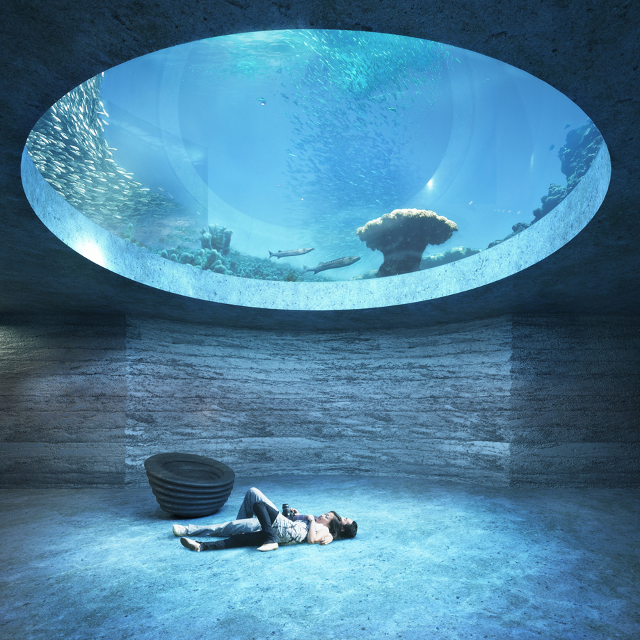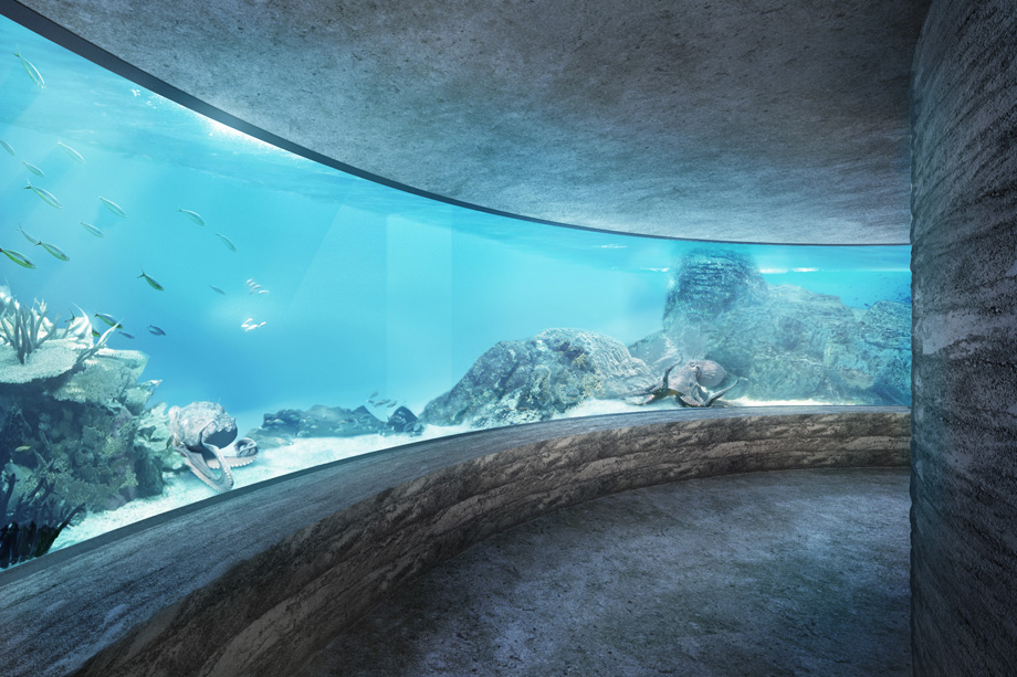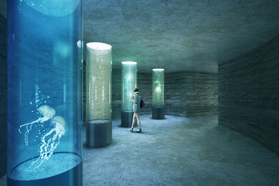 In the top floors the interior walls more closely resemble the earth above water. The same principle of a varied aggregate is used on the exterior façade, which is to be constructed out of a rammed concrete (trass-limestone mixture). At increasing height, the mixture of the rammed concrete becomes finer and lighter corresponding with the earth above sea level. The spatial concept of the Aquarium is based on the idea of controlled sequence of spaces. Each aquarium has its own spatial geometry. The exhibition presents itself as a continuum of precisely composed spaces, which invite the visitor to linger while still providing a constant sequential flow.