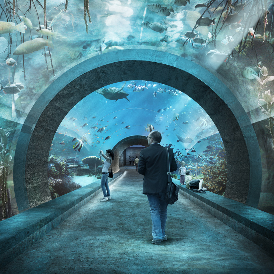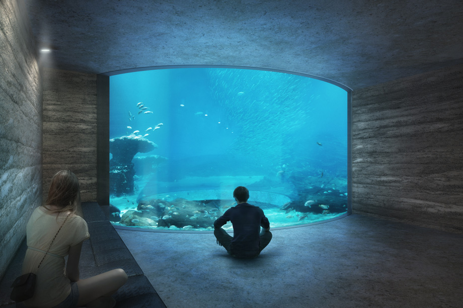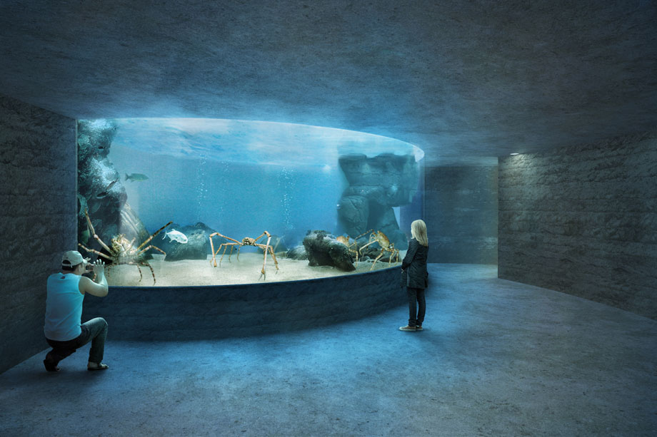 By burying a large part of the exhibition and technical spaces, the above ground building volume remains reduced in scale and directly responds to the surrounding urban context. Through cantilevers, subtle carvings and deliberate punctuations in the massive façade, the building is anchored into its city context. Because of its reduced architectural language, the aquarium appears to be monolithic and mysterious from the outside. The interior functions are only partially revealed through the openings in the façade, intriguing and inviting passersby to take part in an exploration through the oceans of the world. Varied material concepts along the path through the international oceans assign value and meaning to the journey. To some extent, the path is a section cut through a rock in the breakers, as it were, penetrating deep into the world of the sea dwellers. To this end the interior rammed-earth walls are pressed with varied sedimentary layers, figuratively representing the reef walls around the world.