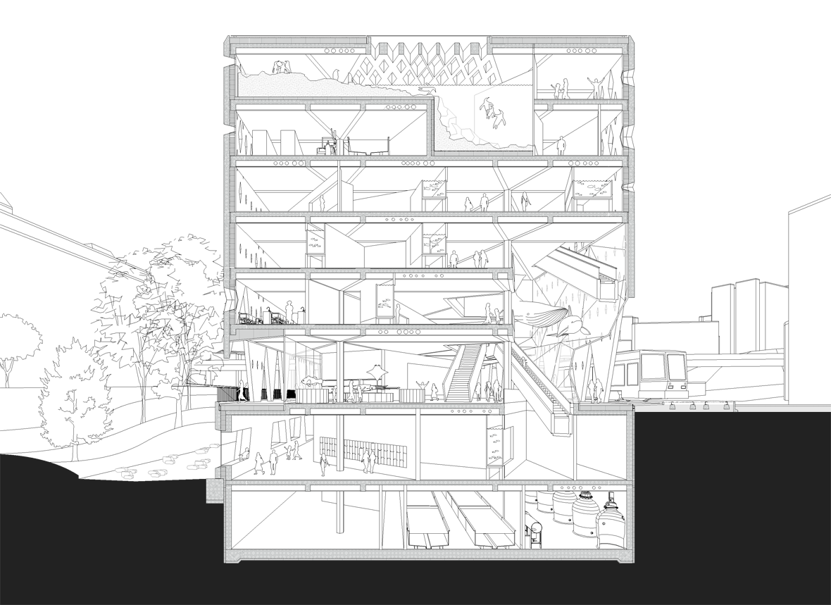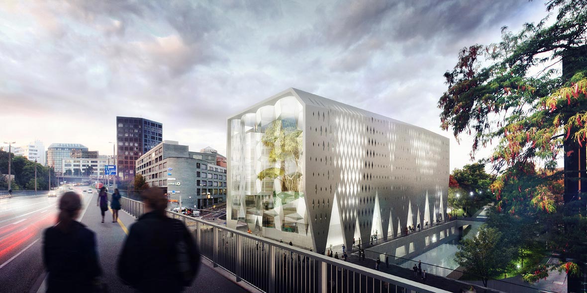 Die rautenartig geschuppte Gebäudehülle – in weissem Sichtbeton materialisiert – zeigt sich an den beiden Längsseiten – als aufgeständerte, im Habitus geschlossene Struktur, während sich an den Stirnseiten grosse, volumetrisch strukturierte Glasstrukturen zeigen. Zum neuen Platz hin werden die öffentlichen Nutzungen sichtbar, während als Identitätsträger in Richtung Heuwaageviadukt und zum Stadtzentrum hin ein Mangrovenwald in einem grossen Fenster wahrnehmbar wird. Dieser Mangrovenwald wird sowohl von innen in der Ausstellung wie von aussen aus dem Stadtraum intensiv wahrgenommen.