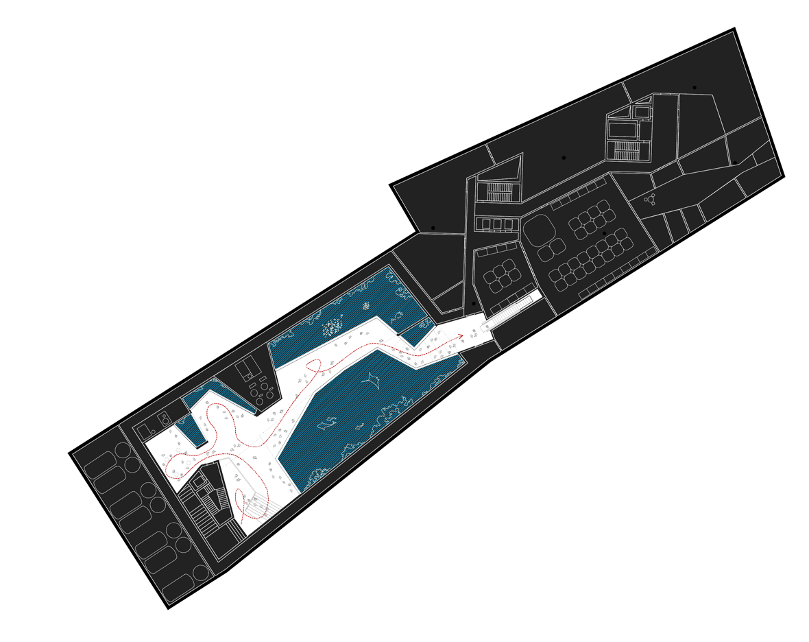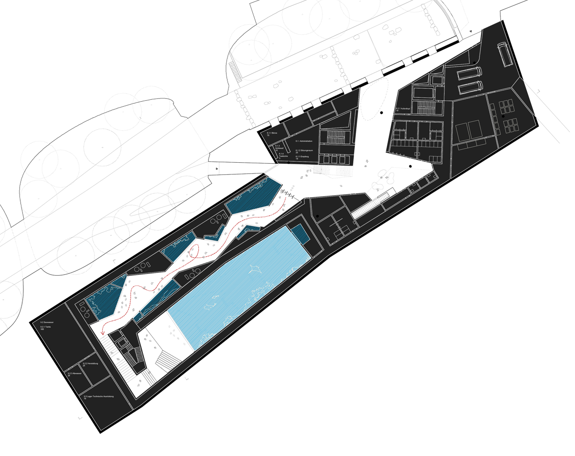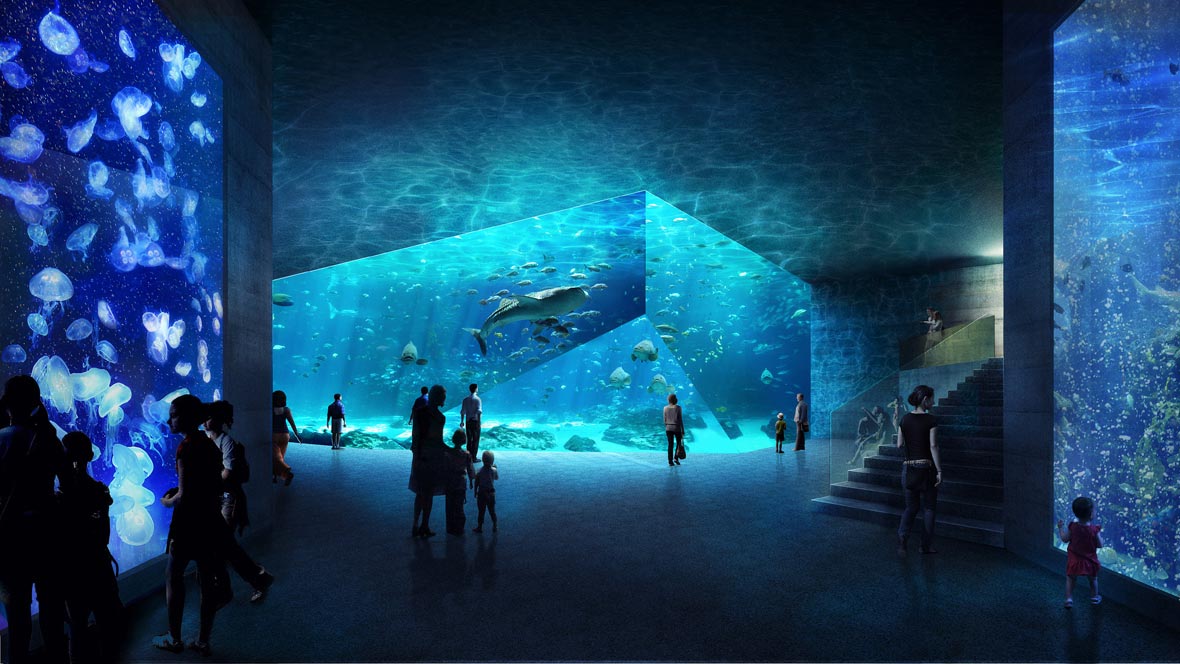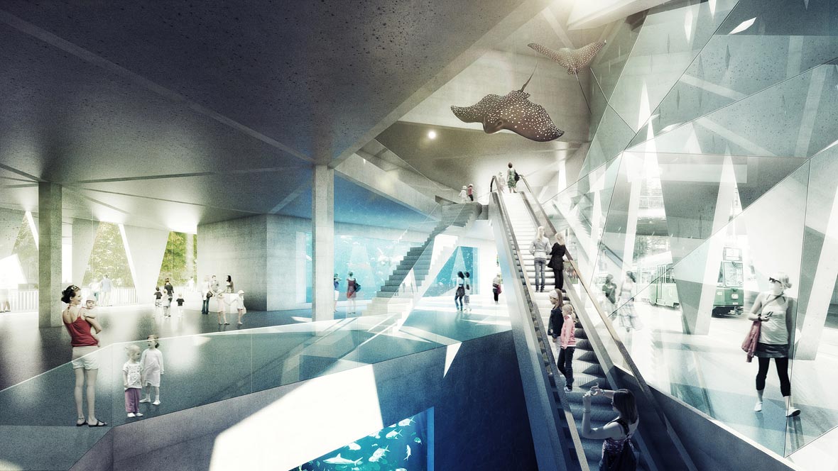 Wie ein Krustentier oder Molluske besetzt das neue Ozeanium die Heuwage. Es fügt sich in die Massstäblichkeit der Markthalle, dem Rialtobad und den umgebenden Hochhäuser der Steinenvorstadt ein. Wie die klassische Markthalle funktioniert das Ozeanium als grosse Struktur aufgefüllt mit diversen Funktionen. Die mehrgeschossige öffentliche Lobby dient als Kreuz- und Angelpunkt der ganzen Anlage. Sie vitalisiert diesen Ort über die Öffnungszeiten des Ozeanium hinaus. Im offenen Erdgeschoss ist das Ozeanium von allen Seiten zugänglich. Von diesem zentralen Stadtraum aus entscheidet der Besucher, ob er die Ausstellungsangebote des Ozeaniums beanspruchen will oder die Bar, den Shop, das Restaurant oder die Auditorien frequentieren will. Das Konzept der Meeresströmungen wird über differenzierte Besucherführungen räumlich umgesetzt und über die Urban Lobby und das Mangrovenfenster in das städtische Gefüge eingebettet. Die Konzeption der Besucherwege sieht einen geschlossenen Zyklus vor, der über eine raffiniert gestaltete Choreographie die Besucher immer wieder mit räumlich reichen Ereignissen konfrontiert.