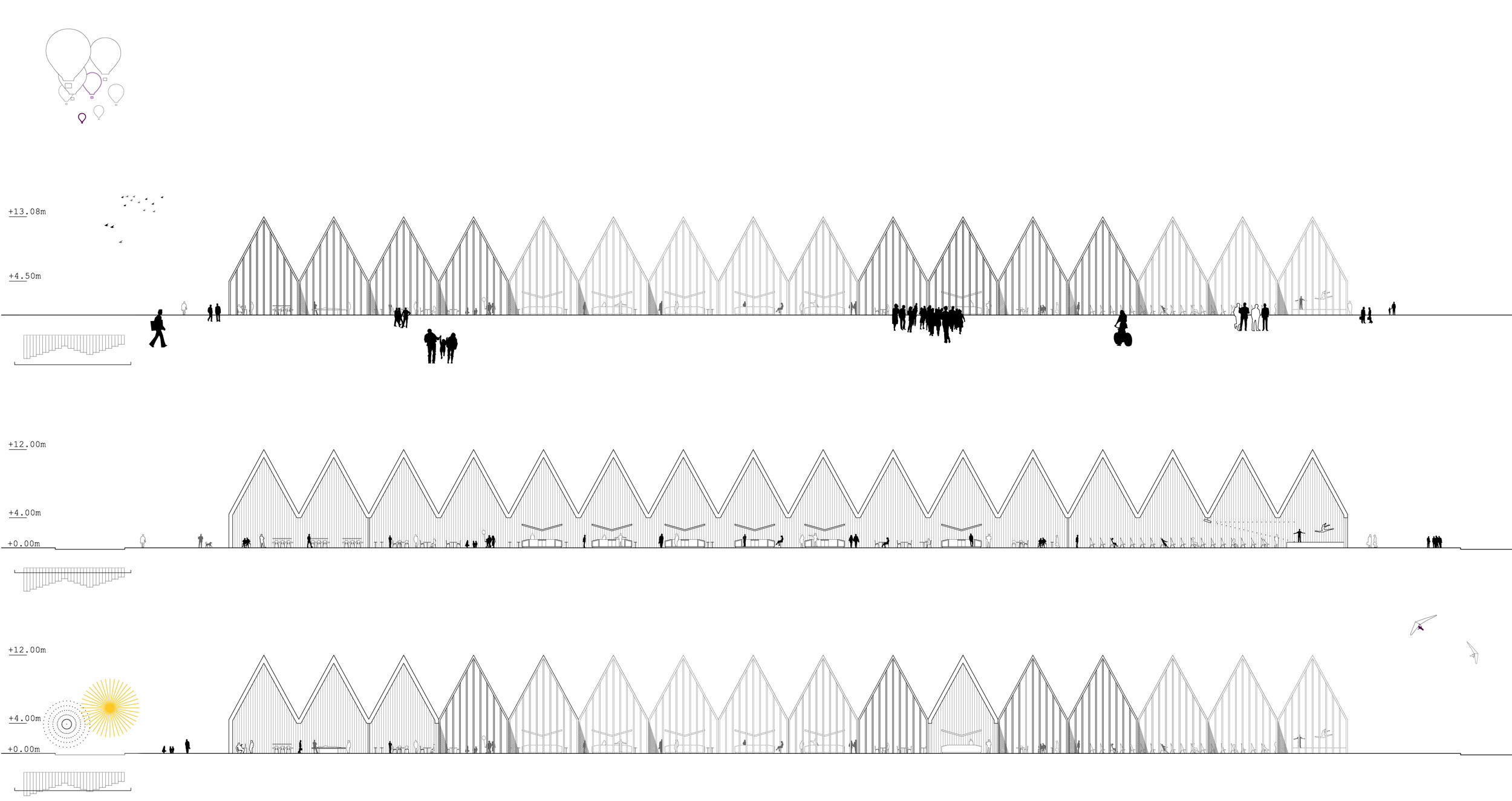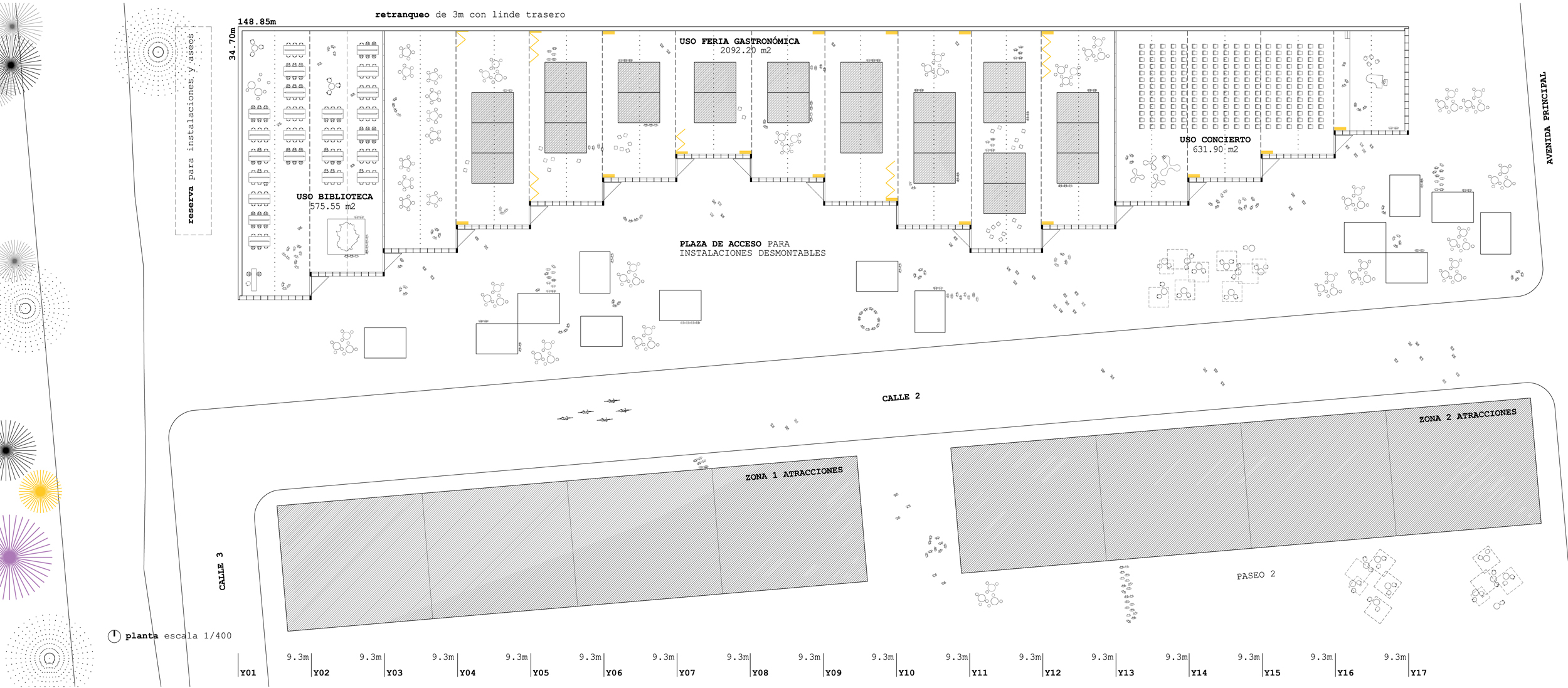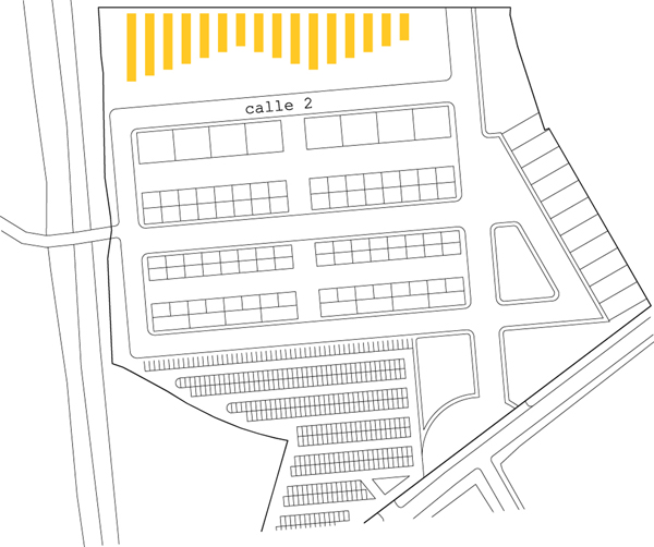 La ubicación de la parcela, al final del recinto ferial, genera dos fachadas claramente diferenciadas. Por un lado la fachada norte, que se retranquea 3 metros del linde trasero y se formaliza como una «fachada límite». Por otro lado la fachada sur, que se formaliza como una «fachada acordeón», que absorverá los accesos y todo el flujo peatonal de llegada desde el recinto ferial.