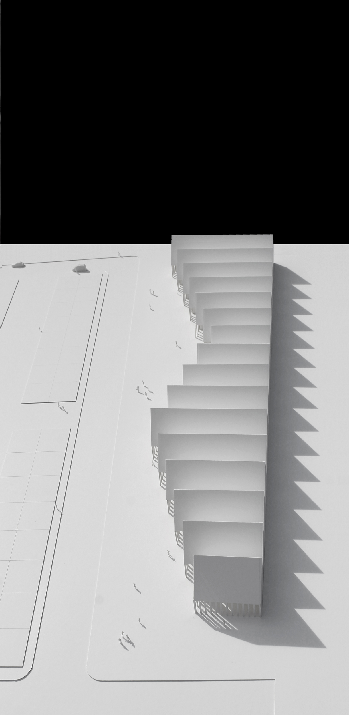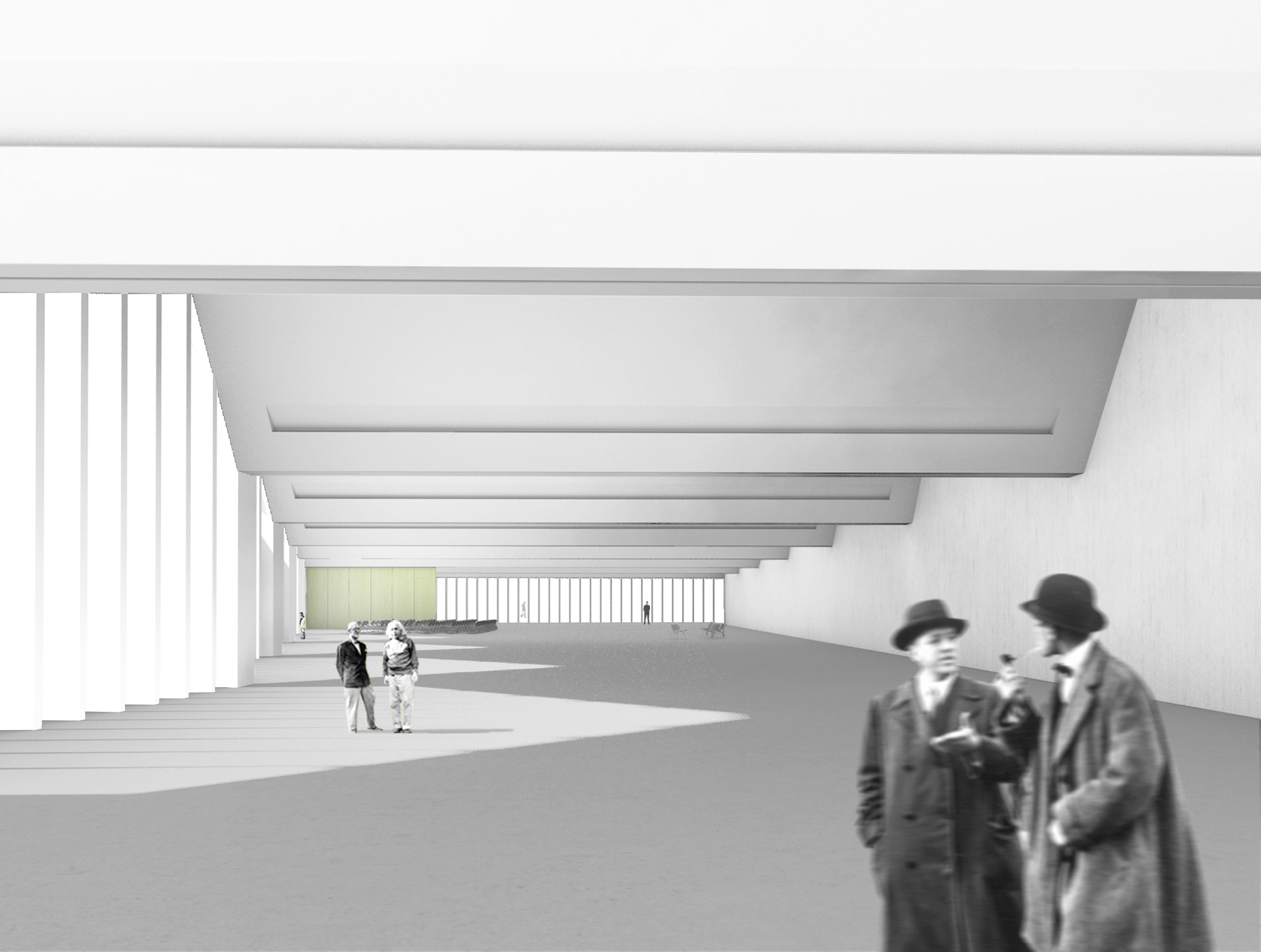 Vestíbulo urbano: la plaza. El movimiento de la fachada sur formaliza una plaza de acceso al edificio, un vestíbulo urbano que descongestiona el flujo peatonal, y posibilita ampliar programas al exterior con instalaciones temporales desmontables.