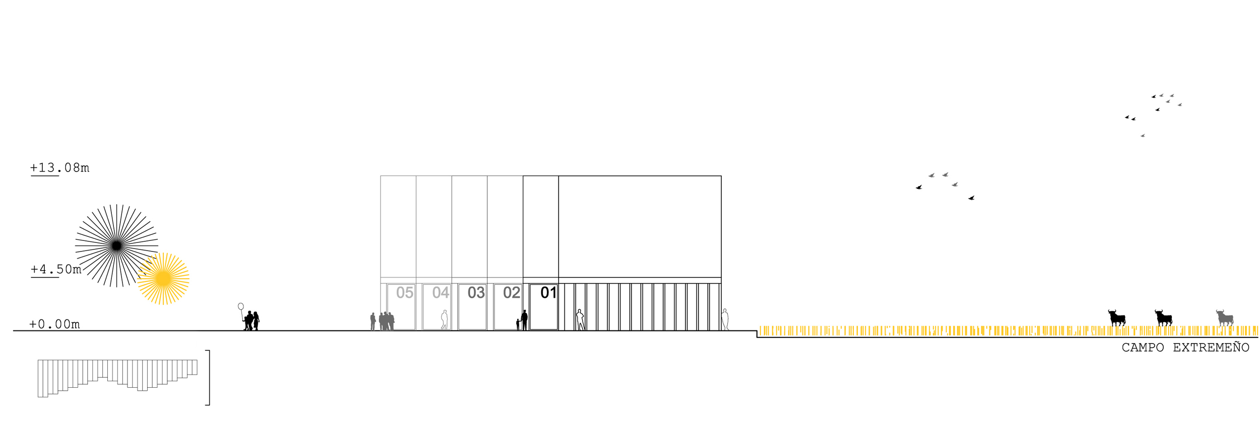 ☉ Pabellón multiusos is a proposal by Jorge Ruiz Boluda and Paul Dieterlen for Ayuntamiento de Villanueva de la Serena designed in 2013. It is located in Villanueva de la Serena Spain in an outskirt setting. Its scale is medium. Key material is metal. Concepts such as stripe sloped roof and flexibility are explored. Review the 2 proposals for the same competition.