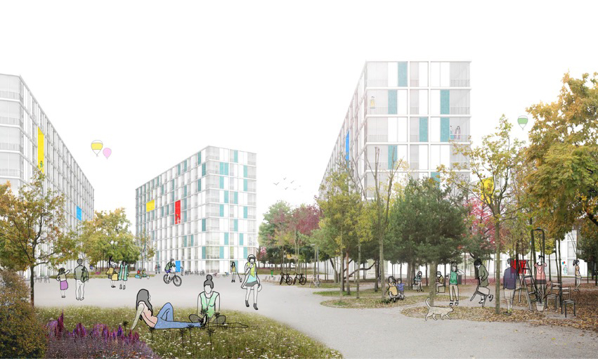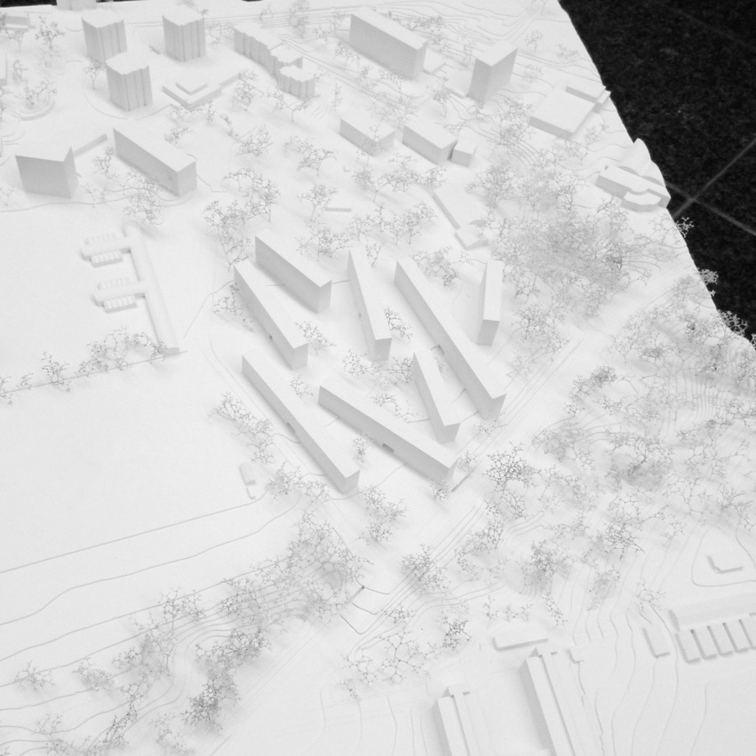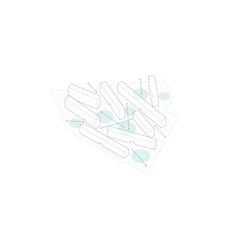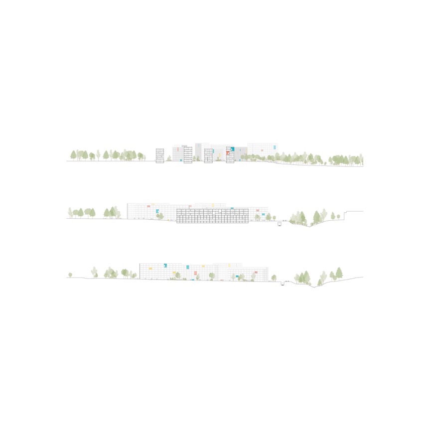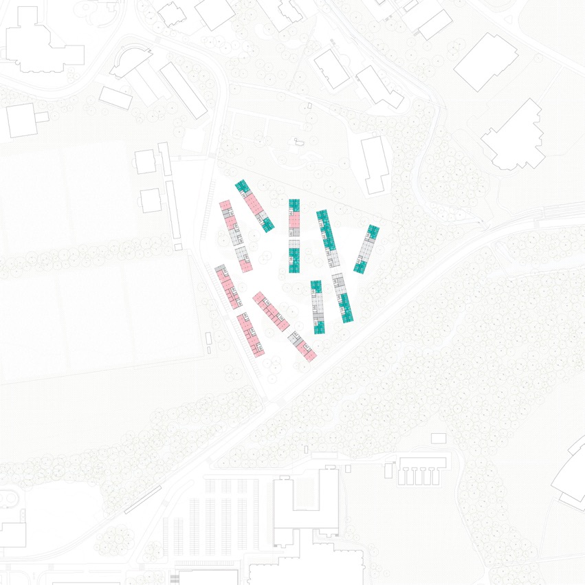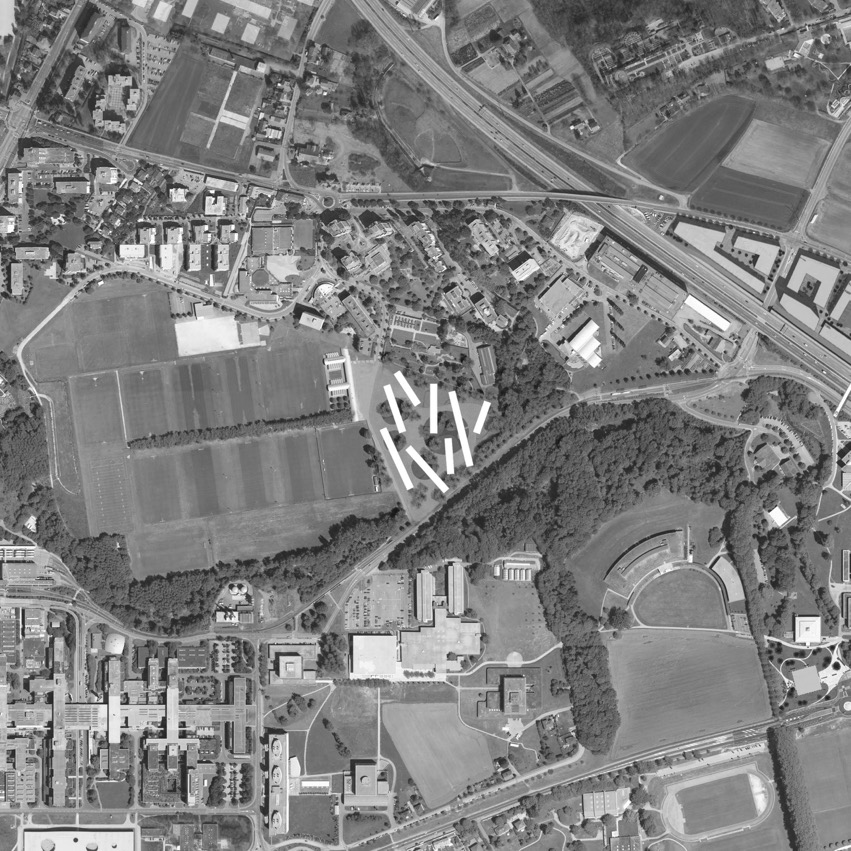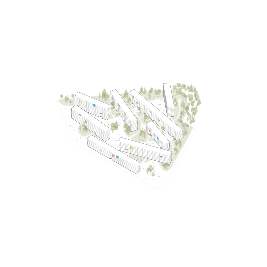 Le site choisi pour la conception du quartier de logements étudiants à La Pala est un véritable havre de verdure. Bordé de forêts et de terrains de sport, une inattendue impression de protection et de sérénité y règne, à la fois propice aux études et à l’émergence d’une véritable vie de quartier. Notre proposition accentue la présence de ce décor végétal afin qu’il devienne la qualité spécifique du nouveau quartier, un vaste parc agrémenté de bâtiments et de petites places, dans lequel la mobilité douce se développera naturellement. Cependant, la relation aux tissus urbains de Chavannes au Nord et du domaine des Hautes Écoles au Sud constitue la raison d’être de l’intervention. Notre proposition se veut donc en harmonie avec ces deux éléments. Les principaux accès se font par de généreuses places au Nord et au Sud. Les volumes projetés ont une échelle intermédiaire tout en assurant une identité propre au quartier. Ainsi, l’ensemble se veut être un « trait d’union » entre les Hautes Écoles et la commune de Chavannes : Une entité distincte donnant sens à une séquence urbaine. Plutôt que de concevoir des morphologies à cour ou fortement orientées, qui auraient créée une dichotomie nette entre espaces publics et privés, nous proposons un ensemble énergique et ouvert. Des volumes clairs dont la disposition engendre une grande variété d’espaces publics plus ou moins intimes. Cette diversité d’espaces communs est aussi enrichie de généreuses loggias et terrasses, ainsi que d’une multitude de programmes publics en rez-de-chaussée.