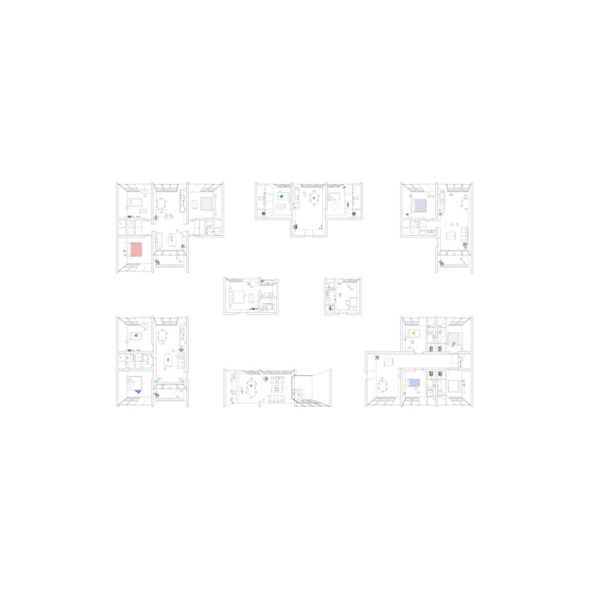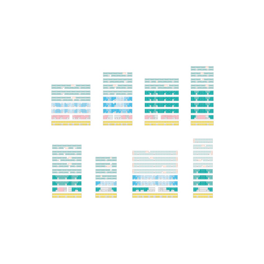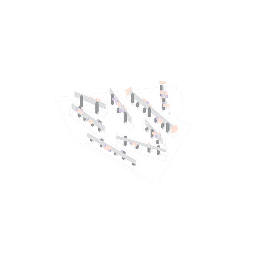 Le programme de logement est disposé de manière mixte dans les différents bâtiments, de manière à favoriser les échanges entre habitants. Tous ces éléments aspirent à être les fondements d’une vie de quartier dynamique à La Pala. Toutes les différentes typologies de logement développées ainsi que les programmes publics utilisent les mêmes principes structurels et constructifs. En conséquence, l’ensemble du projet se veut extrêmement rationnel et efficace du point de vue économique et énergétique. Ceci permet aussi d’envisager facilement d’adapter les bâtiments aux changements des besoins dans le futur. Les rez-de-chaussée des bâtiments comportent tous les programmes publics ainsi que les parkings à vélos sécurisés. Les différents types de logements occupent le reste des volumes. D’amples loggias, parfois à double hauteur, agrémentent les espaces communs des logements étudiants, contribuant ainsi à créer une forme de continuité des interactions sociales entre étages, en echo à la continuité des espaces communs extérieurs.