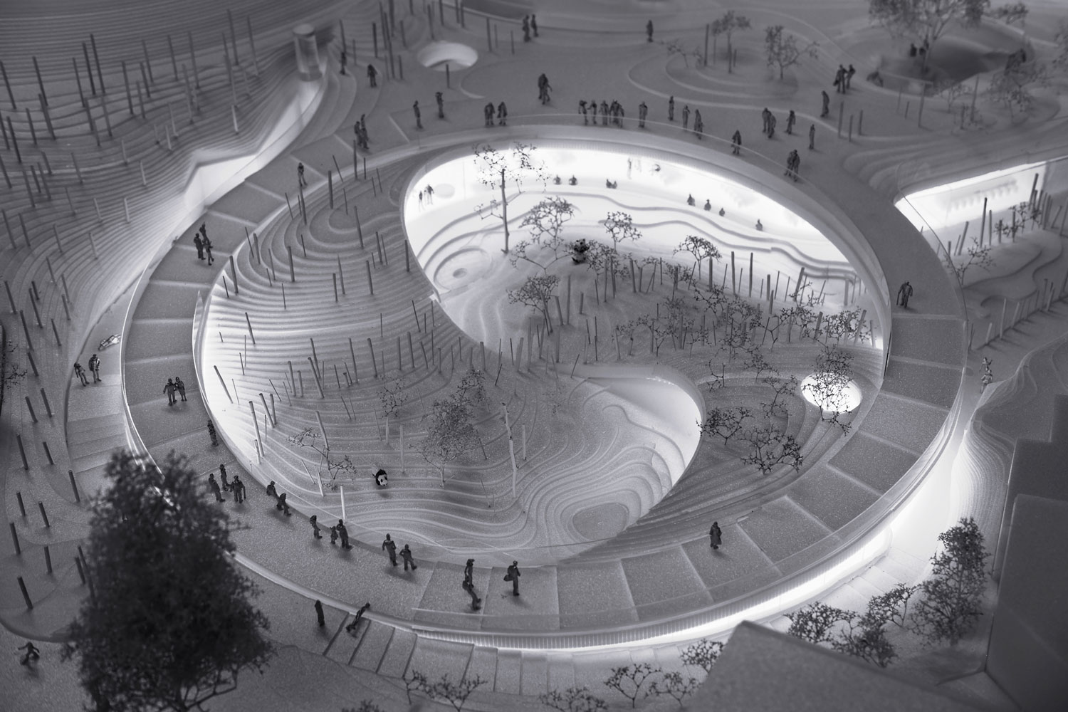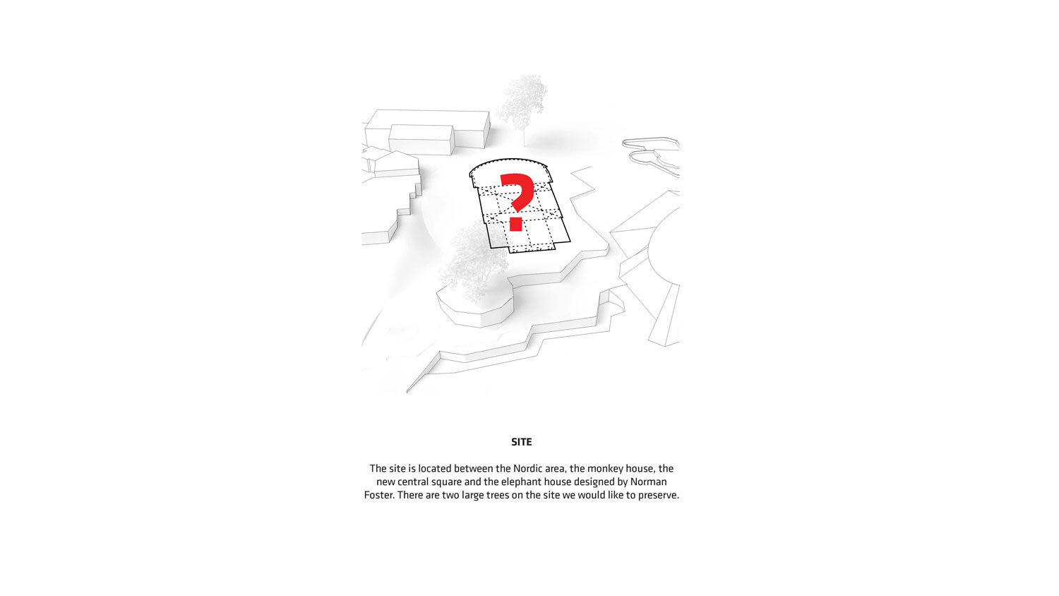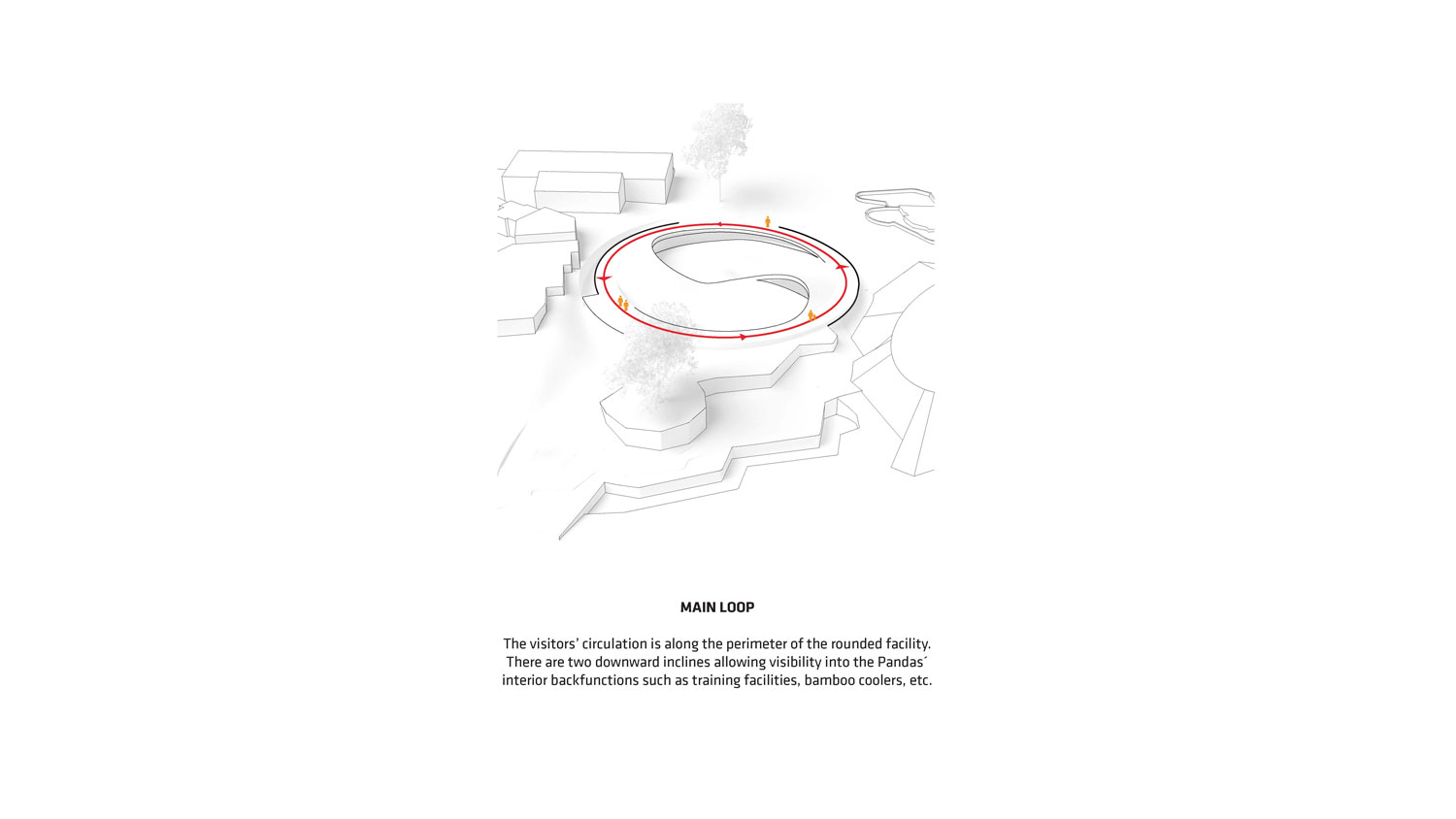 Panda House responds to the species’ main threats to extinction – habitat loss and fragmentation – by providing a safe and contiguous environment that’s also conducive for reproduction. We proposed a circular shape for the design – befitting the site perfectly between existing buildings and enabling the literal yin-yang symbol to create separate enclosures for male and female pandas. The architectural parts of the earth are then lifted from either side of the “yin” and “yang” to form space for stables below ground, simultaneously creating an incline to naturally face the pandas toward the audience. The Panda House consists of two floors: the ground floor, where access to the interior spaces are connected by a ramp circulation, and the second floor, which can lead to a trip along the rocky slope, through the native Nordic plants and into the dense bamboo forest. All interior functions are designed to have the lush landscape at eye-level – engaging the visitors’ sense of wildlife and immersion within nature. The ground floor of Panda House also encompasses a restaurant, located between the elephants and the pandas – visitors can dine while observing both animals simultaneously. There is also a shop connected between both animal houses and the Main Square, situated just outside of Panda House.