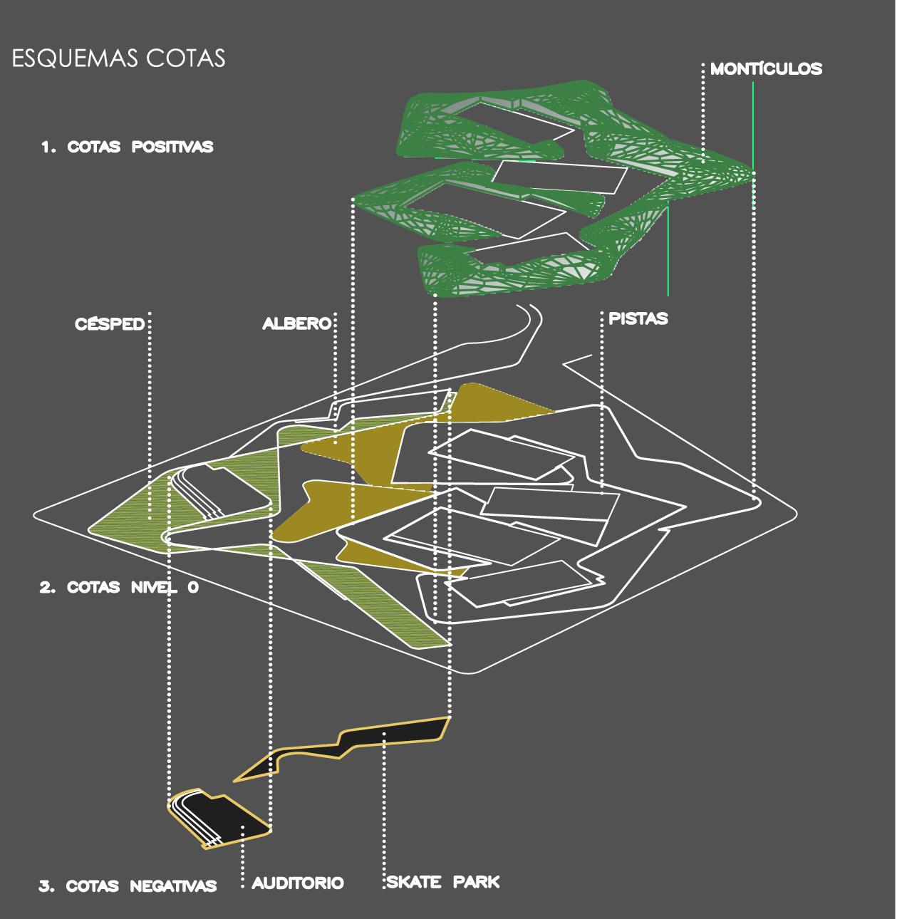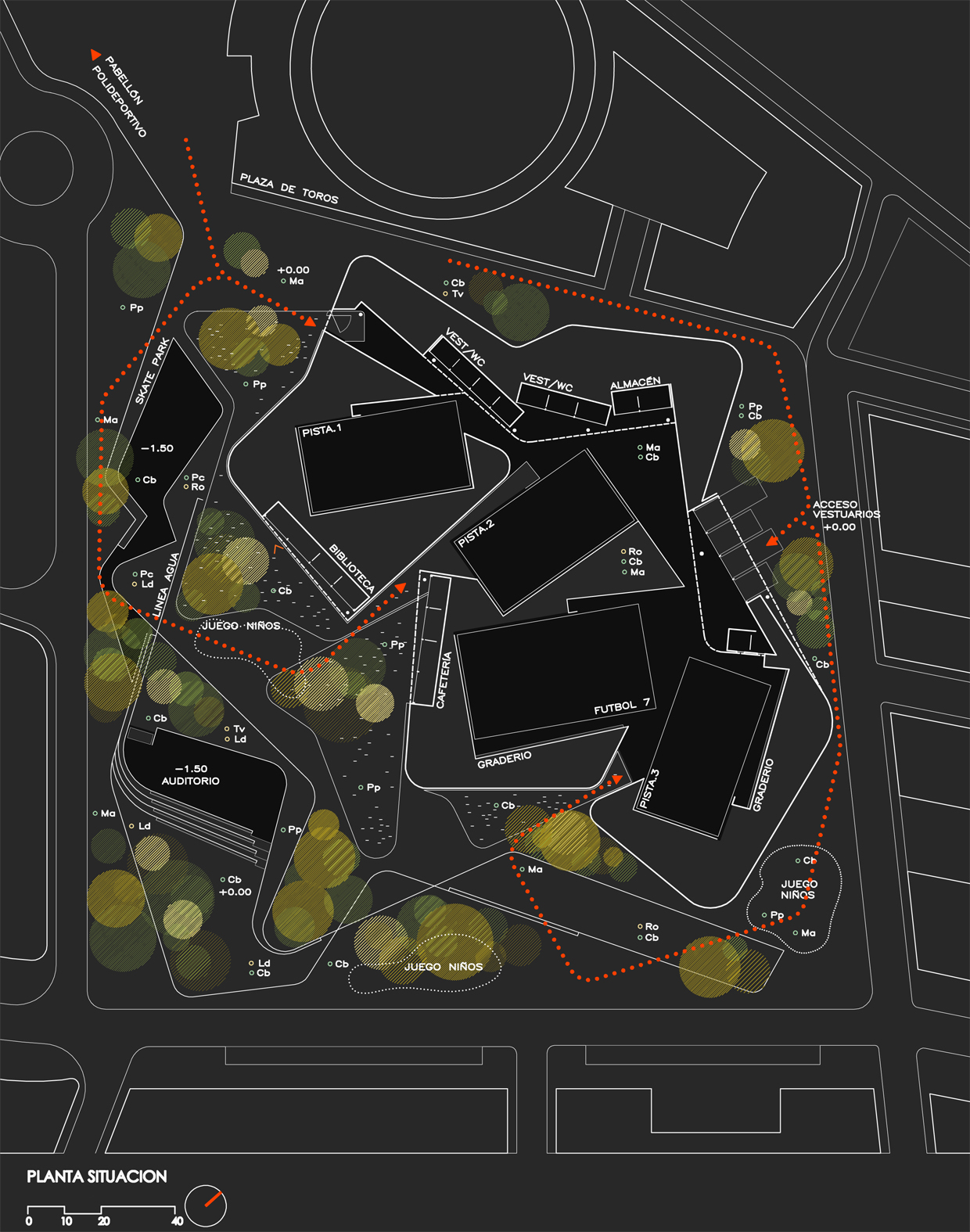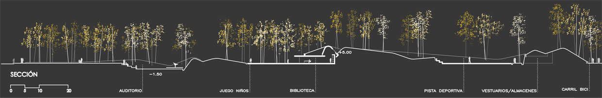 Un proyecto que imponga la misma trama geométrica para proseguir el “orden” establecido por la actual tipología de edificios, no resolverá de una manera fluida la relación entre los ciudadanos y los espacios públicos más relevantes de la población (Plaza de Toros, Polideportivo y parque de “los Bajos”. Esta condición particular del paisaje urbano en la zona de “Los Bajos” generarán los criterios para construir nuestra propuesta. Pretendemos instaurar un nuevo elemento orgánico para así recuperar el efecto de “lo natural” de un paisaje perdido por la invasión de la retícula de invernaderos. Además este nuevo y generoso espacio funcionará como un hilván entre el polideportivo y la plaza de toros y las parte oeste del pueblo (hacia la playa) y otorgará a la zona un nuevo carácter de polo elemento atractor de la gente de Roquetas de Mar a la zona norte del pueblo.