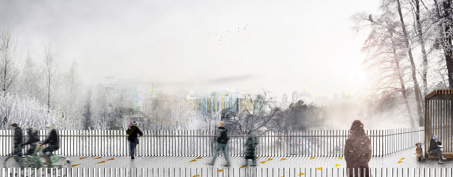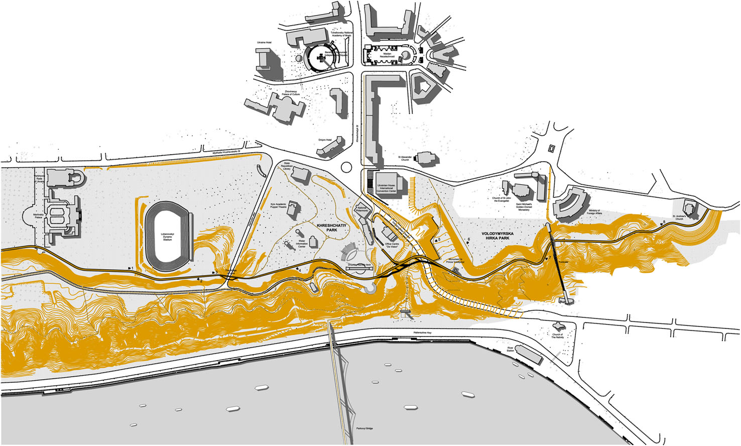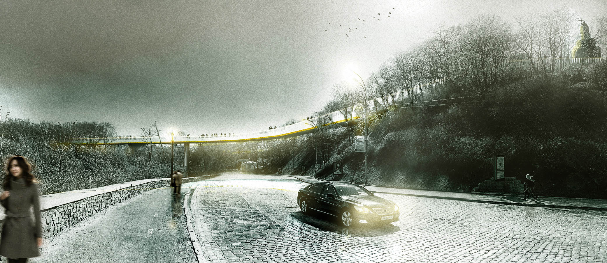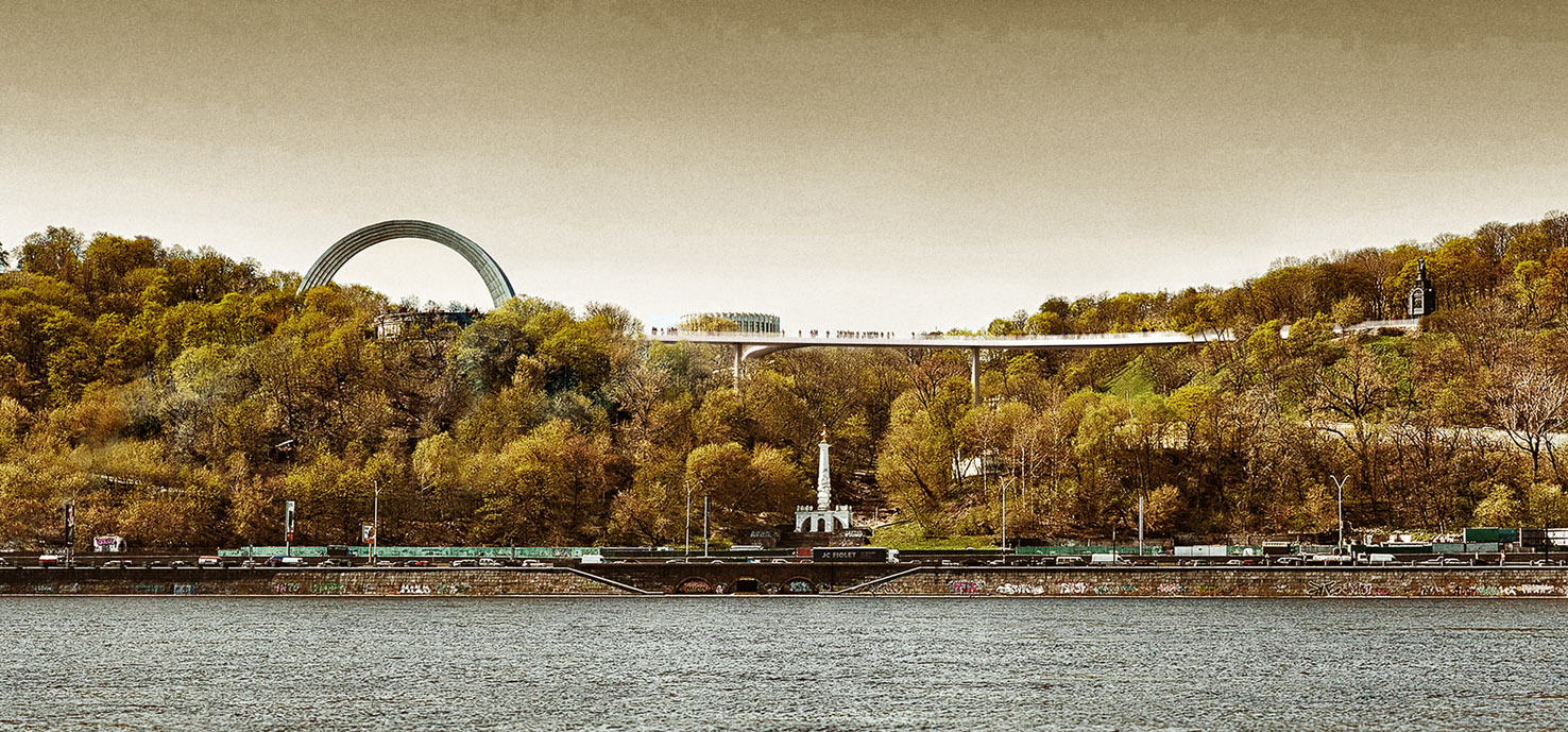 The main purpose of a bridge is connection, making possible the union between two sites where topography and natural elements make it difficult or impossible. Moreover, in our case, this connection improves the existing itinerary of «Kraika main tourist route». There is no need to write much about the virtues of the existing trail and the spectacular views on the Dnieper riverside, but it should be pointed out how this new footbridge for pedestrians and cyclists improves the sequence of paths along the existing Kraika route. Its proximity to the Historical Center of Kyiv provides the bridge the possibility of having a balcony above the most recognizing skyline of the city. The union between the parks of «Khreschatiy» and «Volodymyrska Hirka» and between the two districts of the city is especially relevant, due to the uniqueness of the place where it is located. The new bridge has the potential to offer a new attractive route that would connect other existing paths. Its proximity to the Historical Center of Kyiv provides the bridge the possibility of having a balcony above the most recognizing skyline of the city.