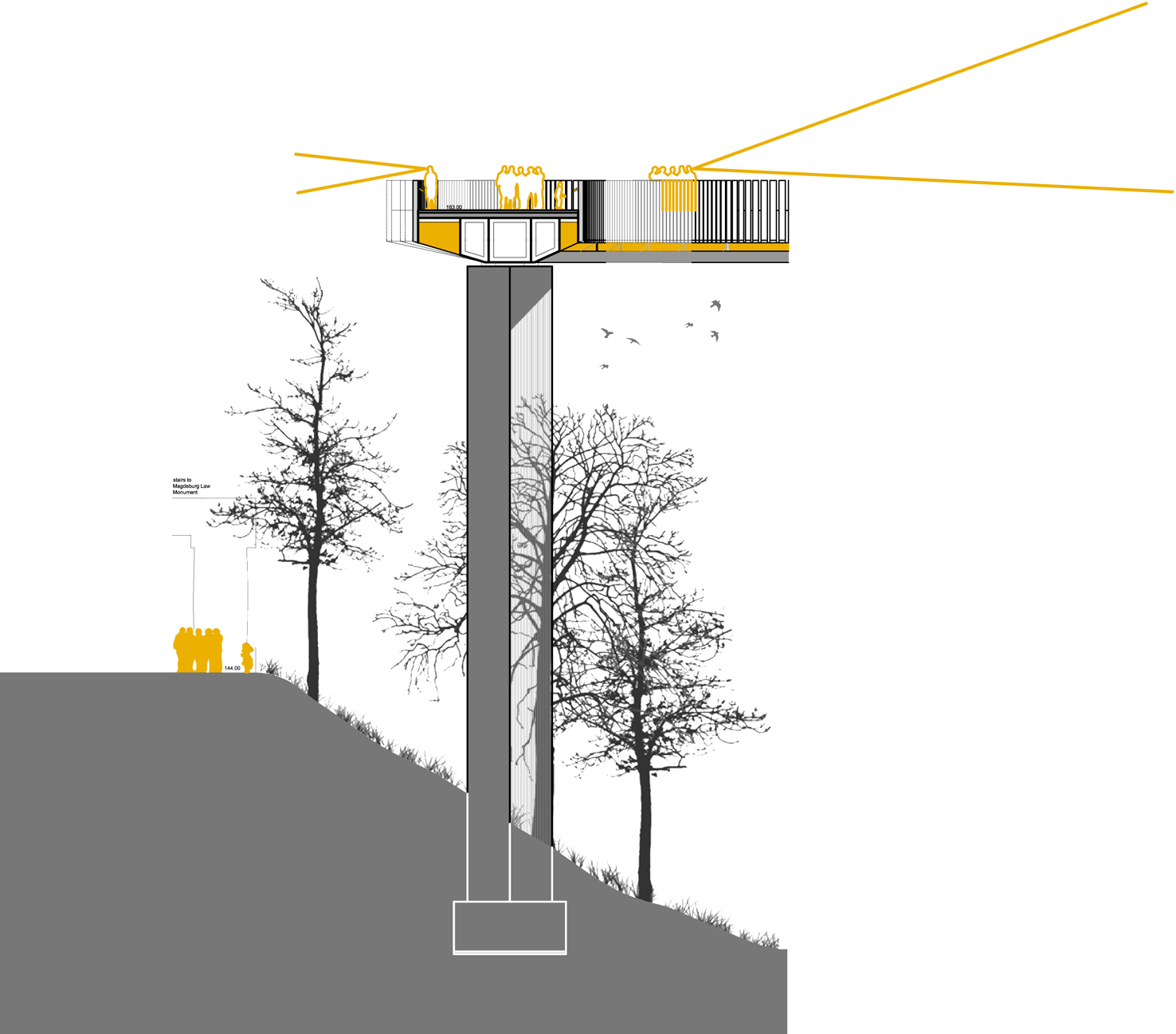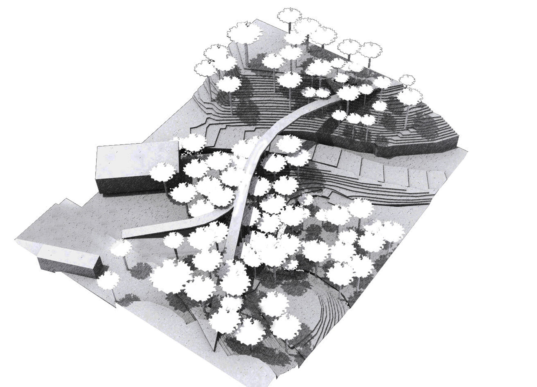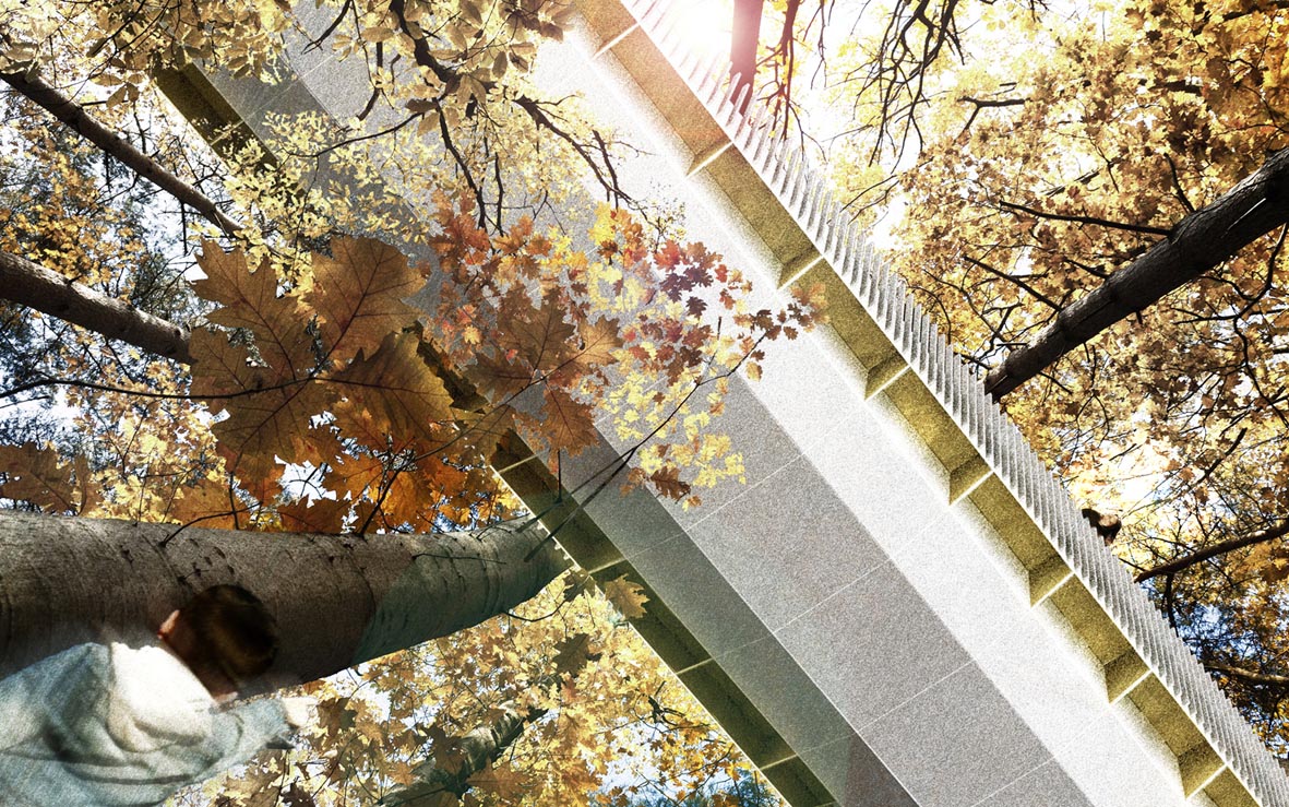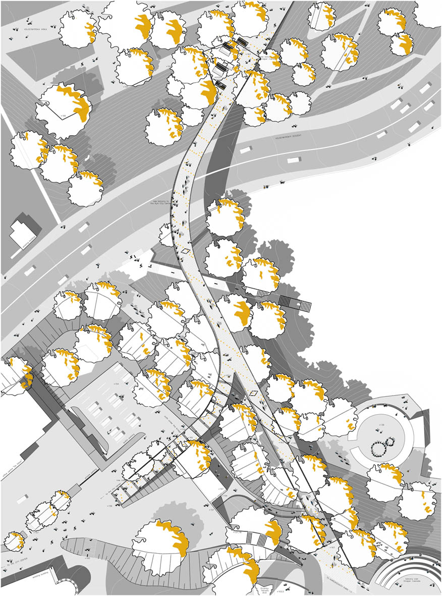The bridge is drawn with a curvy geometry and increases its width at the central point, bringing the people closer to the city and providing spectacular views to the main city landmarks such as the Ukrainian House, the Maidan Nezalezhnosti or the Golden Dome Church. The project plan aims a geometric integration and connection with the existing site sections. There is also a concern to offer a clear and a simple geometry to accentuate the image of the existing monuments. The increase of the width at the central point of the footbridge and its curvy geometry brings closer the people to the city and provides spectacular views. Around the area of Druzhby Narodiv Arch the intervention tries to reach a minimal impact to maintain the configuration of the site. On the other side, close to the Monument of Prince Volodymyr, the footbridge widens offering a new space before the arrival to the mainland. In this perforated platform, crossed by existing trees, some benches are placed to stay with the possibility to locate some outdoor commercial activity.
