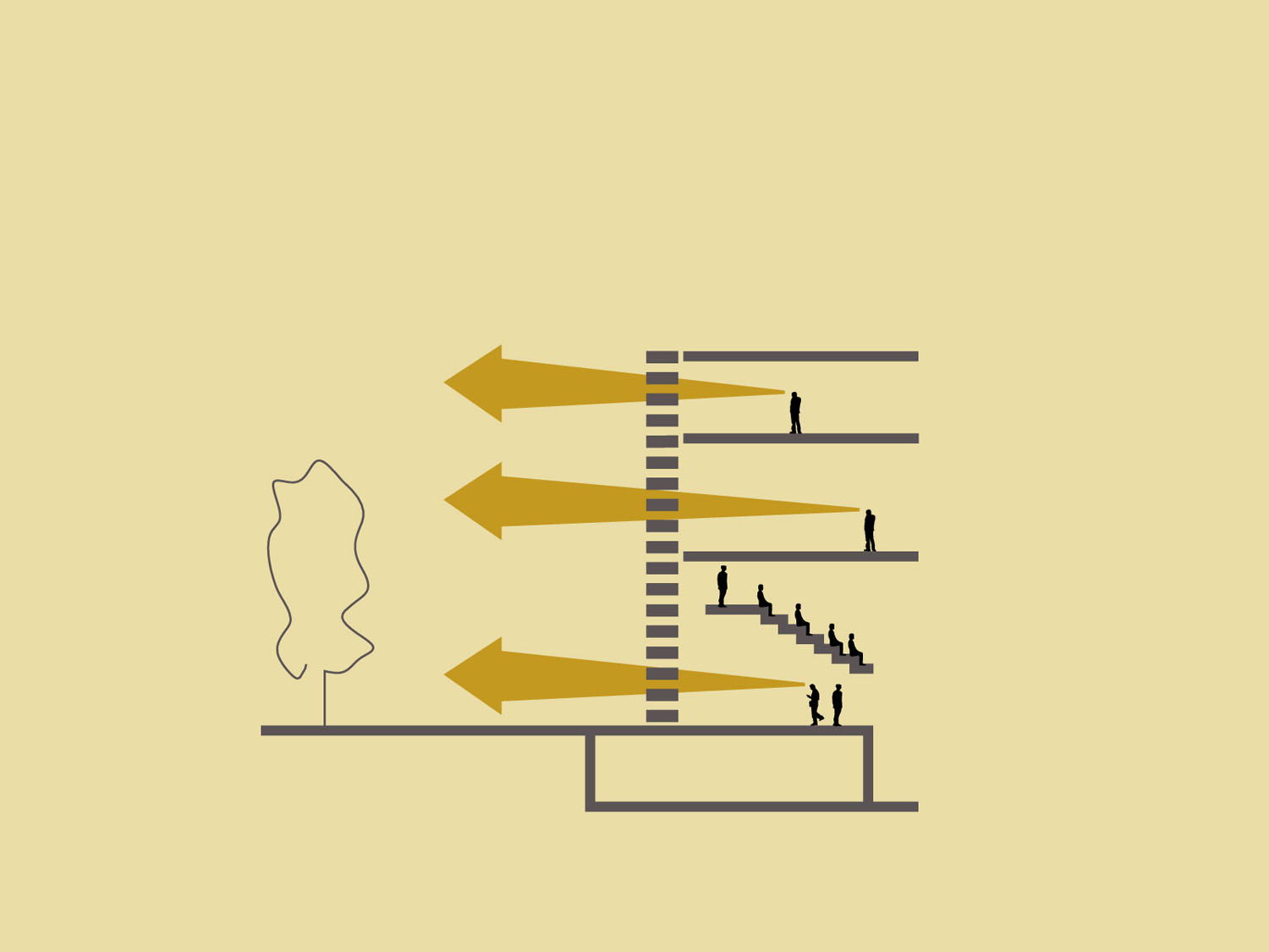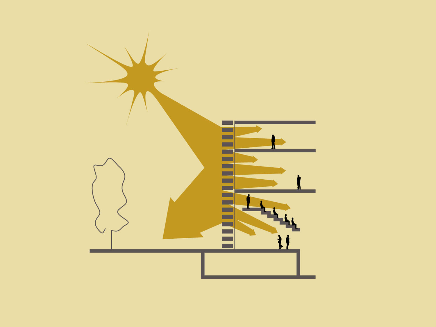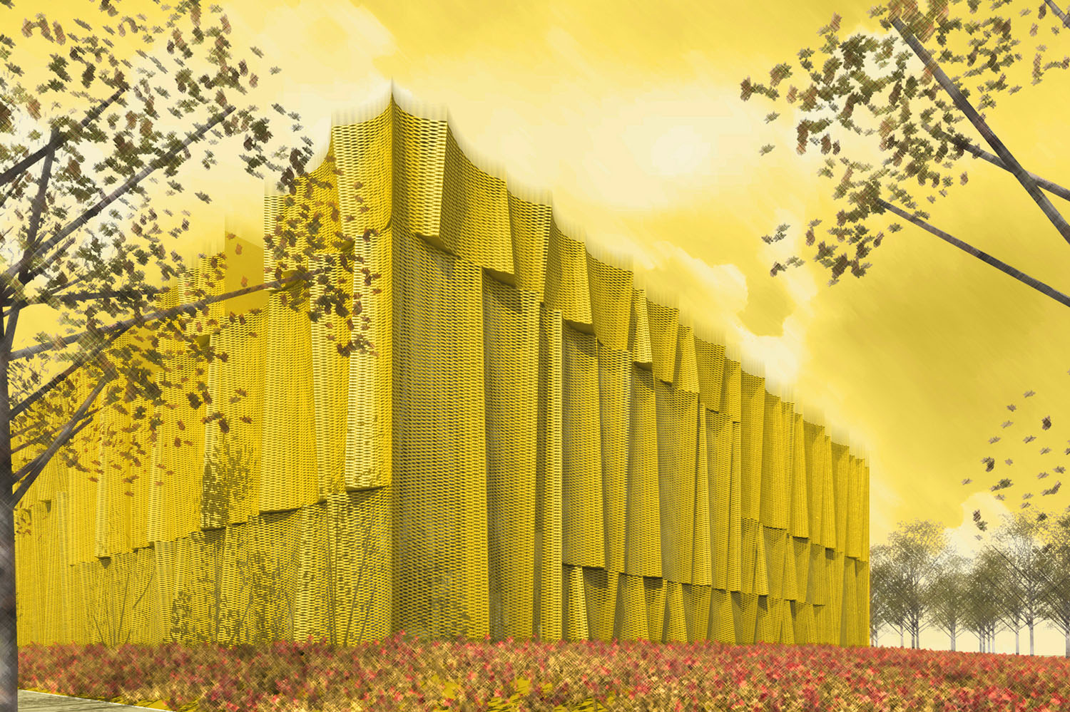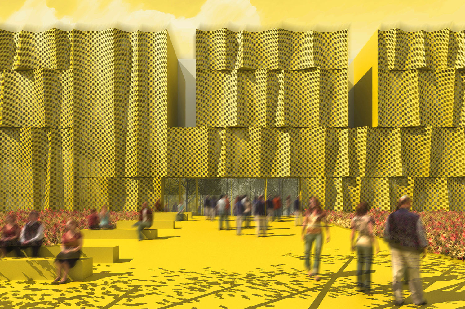 The building is clad in a varied facade membrane made of expanded sheet metal painted in strong colours. The seemingly complex but technologically simple facade wrapping entwined with an intense interplay of light and shadows gives the building a recognisable and lightweight expression and suits the character of the content that it houses. An additional function of the expanded sheet metal is protection from the sun while at the same time; the fine structure does not obstruct the views of the building’s users towards the exterior. The layout of the exterior is designed as a continuation of the emphatic expression of the building. The platform in front of the building finished in strong colours is a direct continuation of the branched communication of the interior and functions as an entry square connecting the building with the park. The remainder of the plot around the building is planted with coniferous extensive shrubbery whose appearance changes throughout the year.