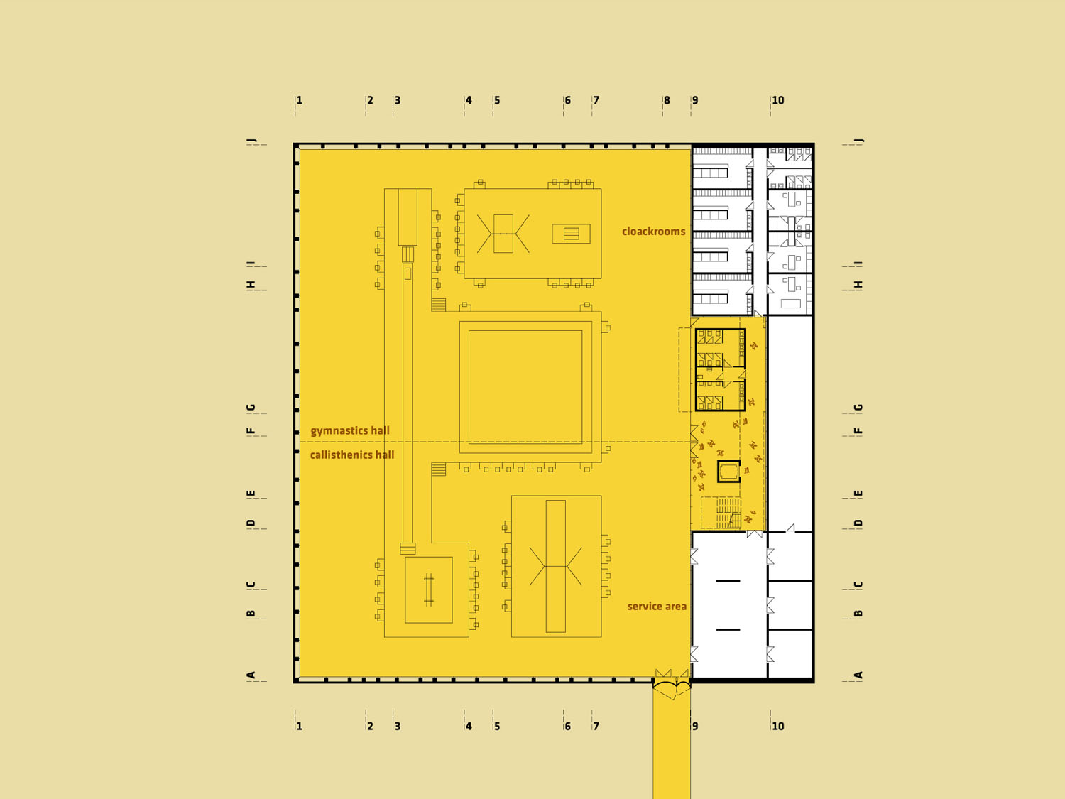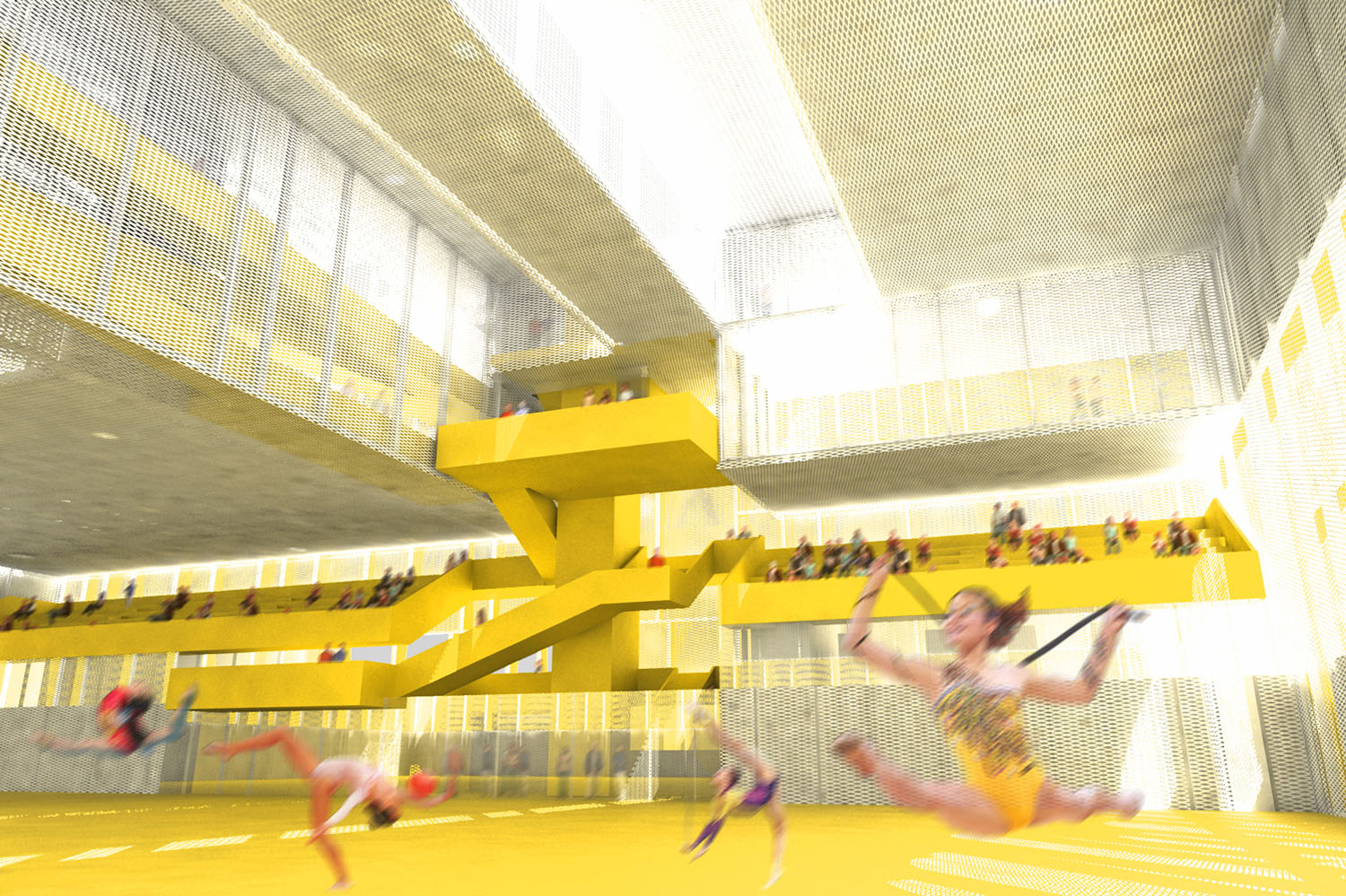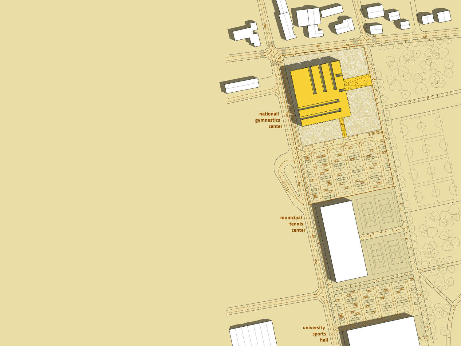 The National Gymnastics Centre Pegan Petkovšek is part of the comprehensive renovation of Svoboda Sports Park in Ljubljana. It is the first of the three sports halls that are to be built on the western edge of a belt between an access street on one side and a large greened park layout with sports grounds on the other. The building of the gymnastics centre is placed on the northernmost part of this belt. The northern and western edge of the building reference the building line regulated by the spatial acts, which also stipulate the greatest built ratio and the height of the building. The strict urbanistic regulations necessitate a very compact design that allows for little deviation. The proposed spatial design with its predetermined compact volumes of sports halls divides the belt into three clearly defined sections intended for the halls, which are separated from one another by parking spaces. Going somewhat against the urban design specifying the placement of vehicle and pedestrian building access points from all perimeter streets in alternation, traffic access is organised from Koprska Street in the west while the pedestrian accesses are clearly separated and arranged from the park side in the east. Immediately next to the buildings, the park features a wide central footpath with connections to all access platforms of the halls.