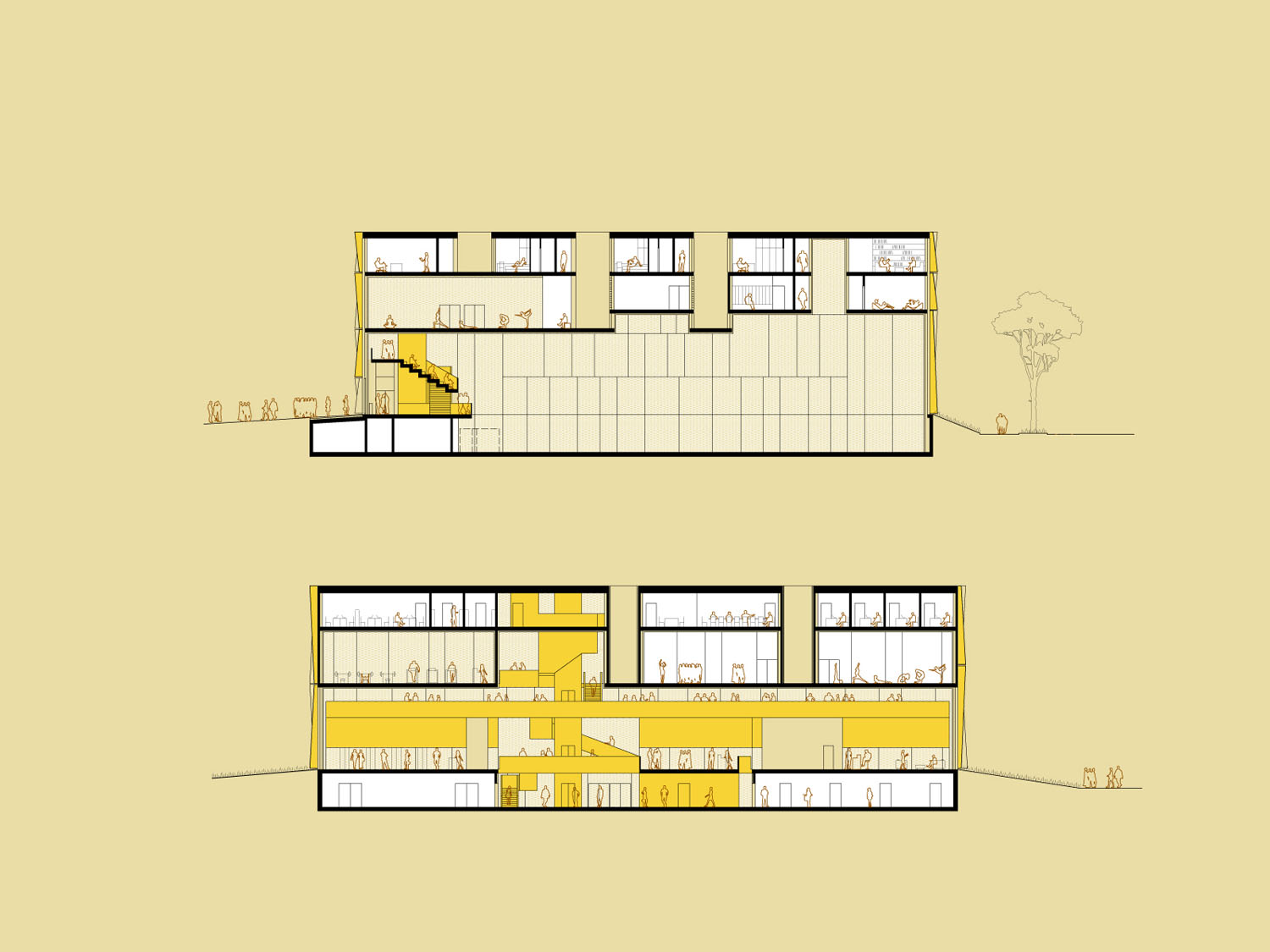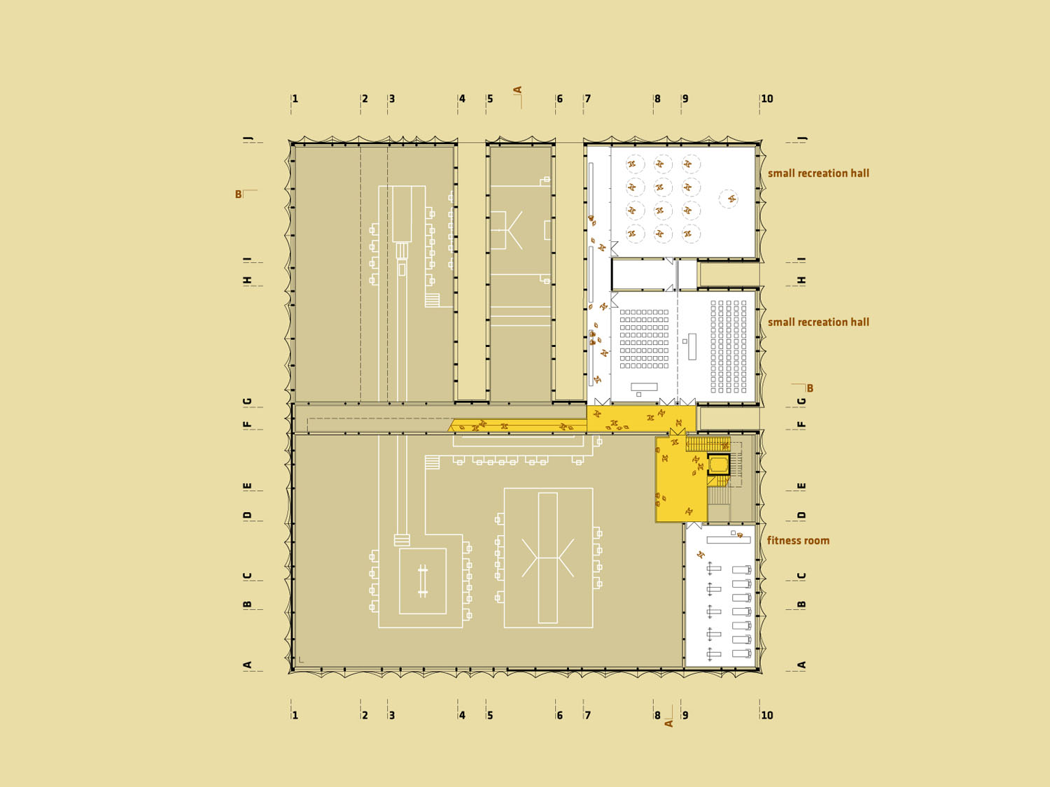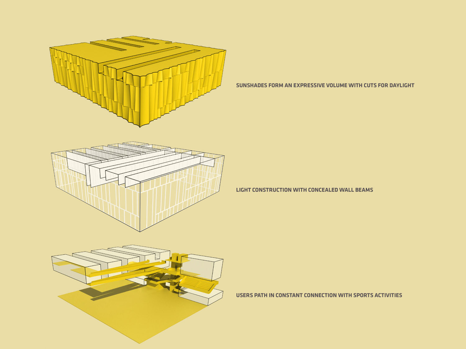 The building of the Gymnastics Centre is designed as a compact volume housing two larger halls, one considerably lower than the other, placed next to each other. The rest of the stipulated programme is placed along the eastern side bordering on the park, and into the space above the lower of the two halls. The perimeter walls are designed as a light steel construction allows ample light to pass through. The walls of the programmes placed above the halls are of similar design. On the roof, the linear design of the programmes allows their perimeter walls to be used as wall beams with large static height; as a result, no additional construction is needed to bridge the relatively large span of the hall. The cantilevered wall beams above the halls enable the installation of linear roof skylights. They provide even lightning to the central sport surfaces, which – due to the depth of the building – would not be possible by using the facade surfaces alone. The entire sport surface is thus evenly lit.