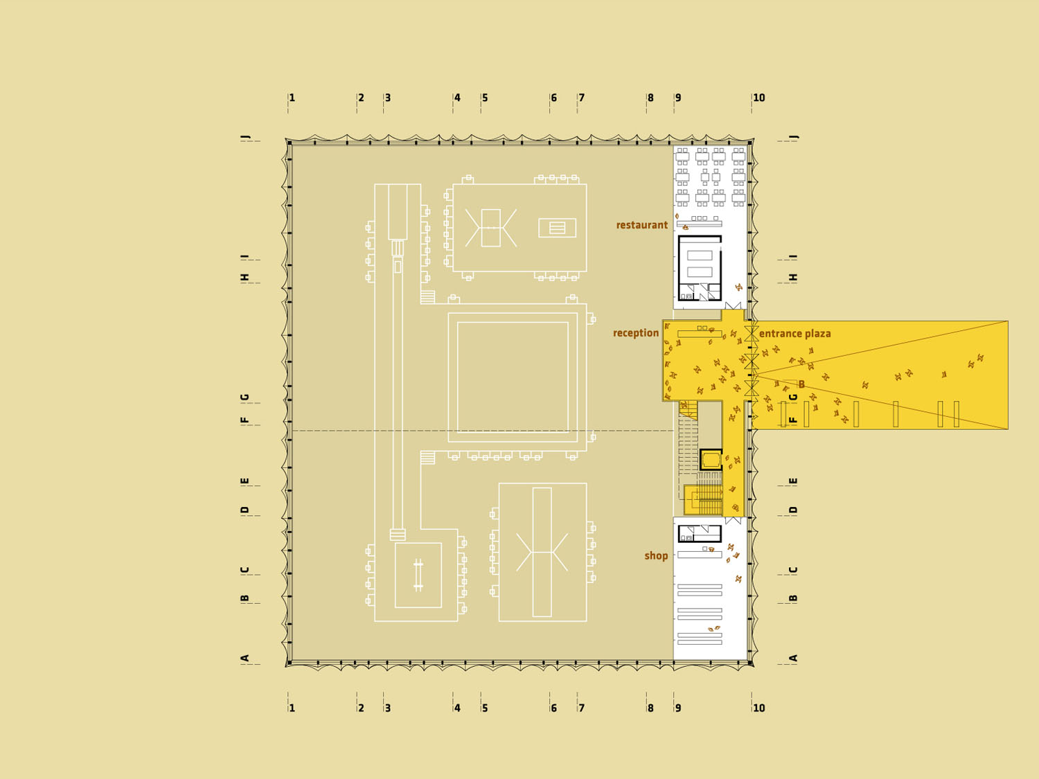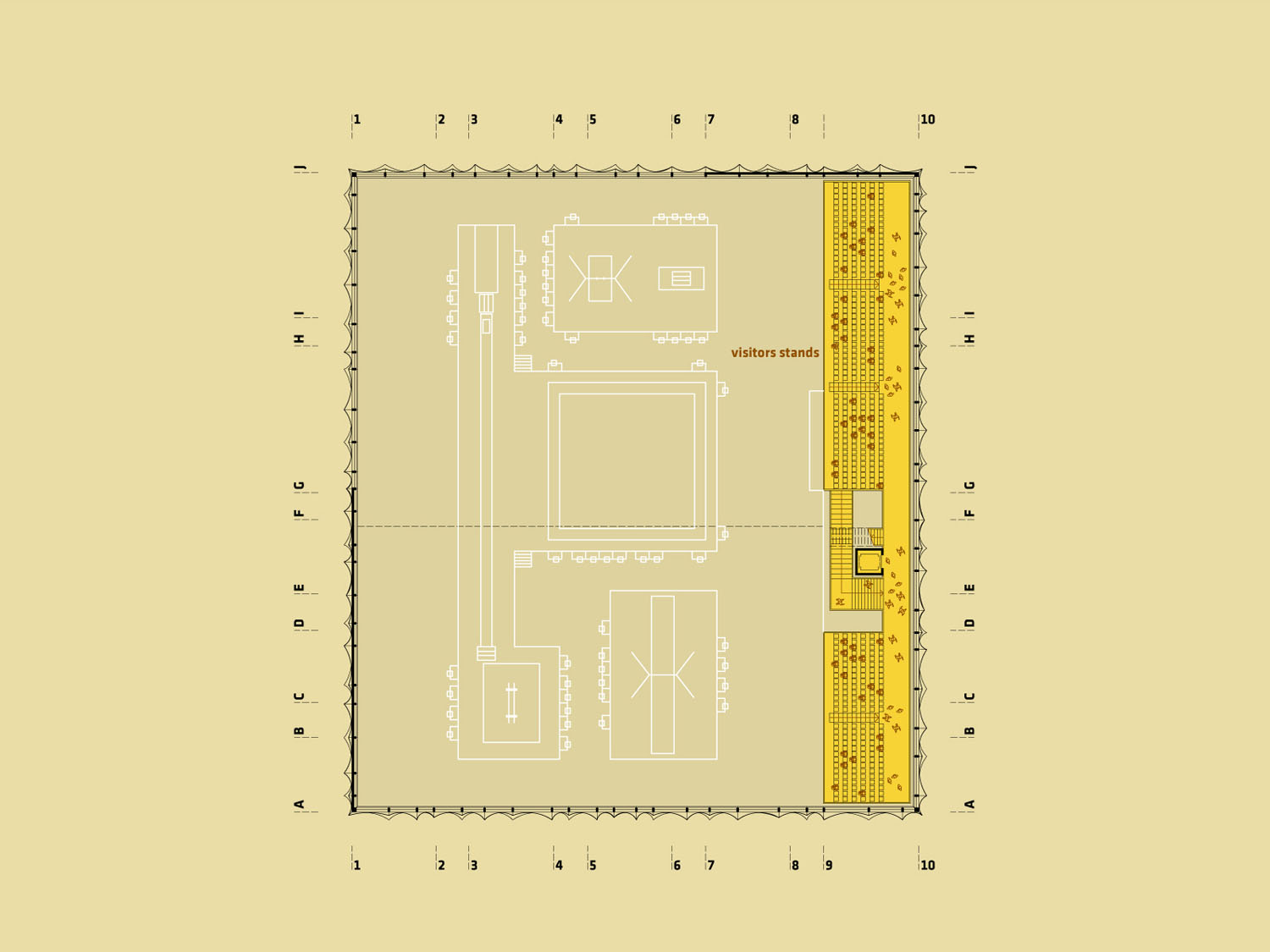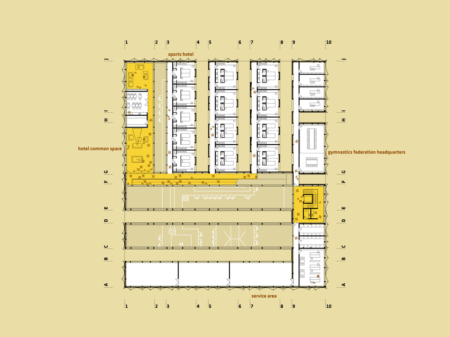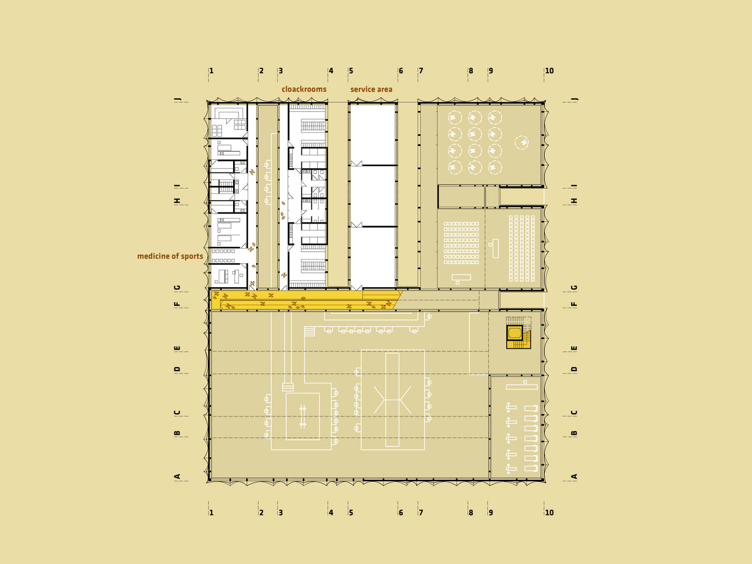 The National Gymnastics Centre is designed primarily as a daily training facility where athletes will spend a lot of time. The central guideline was thus to design a building with plenty of natural light which would appeal to its users and inspire in them a feeling of direct connection with sport at all times. The key element of the functional design is a branching central communication linking all the programmes so as to provide uninterrupted views onto the training grounds. The views on sport stay with the users not only along the primary communication but also from the offices, the shared spaces of the sports hotel, the shop, the restaurant, and other spaces. With its branching shape and recognisable colour, the central communication is also the main styling element of the interior; in fact, it actually continuously extends from the exterior since the entry platform in front of the building also features as its constituent part. Similarly, the communication extends onto the stands; along with various other well-placed expansions, the stands – beside their primary function – also allow the training surfaces to be increased.