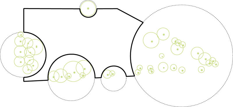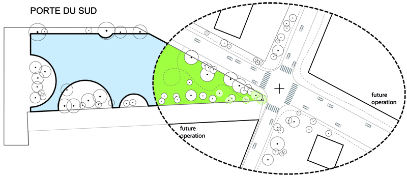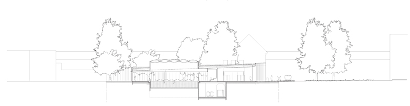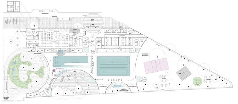 Hors de tout référent typologique, la piscine s’inscrit sur une emprise plane incluse entre une place, une école, des surfaces engazonnées, des bâtiments voisins, et des arbres, beaucoup d’arbres, en continuité parfaite avec les sols qui l’entourent, délimitée par le tracé de grands cercles que nous avons voulu protecteurs autour d’un végétal qui nous précède. Le «construit» découle ainsi d’un travail équilibré avec une organisation paysagère préalable. Les arbres sont là, ils organisent le site ; nous les conservons tous et développons le projet autour de ce capital végétal, avec la conviction que l’eau, les bassins doivent s’insérer avec fluidité dans ce paysage préexistant avec lequel nous nous devons de travailler.